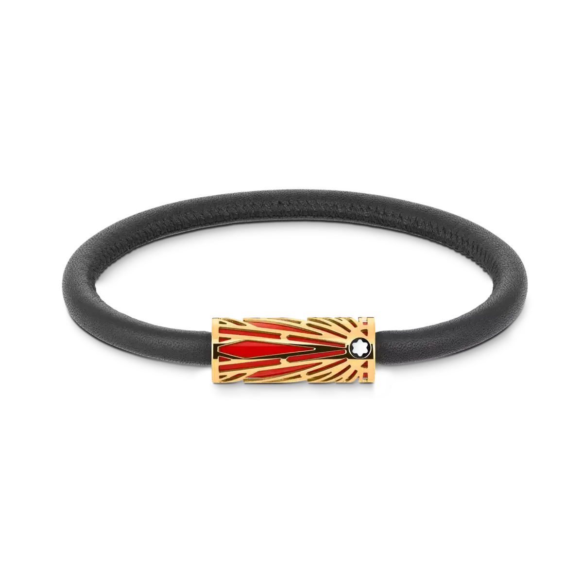 The piece of jewellery has a black leather bracelet and a tube in stainess steel with PVD coating and coral lacquer (size 63). It is inspired by the archive Solitaire pattern.