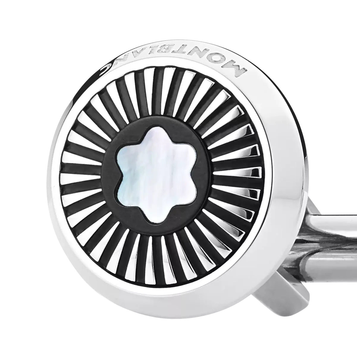 The round Montblanc Star cufflinks in stainless steel with ray pattern and mother-of-pearl snowcap emblem are inspired by the codes of the Maison. A collection that features the Montblanc emblem in different interpretations.