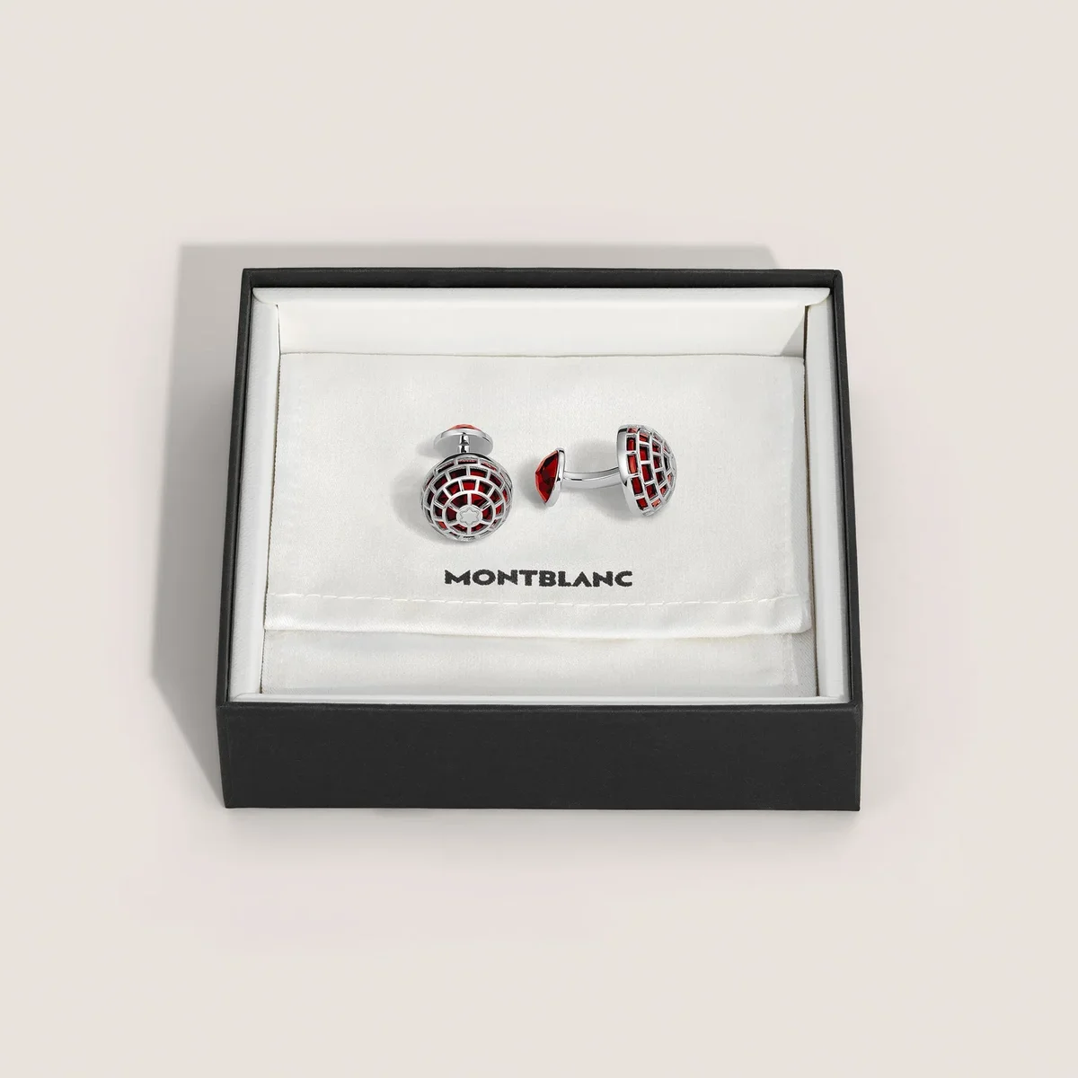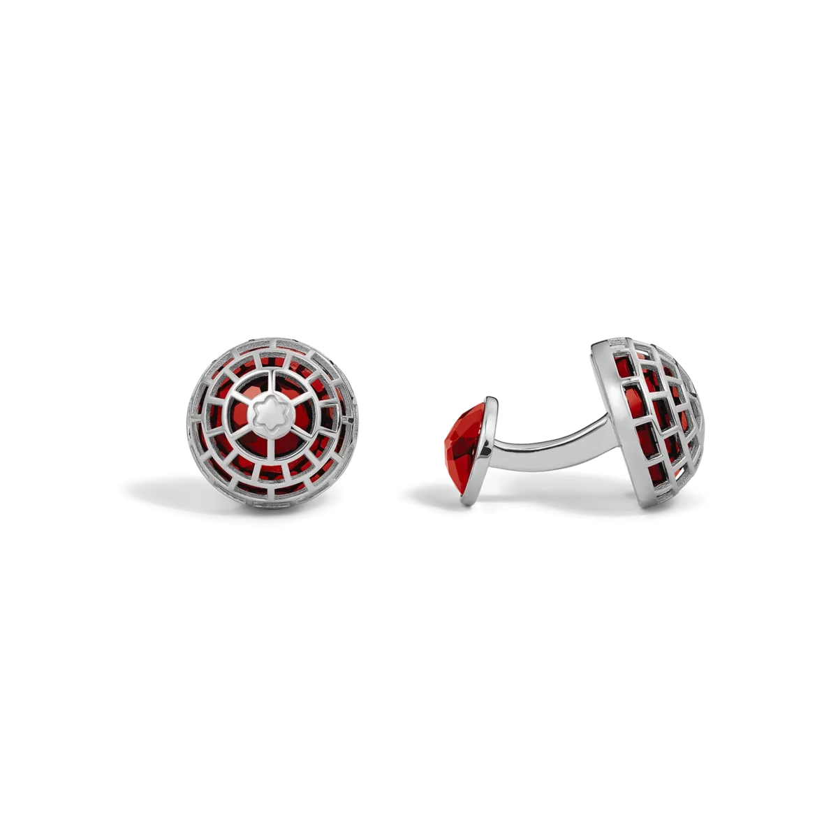 These Montblanc Meisterstück Cufflinks are made of Silver with a Red Jasper stone enclosed in a contemporary dome shape and complemented by the engraved iconic Montblanc emblem. The back section of the piece is also decorated with a Red Jasper stone.
