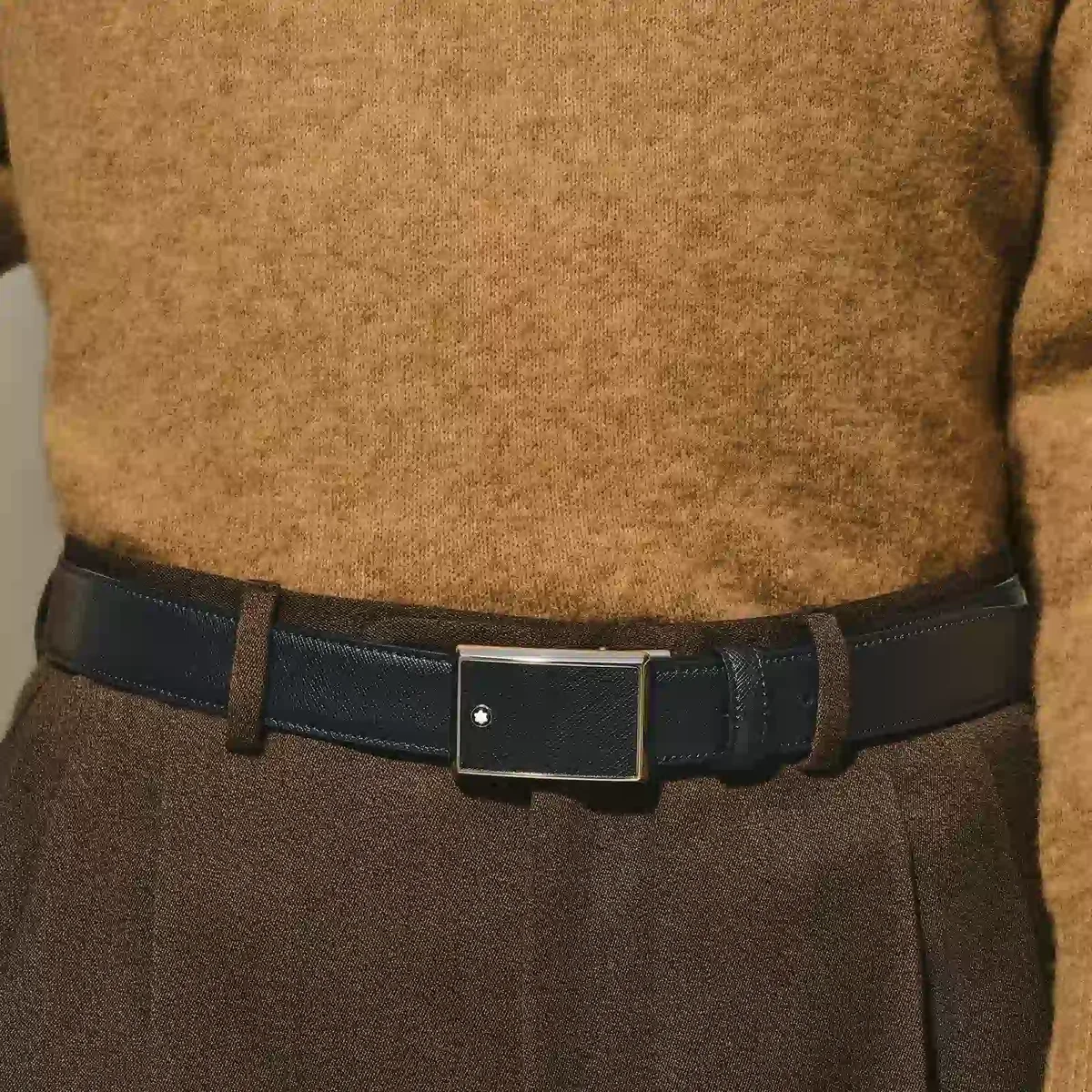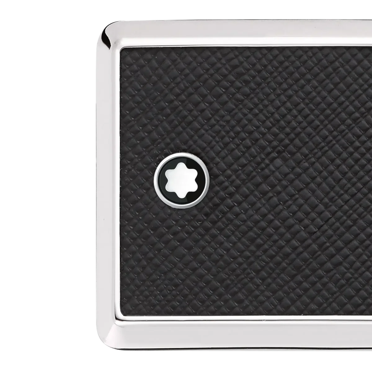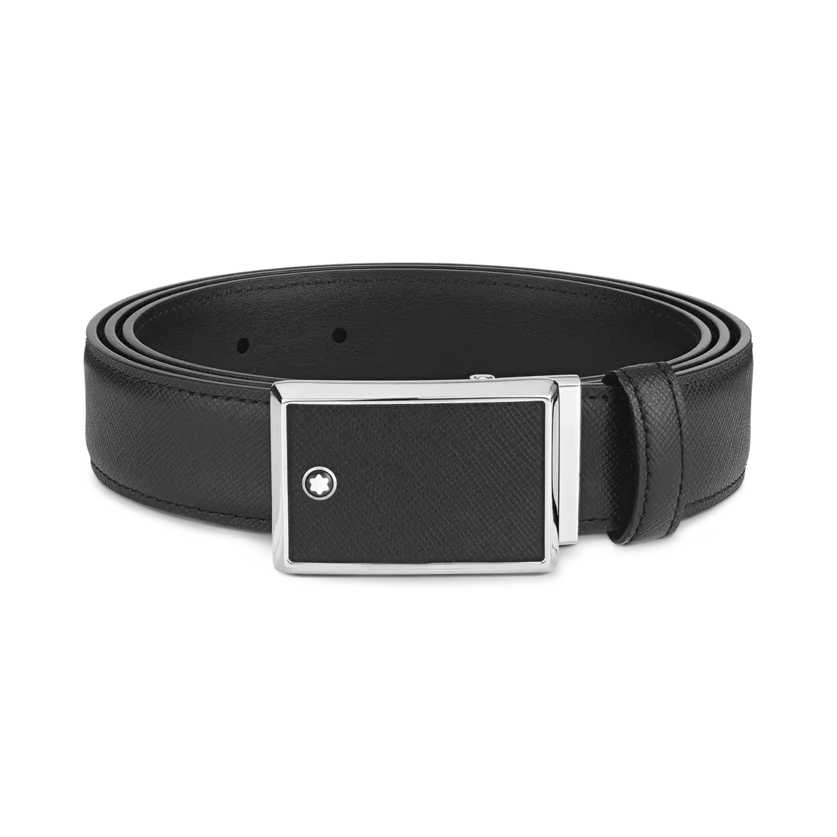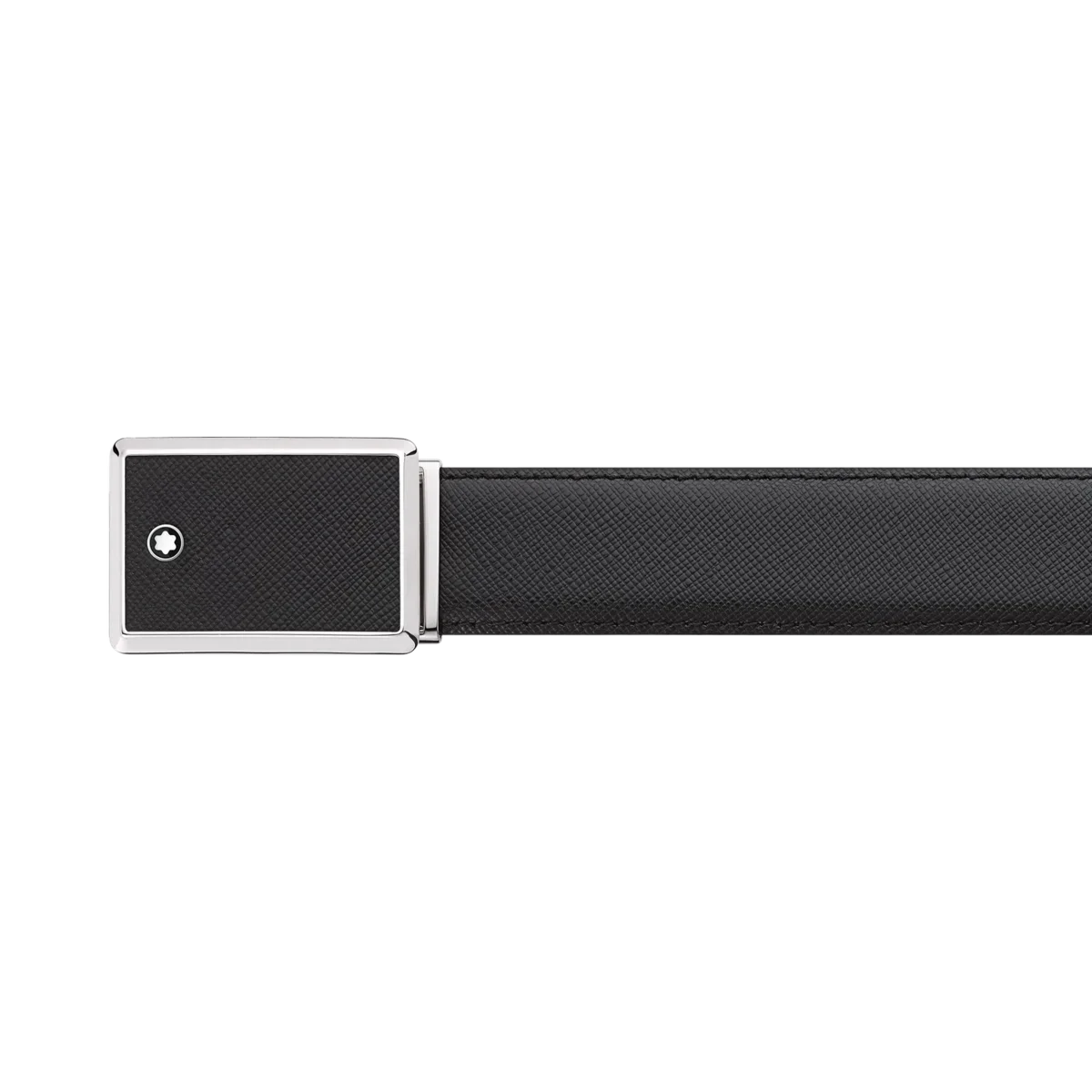 Rectangular Framed Black Saffiano Printed Leather & Stainless Steel Plate Buckle. Self-adjustable, 3 cm x 120 cm, Saffiano printed black leather strap.