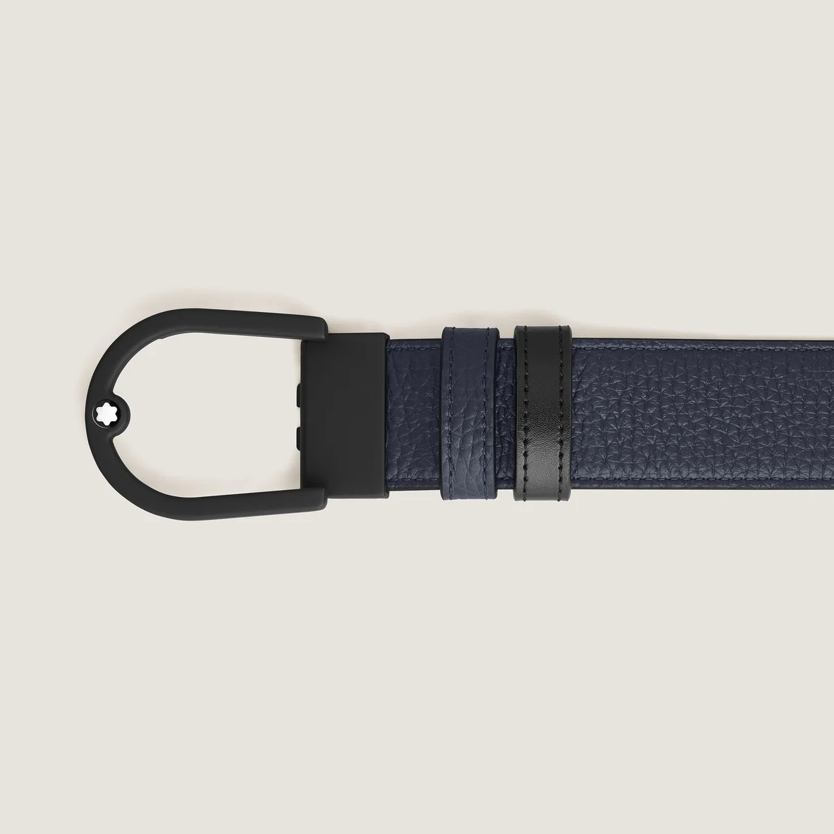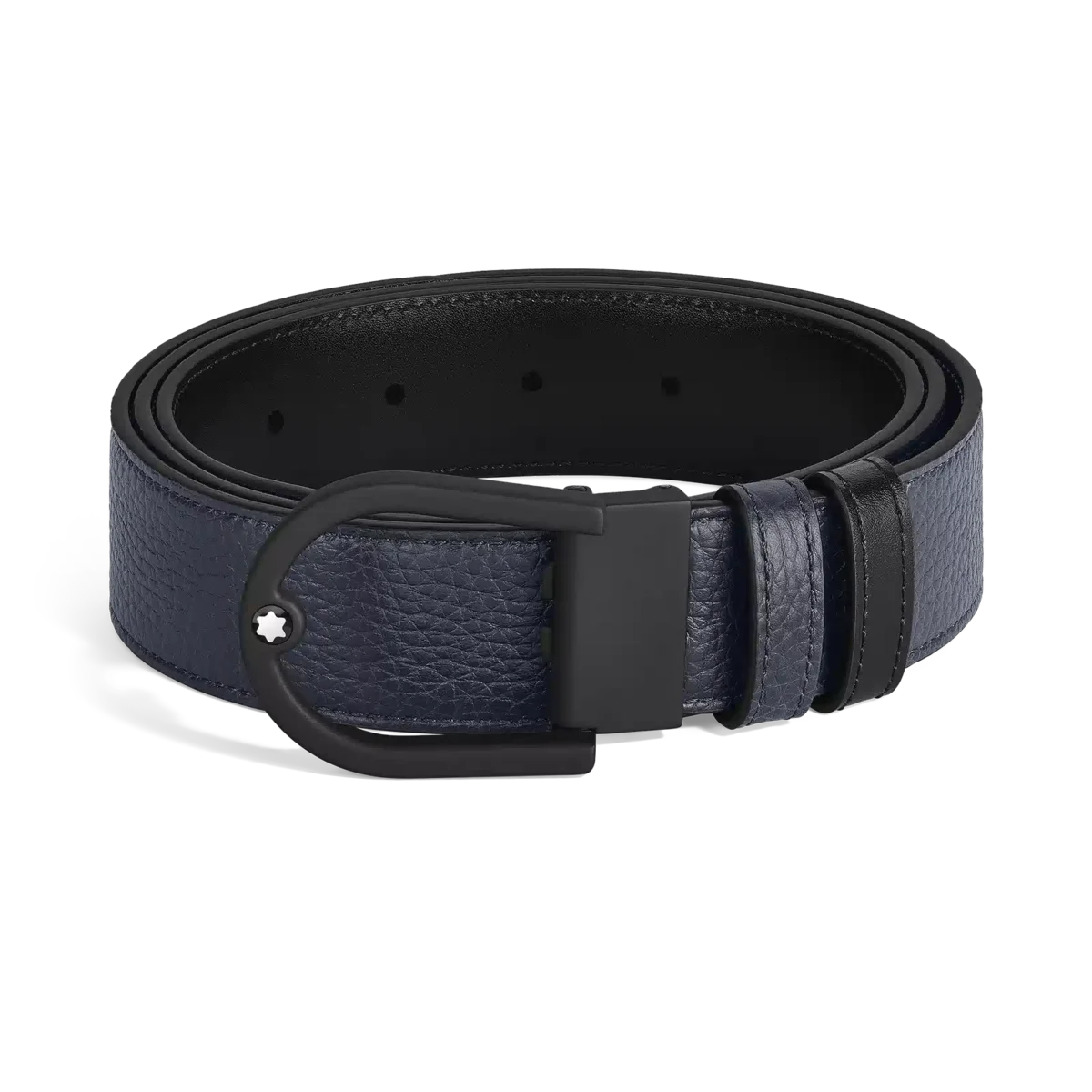 This reversible 35mm belt combines the sleek silhouette of a rubberized PVD-finished buckle with the versatility of two distinct leather straps. With clean and curved lines, the horseshoe buckle adds a touch of modern sophistication to your style. The belt strap offers versatility and refined style, featuring two distinct looks in one accessory: while one side showcases grainy leather in a deep midnight blue shade, the reverse features sleek black Meisterstück leather for a timeless, polished finish.