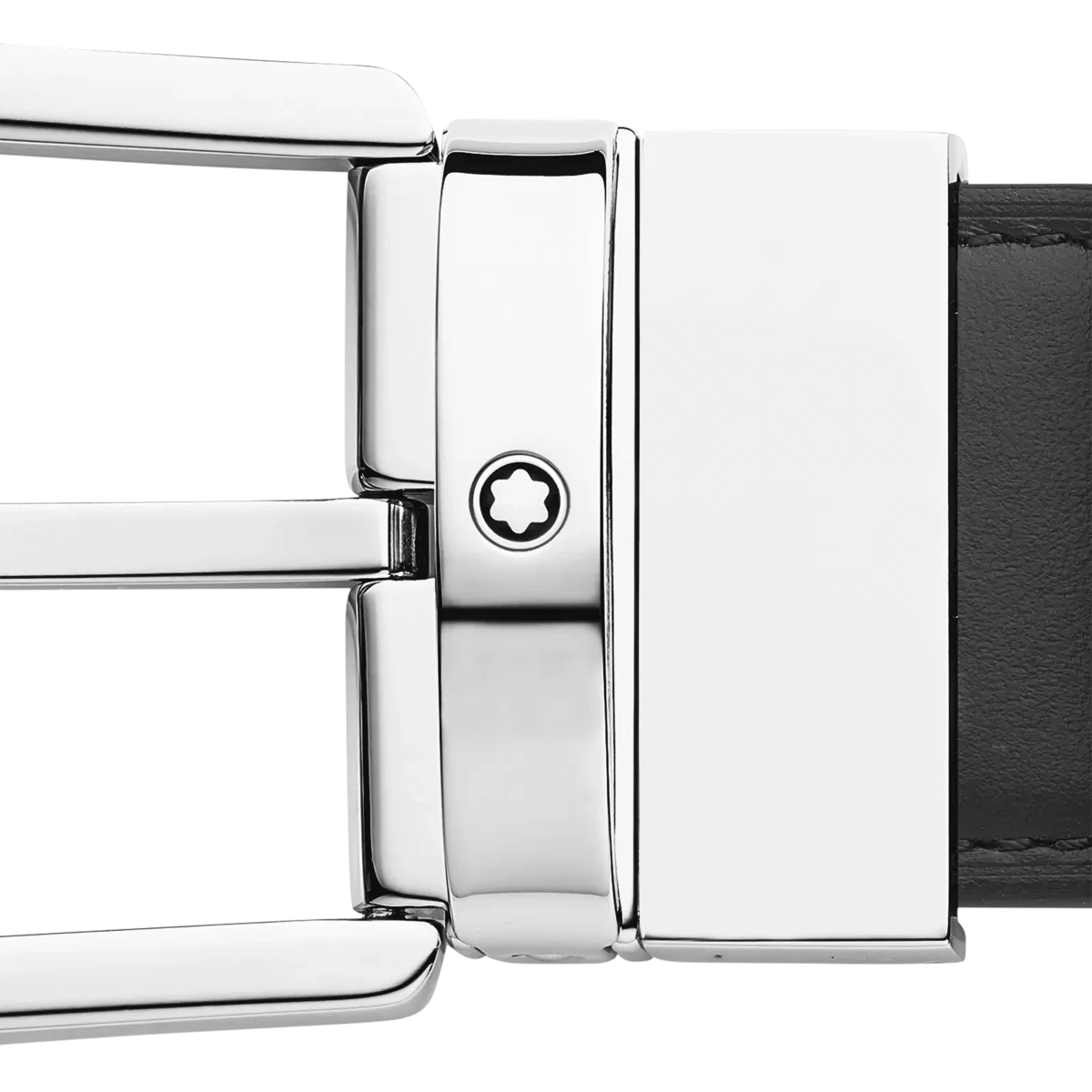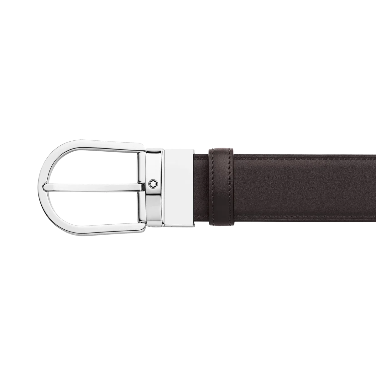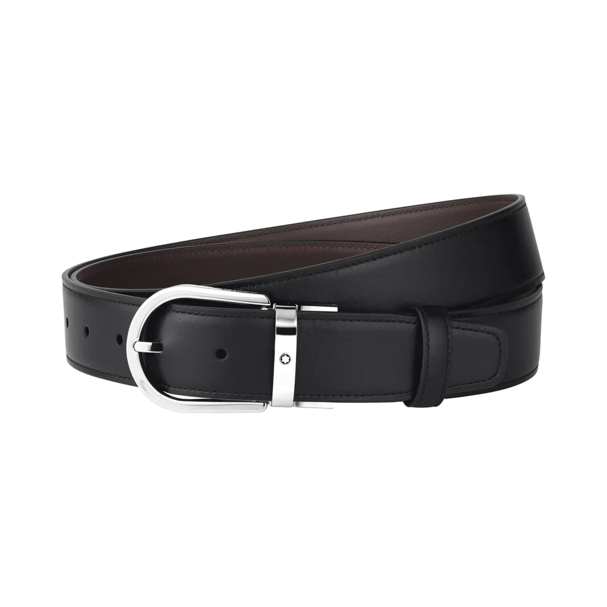 Horseshoe shiny palladium-finish pin buckle. Self-adjustable, 3.5 cm x 120 cm, reversible leather strap in black color on one side and dark brown color on the other. Refined and understated, for any kind of look.