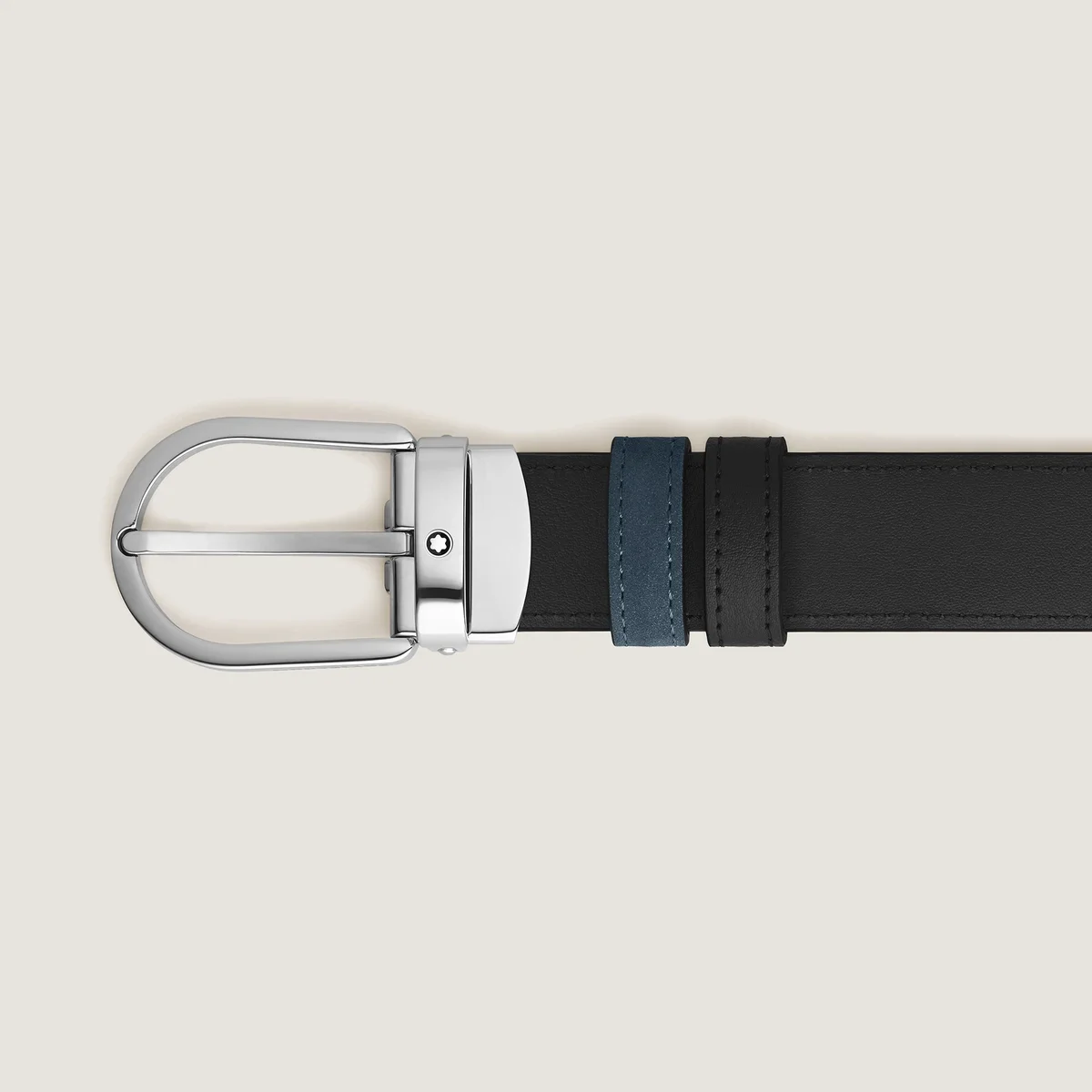 With soft to touch velvet blue suede on one side and smooth black leather on the other, this reversible 30mm belt offers twice the style. The horseshoe buckle with a shiny palladium finish adds a timeless feel, completed by the Montblanc emblem.