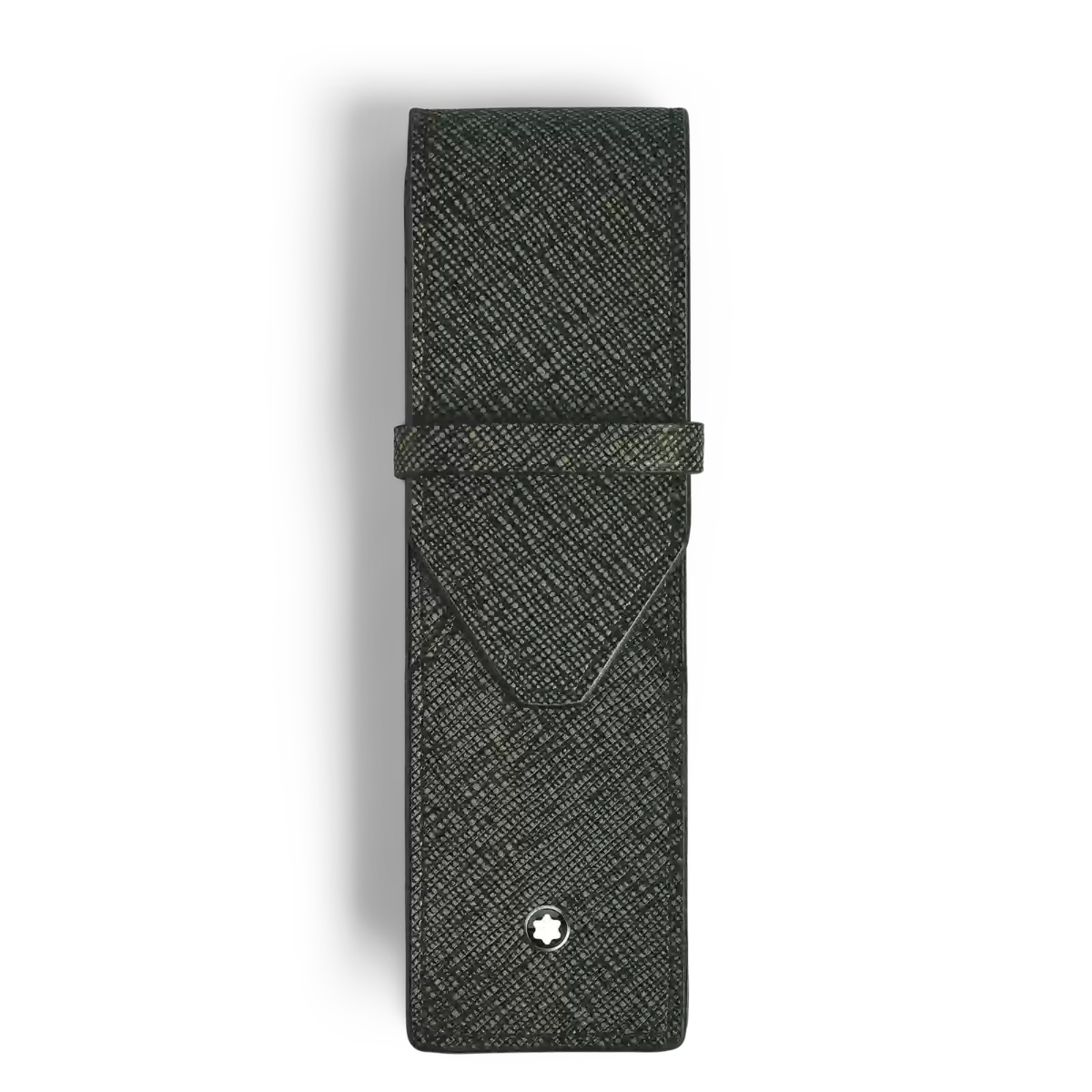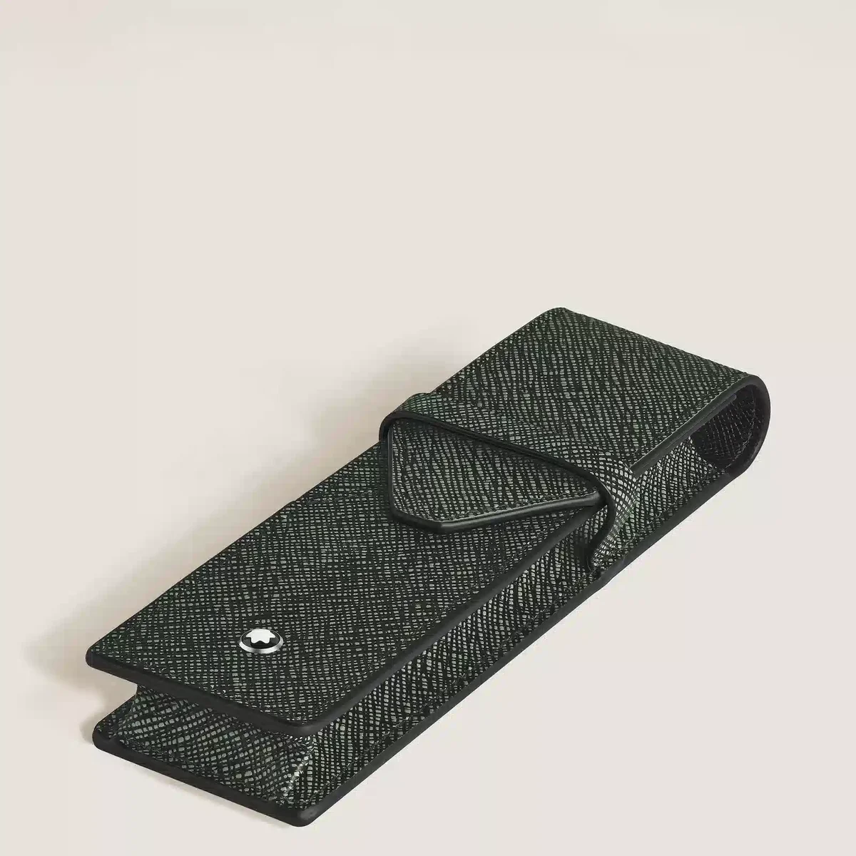 A sleek and refined accessory, this pen pouch is designed to hold up to two writing instruments. Crafted from embossed sartorial leather in an elegant two-tone combination of classy khaki and black, its overlapping silhouette takes inspiration from the shape of an envelope, paying homage to the culture of writing.