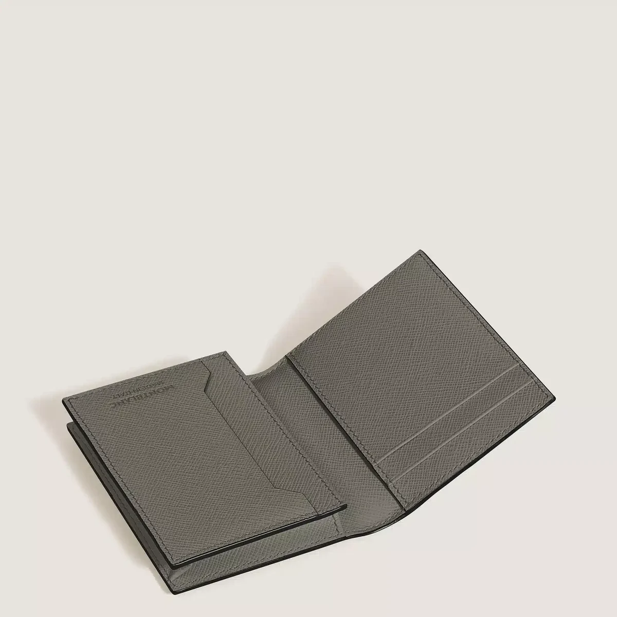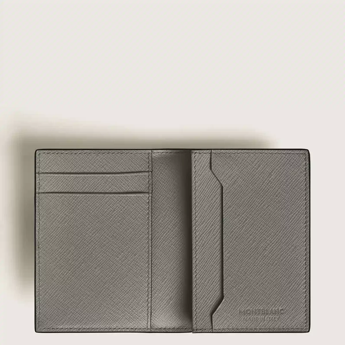 Though compact in size, this leather card holder proves to be a truly versatile companion with functional details on both the exterior and interior. Inside are three credit card slots and a business card compartment plus an additional pocket. Crafted in Saffiano-printed leather in medium grey, its outside features an extra slot for a fourth credit card.