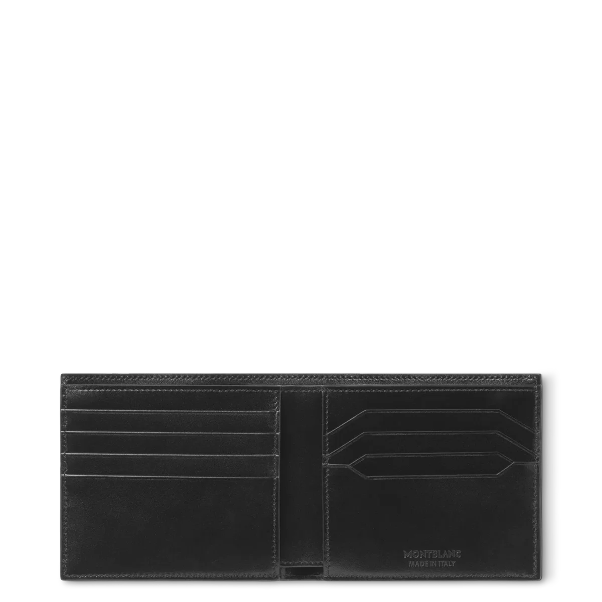 A sleek and compact bi-fold wallet, the stylish Meisterstück 8cc holds eight credit cards in dedicated slots, with two compartments for banknotes, plus an additional two pockets for receipts or small essentials. Crafted from the finest leather, its lined with black fabric and finished with the Montblanc emblem.