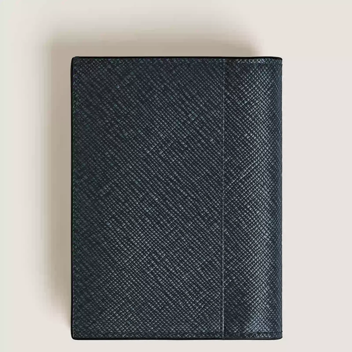 Compact and stylish, this mini wallet is crafted from embossed sartorial leather in an elegant combination of blue and black. Ideal for those who prefer to travel light, its sleek silhouette opens to reveal three credit card slots, a banknote compartment, and two additional pockets, ensuring you can carry all your essentials with ease and sophistication.
