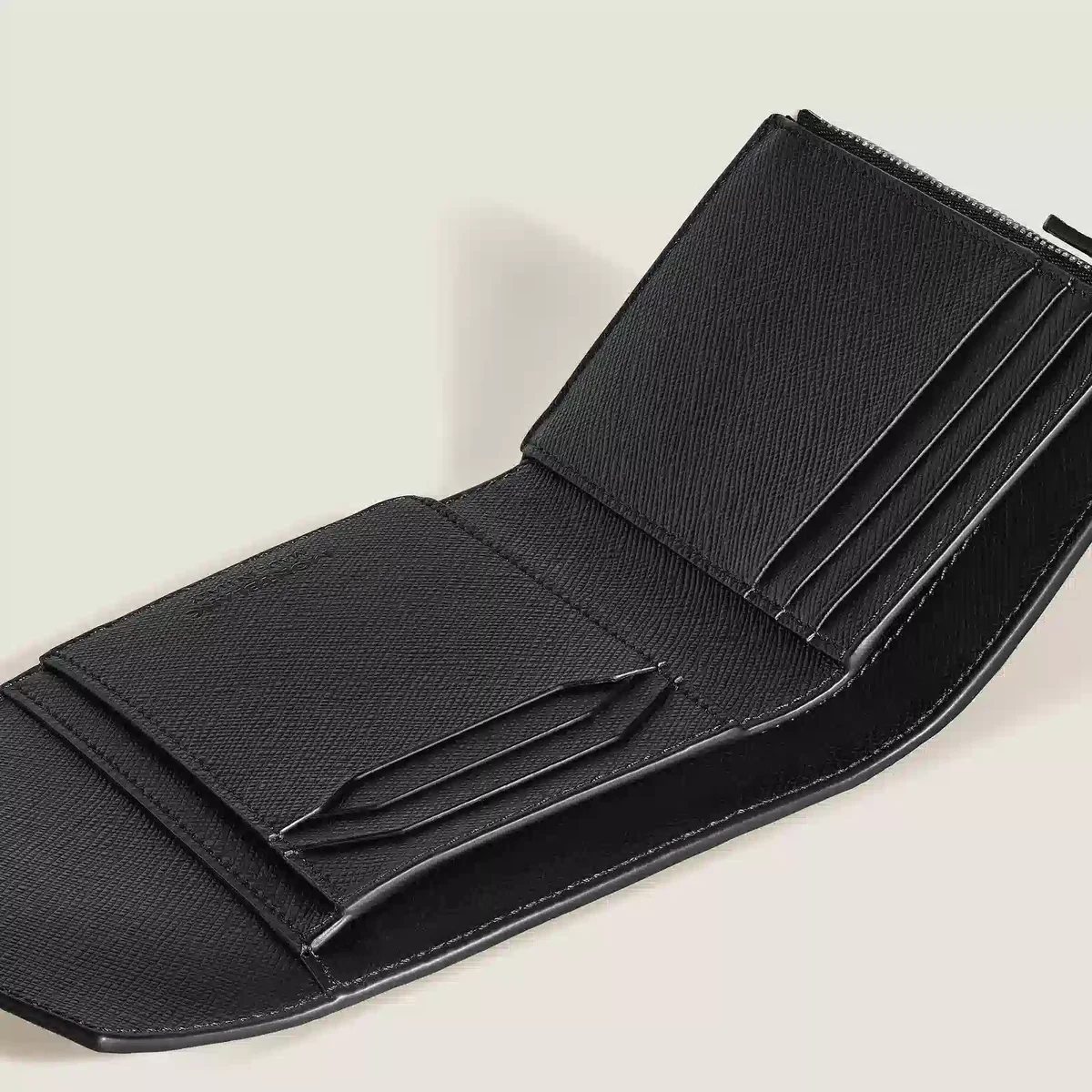 Crafted from embossed sartorial leather in a refined two-tone combination of classy blue and black, this tri-fold wallet is both stylish and practical. Designed to fit comfortably in your pocket, the clasp opens to reveal a zipped pocket for securing coins and keys, six dedicated credit card slots, a compartment for banknotes, and two additional pockets for added storage.