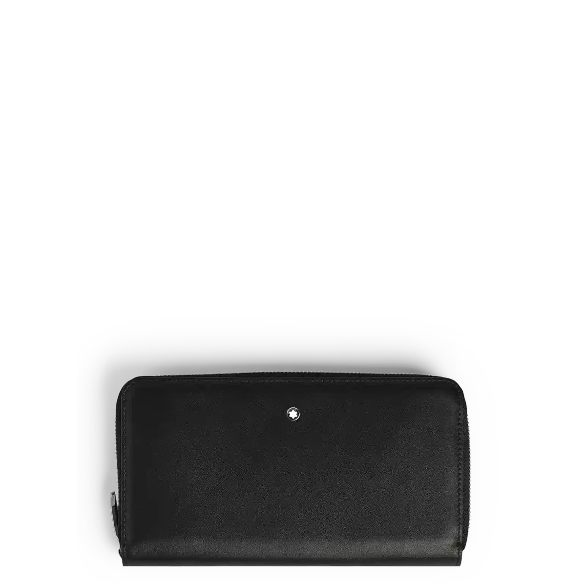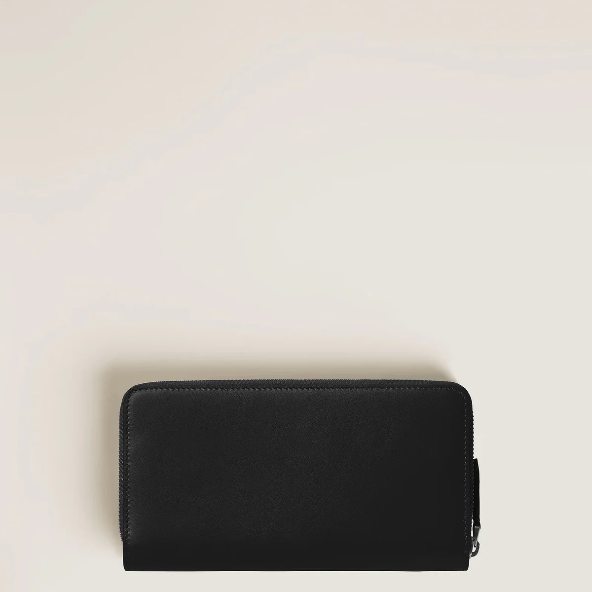 Blending elegant design with practical functionality, this wallet is a versatile companion for any occasion. Crafted from black premium soft calfskin leather, its clean-lined rectangular silhouette exudes sophistication. A nib-inspired puller unzips it to reveal three compartments for banknotes, a zipped coin case, three pockets for smaller essentials, and slots to hold up to 12 credit cards, ensuring effortless organisation with refined style.