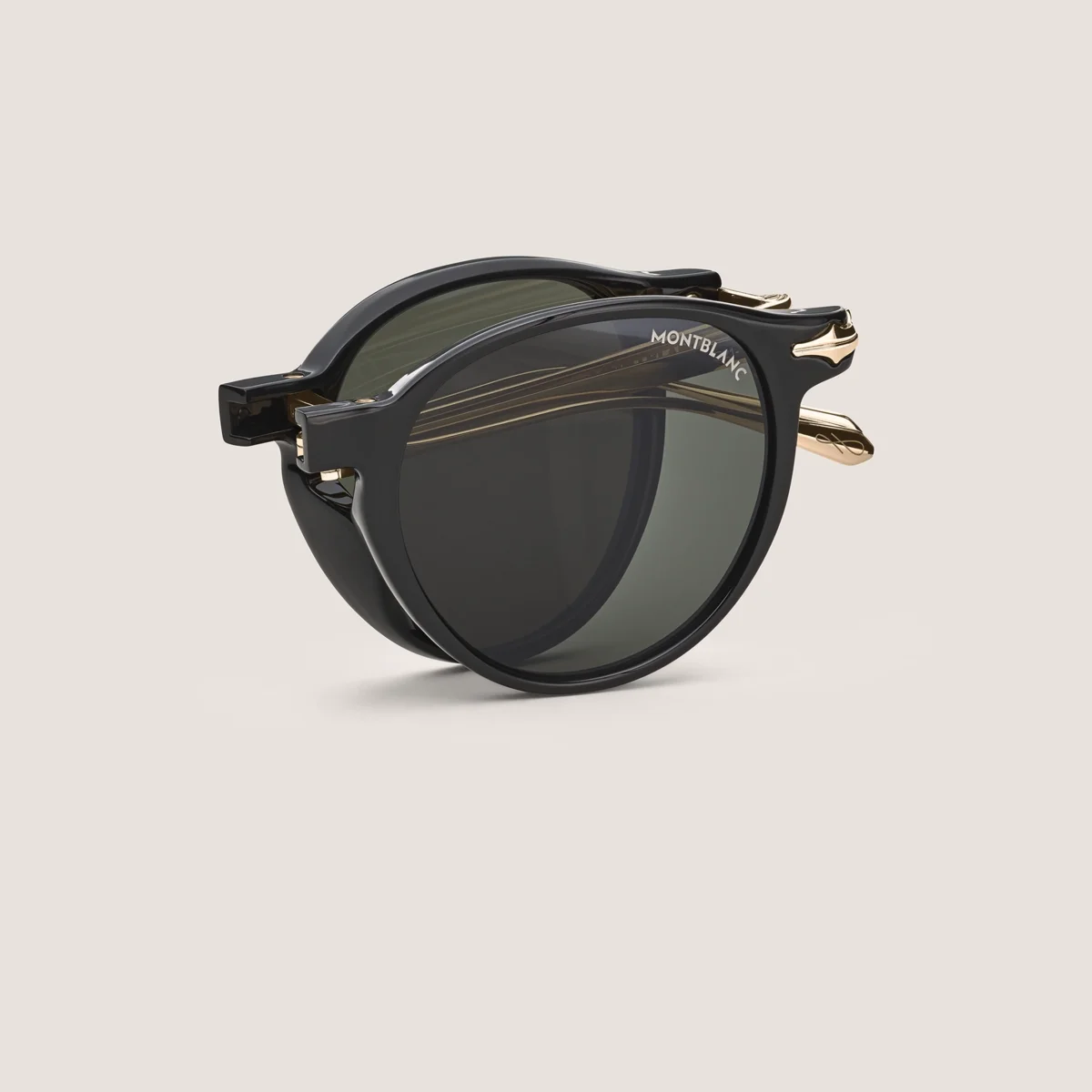 These sunglasses in an oval style have a black-coloured injected frame and grey lenses. Inspired by the nib design of the writing instruments, a decorative nib detail is featured on the metal temple design. This style is fully foldable. The Montblanc one line logo is engraved on the right side of the temple, additionally the logo is lasered on the left lens and a decorative detail is engraved on the end tips of the temple.