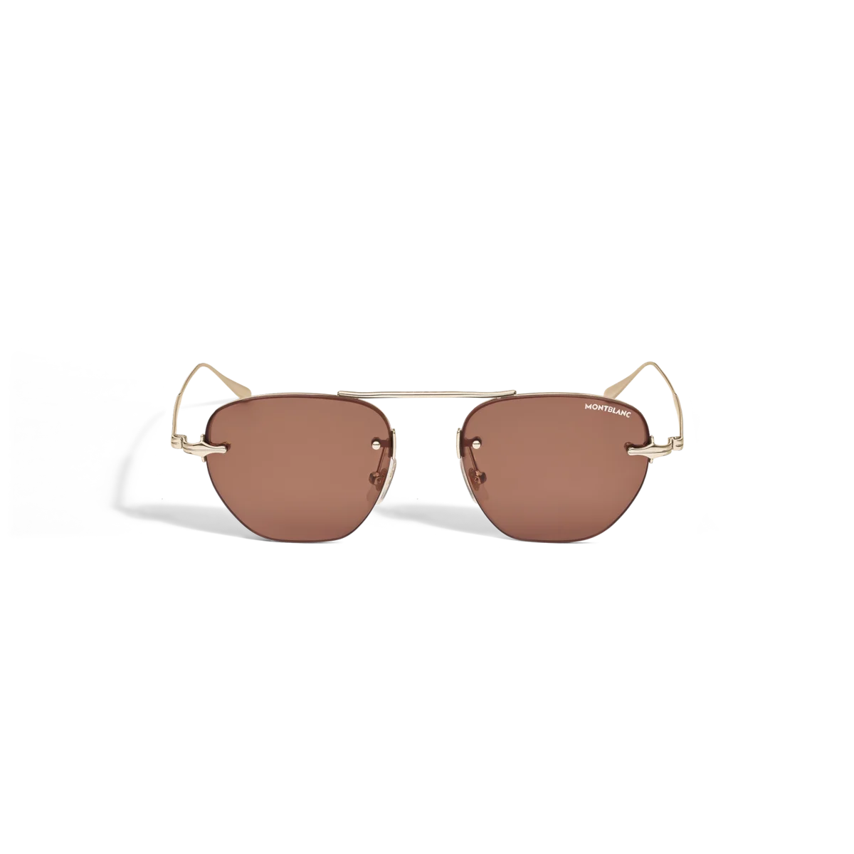 These sunglasses in a round style have a gold-coloured metal frame and brown lenses. Inspired by the nib design of the writing instruments, a decorative nib detail is featured on the metal temple design. The Montblanc one line logo is engraved on the right side of the temple, additionally the logo is lasered on the left lens and a decorative detail is engraved on the end tips of the temple.