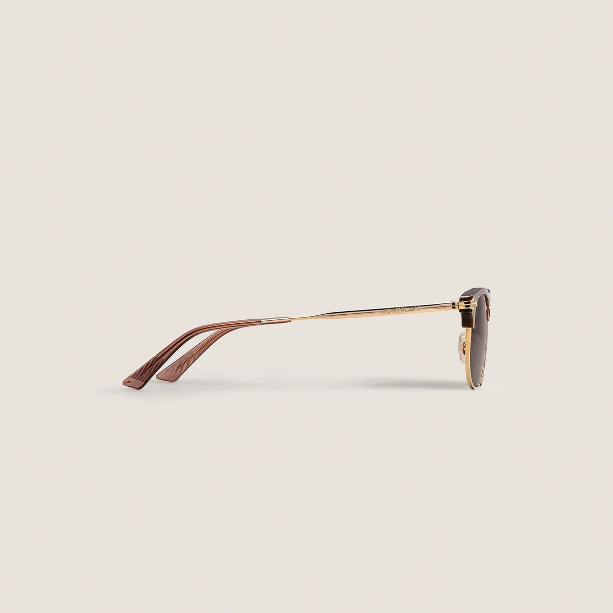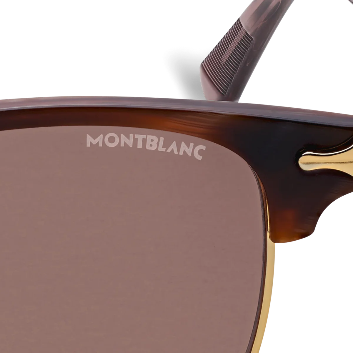 These sunglasses in a rectangular style have a gold colored metal frame with and brown lenses. Inspired by the nib design of the writing instruments, a decorative nib detail is featured on the metal temple design.The Montblanc logo is lasered on the left lens and the anti-slip pattern is lasered onto the internal side of the temple tips to increase comfort.