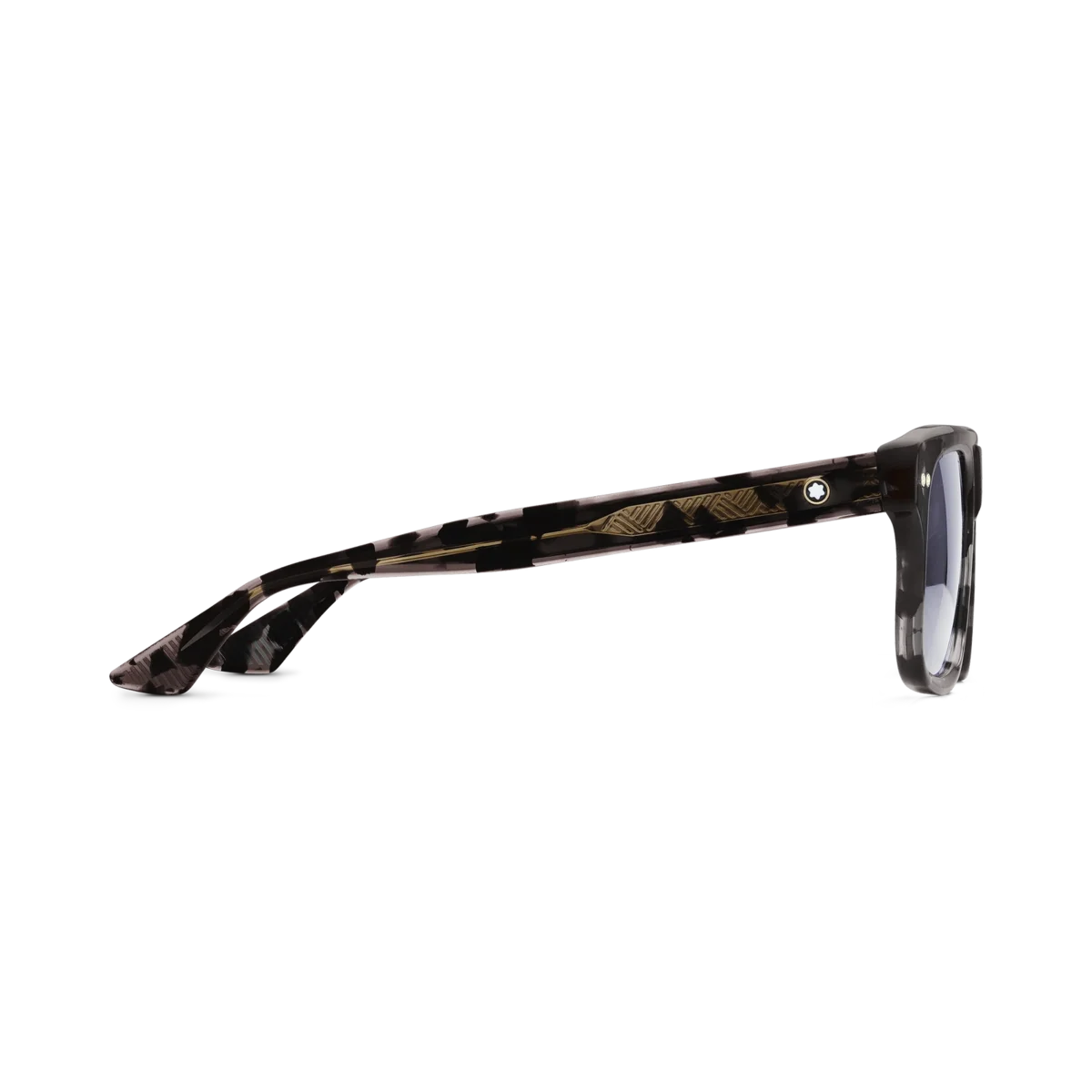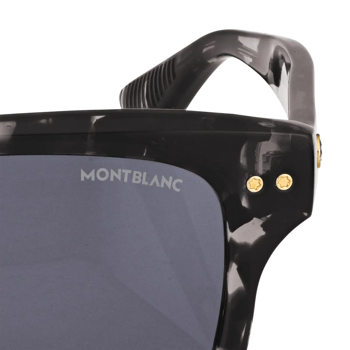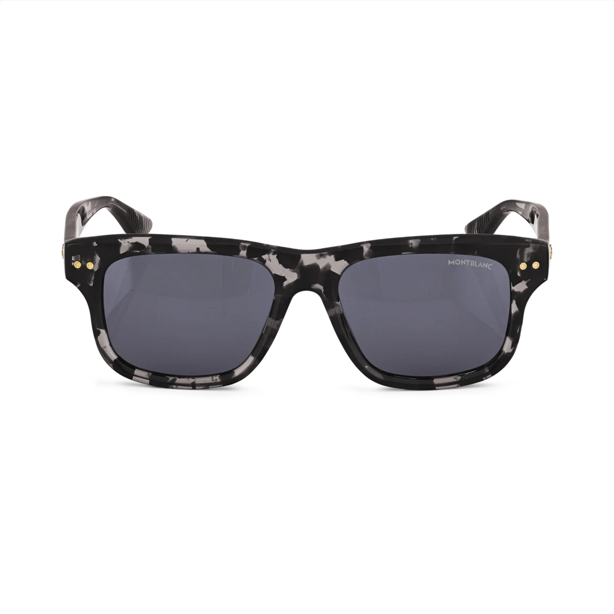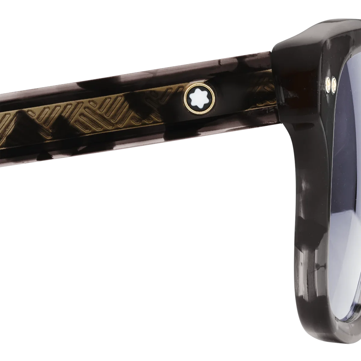 These rectangular sunglasses with a bold shape feature a black-melange-colored acetate frame and gray lenses. The rivets on the front feature a snowcap detail and the Montblanc Extreme 3.0 pattern incorporated in the inside of the temple design. The Montblanc Emblem is encapsulated in the temple design. The Montblanc logo is lasered on the left lens and the anti-slip pattern is lasered on the internal side of the temple tips to increase comfort.