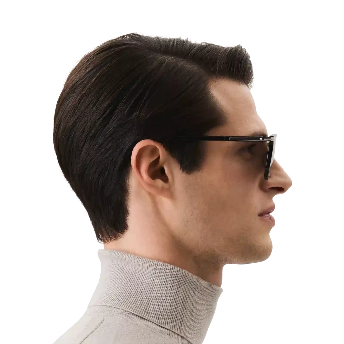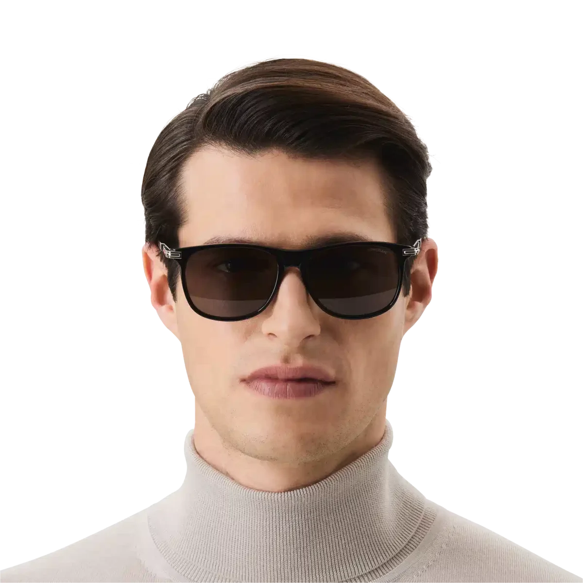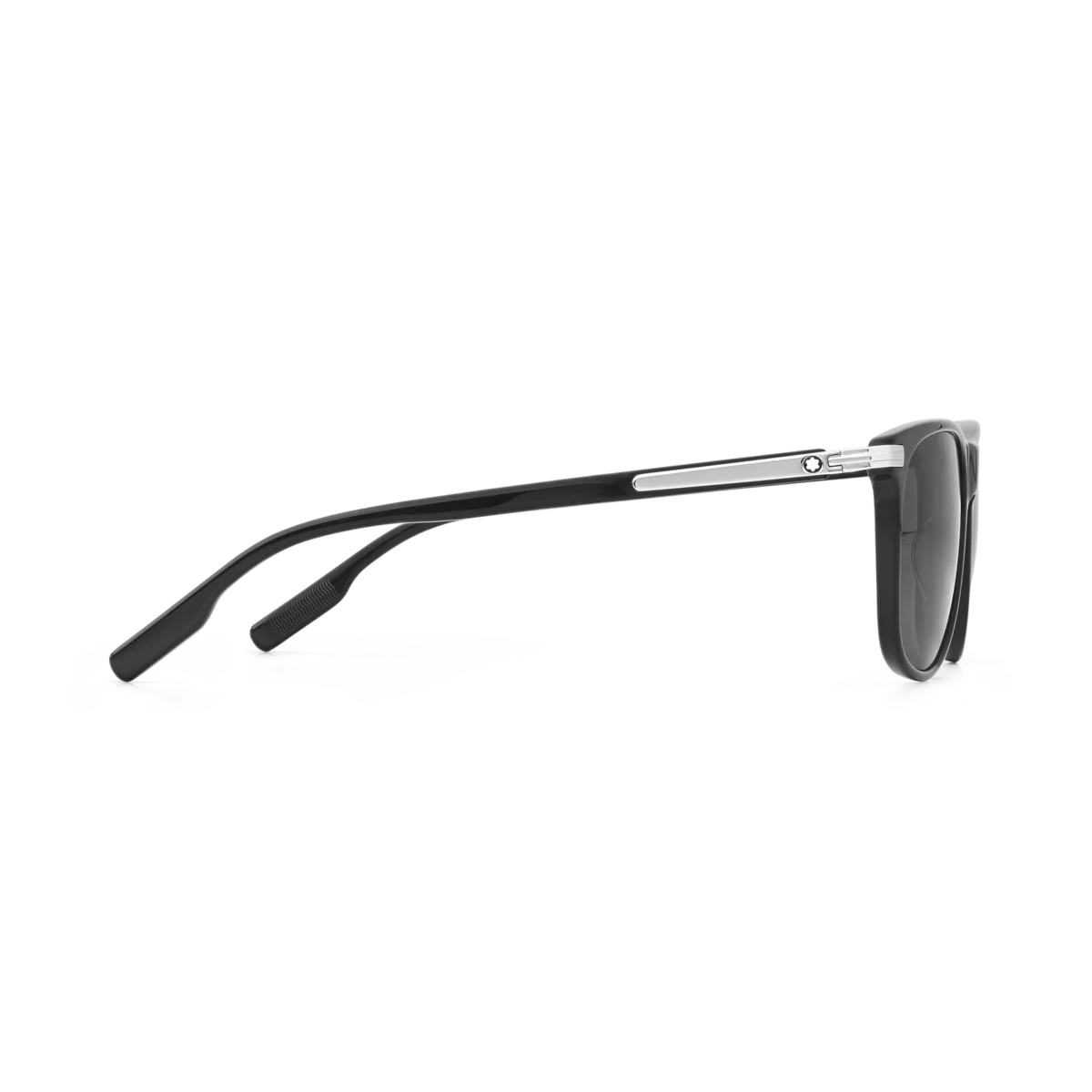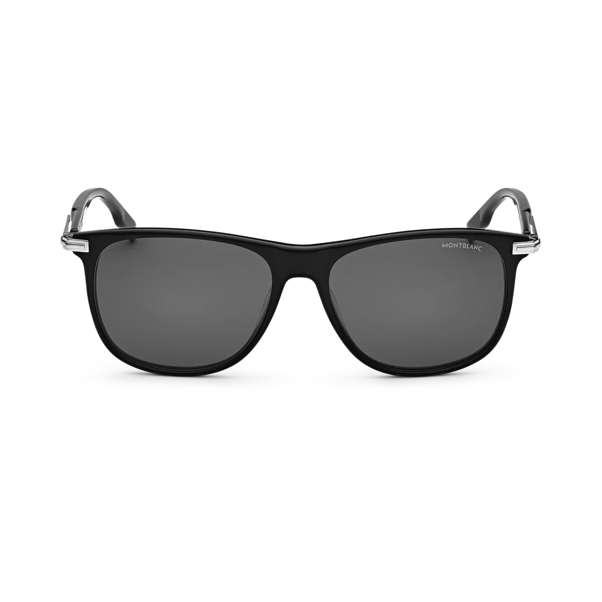These sunglasses in a rectangular style have a black-colored acetate frame and gray-colored lenses. The clip detail is the core element of the temple design, it is both aesthetical and functional as it allows you to hang the frames on pockets. The snowcap Montblanc Emblem is encapsulated in the temple clip detail and the Montblanc logo is lasered onto the left lens.