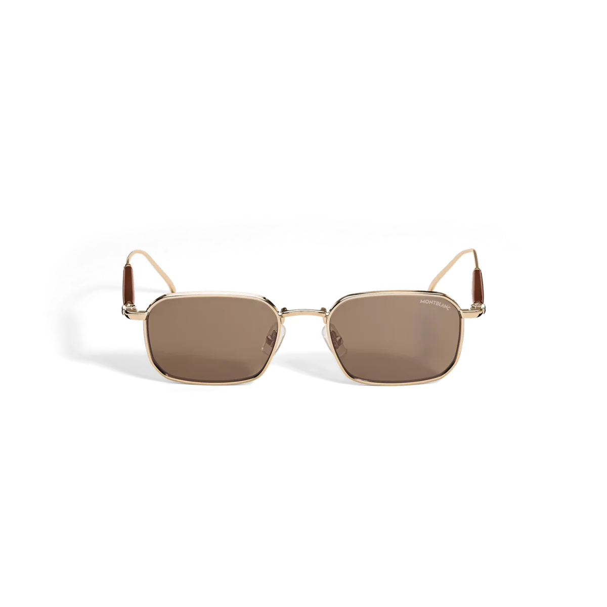 These sunglasses in a rectangular style have a gold-coloured metal frame and brown lenses. The tubular temple features the Montblanc Emblem and is enriched by a wooden element.The Montblanc logo is lasered on the left lens of the sunglasses.