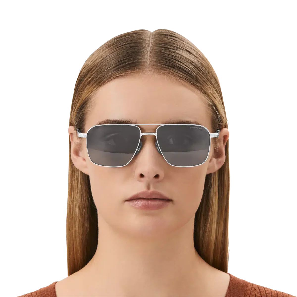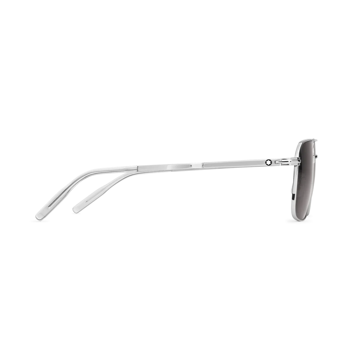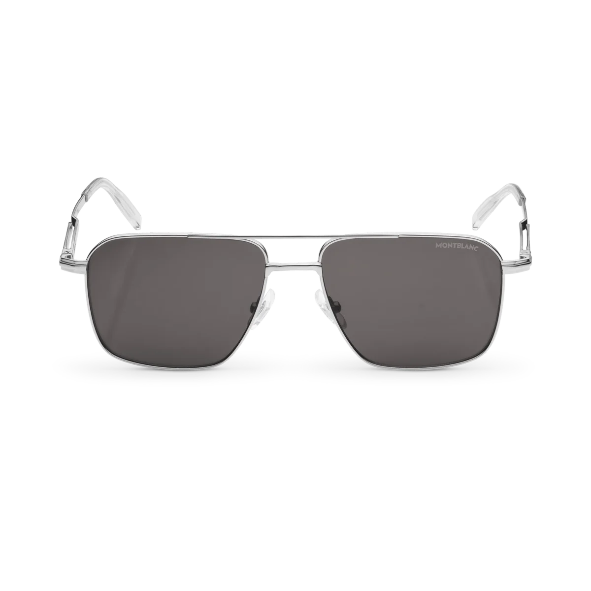 These sunglasses in a rectangular style have a silver coloured metal frame and grey coloured lenses. They feature a double metal bridge on the front. The silver coloured clip detail is the core element of the temple design. It celebrates an important element of the Meisterstück writing instrument, which also enables the frame to hang on pockets. The snowcap Montblanc Emblem is encapsulated in the temple clip detail and the Montblanc logo is lasered on the left lens