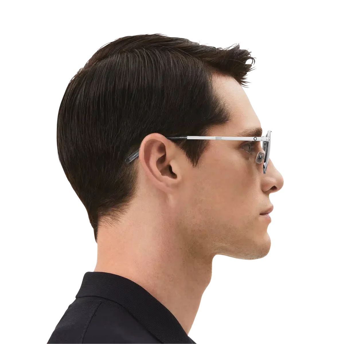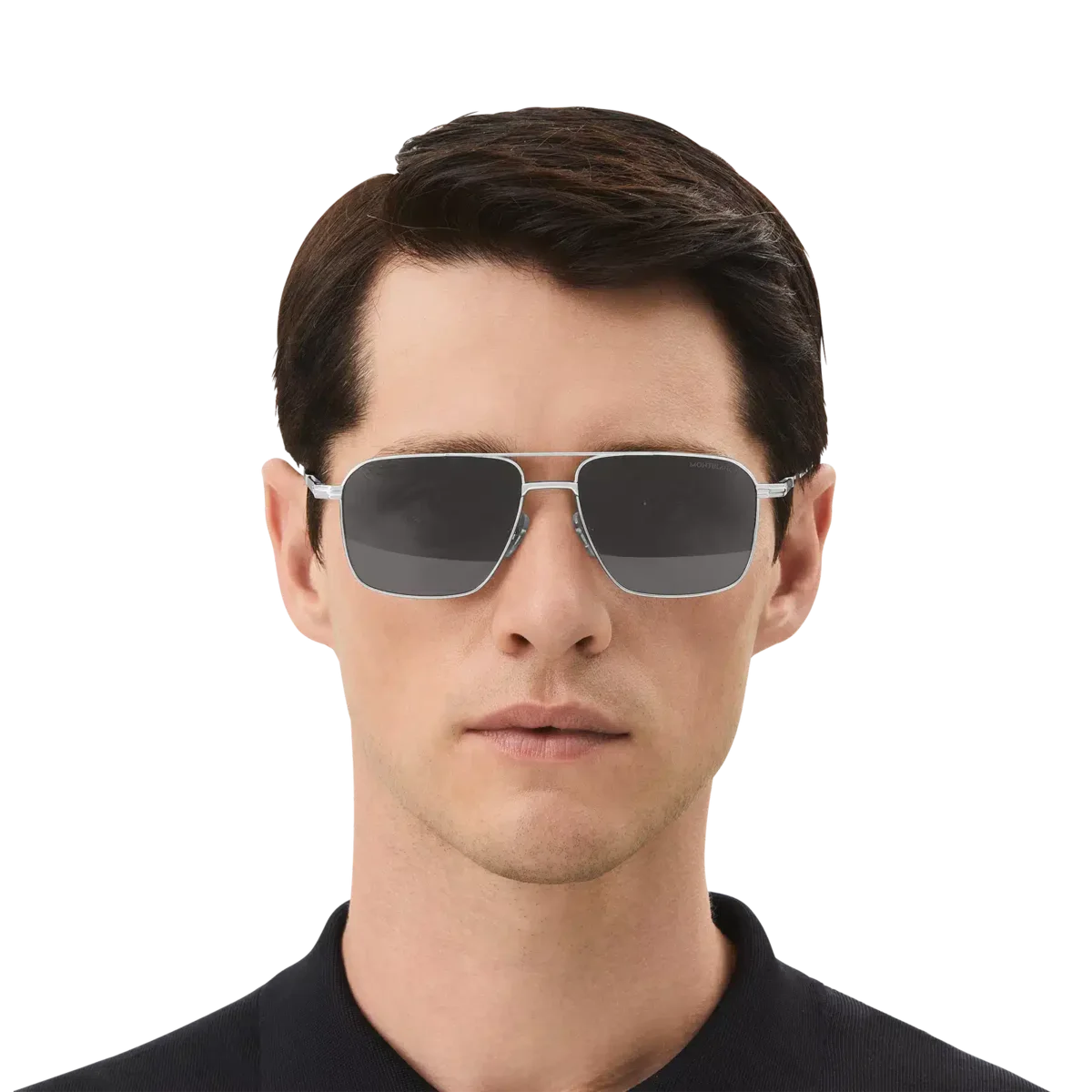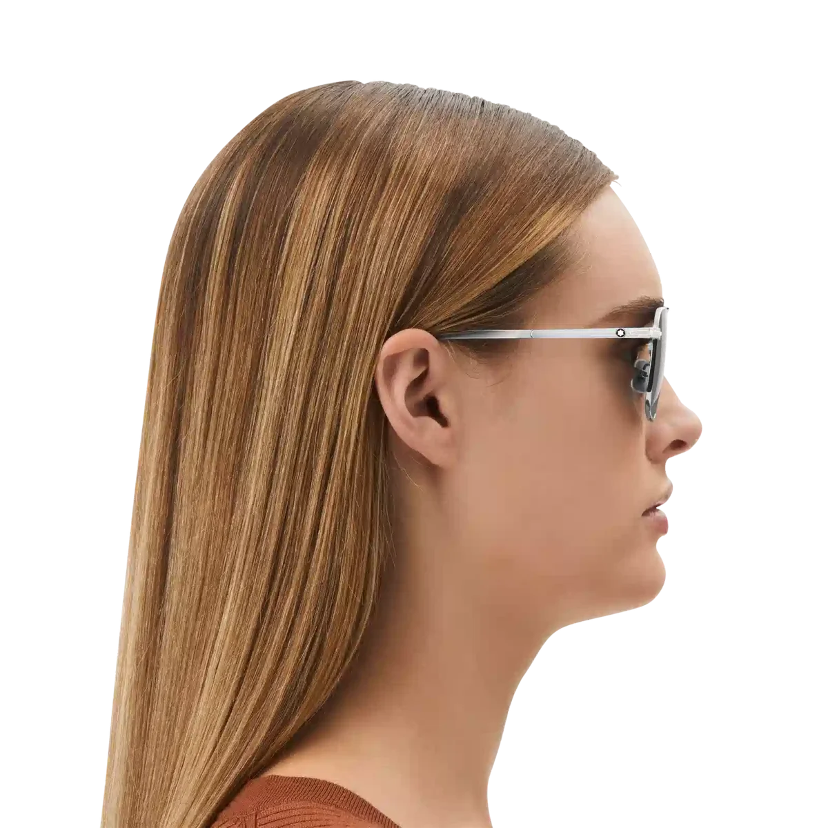 These sunglasses in a rectangular style have a silver coloured metal frame and grey coloured lenses. They feature a double metal bridge on the front. The silver coloured clip detail is the core element of the temple design. It celebrates an important element of the Meisterstück writing instrument, which also enables the frame to hang on pockets. The snowcap Montblanc Emblem is encapsulated in the temple clip detail and the Montblanc logo is lasered on the left lens