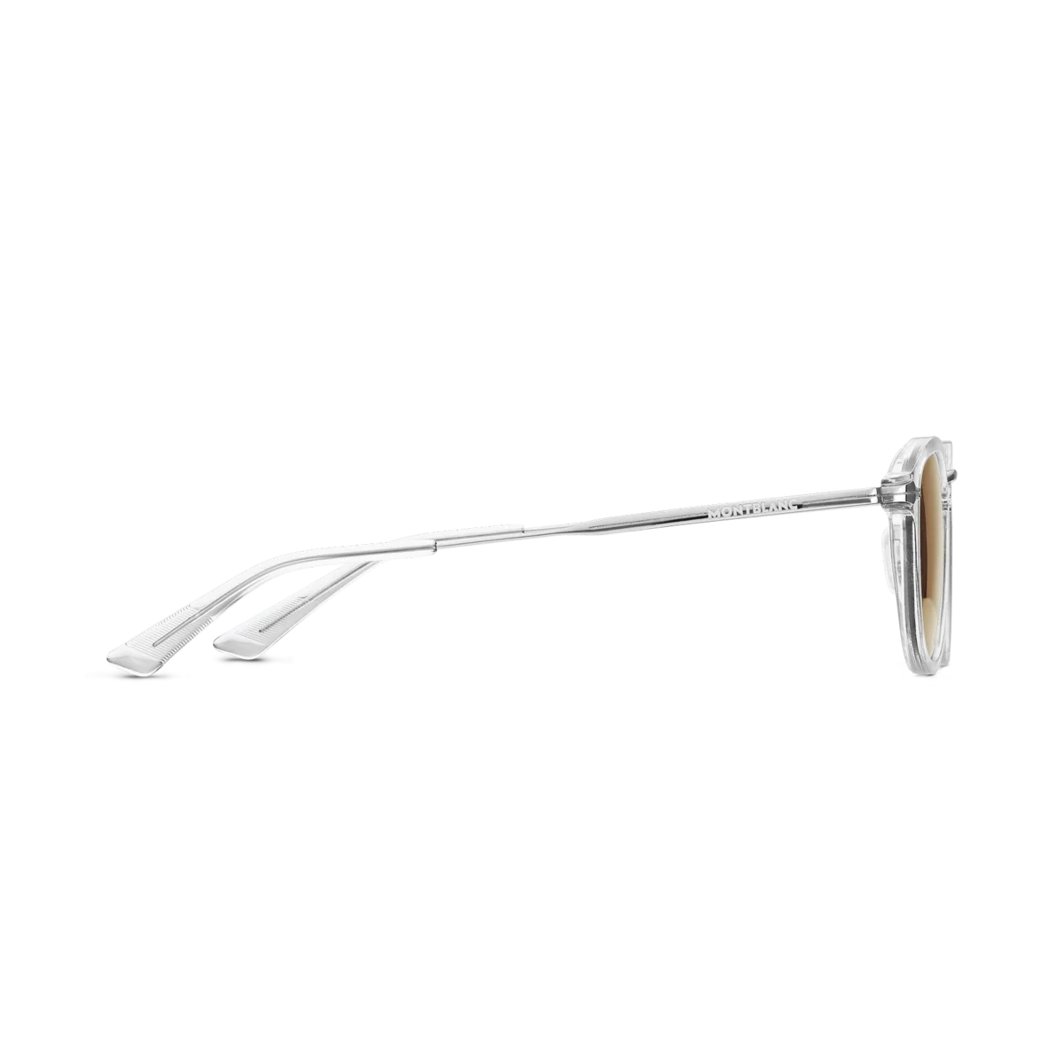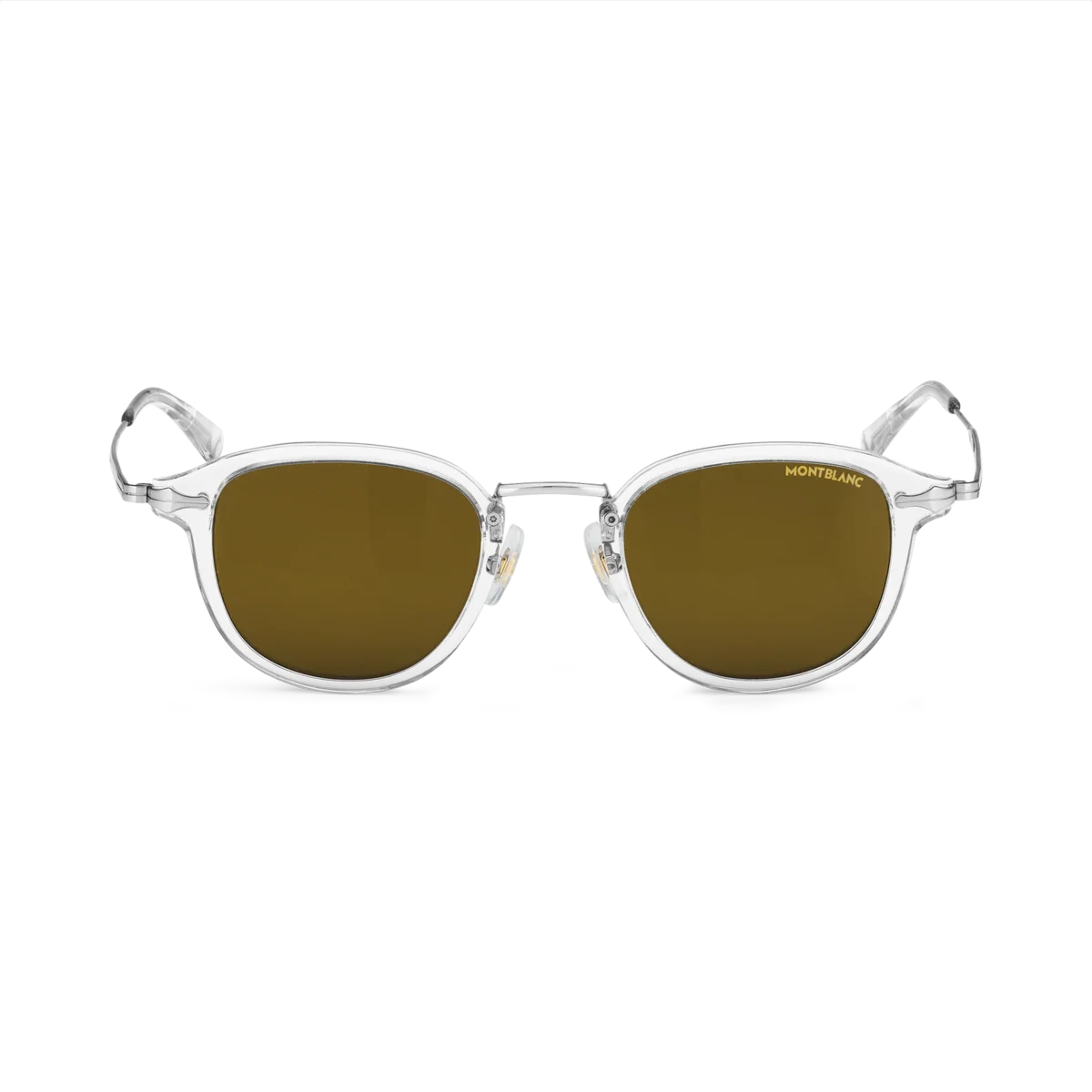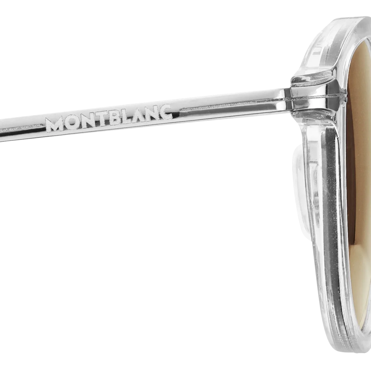 These round sunglasses feature a gray-colored injected frame and brown lenses. Inspired by the nib design of the writing instruments, a decorative nib detail is featured on the metal temple design. The Montblanc logo is lasered onto the left lens and the anti-slip pattern is lasered onto the internal side of the temple tips to increase comfort.