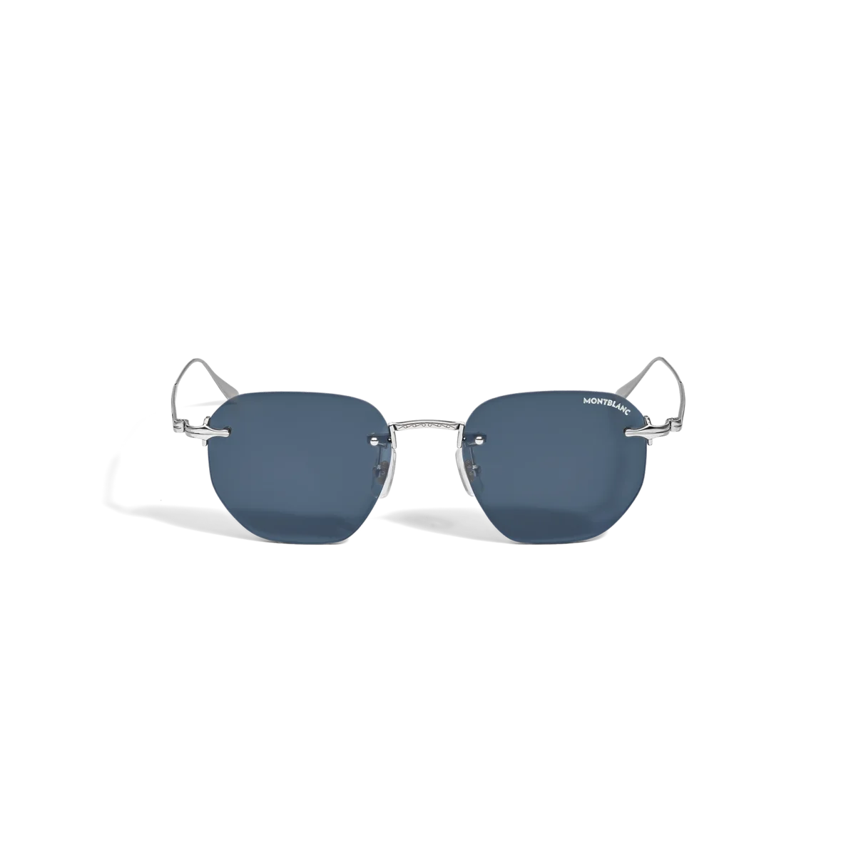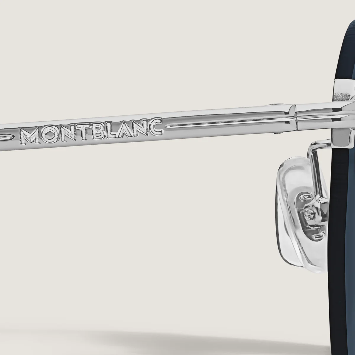 These sunglasses in a round style have a silver-coloured metal frame and blue lenses. Inspired by the nib design of the writing instruments, a decorative nib detail is featured on the metal temple design. The Montblanc one line logo is engraved on the right side of the temple, additionally the logo is lasered on the left lens and a decorative detail is engraved on the end tips of the temple.