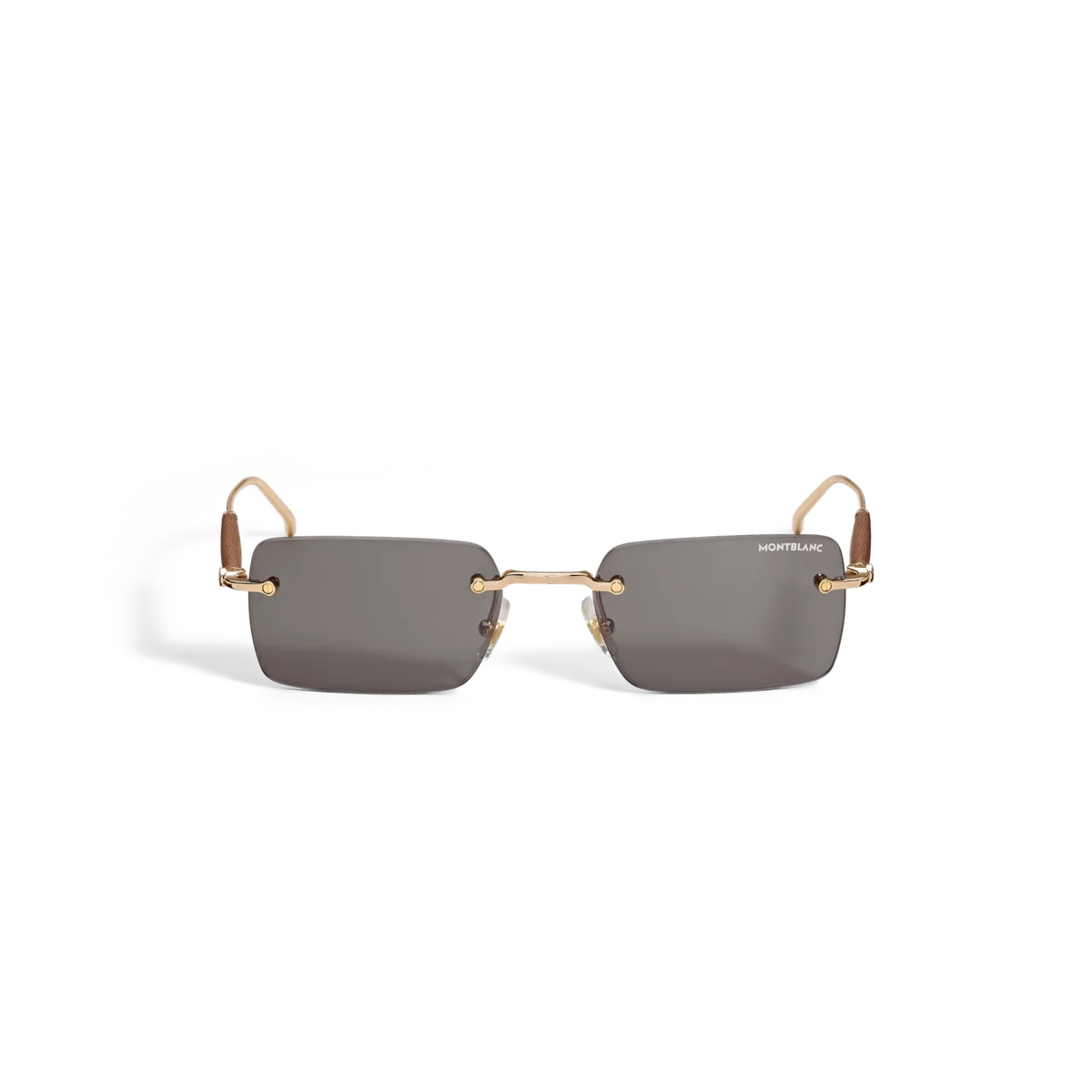 These rimless sunglasses in a squared style have a gold-coloured metal frame and grey lenses. The tubular temple features the Montblanc Emblem and is enriched by a wooden element.The Montblanc logo is lasered on the left lens of the sunglasses.