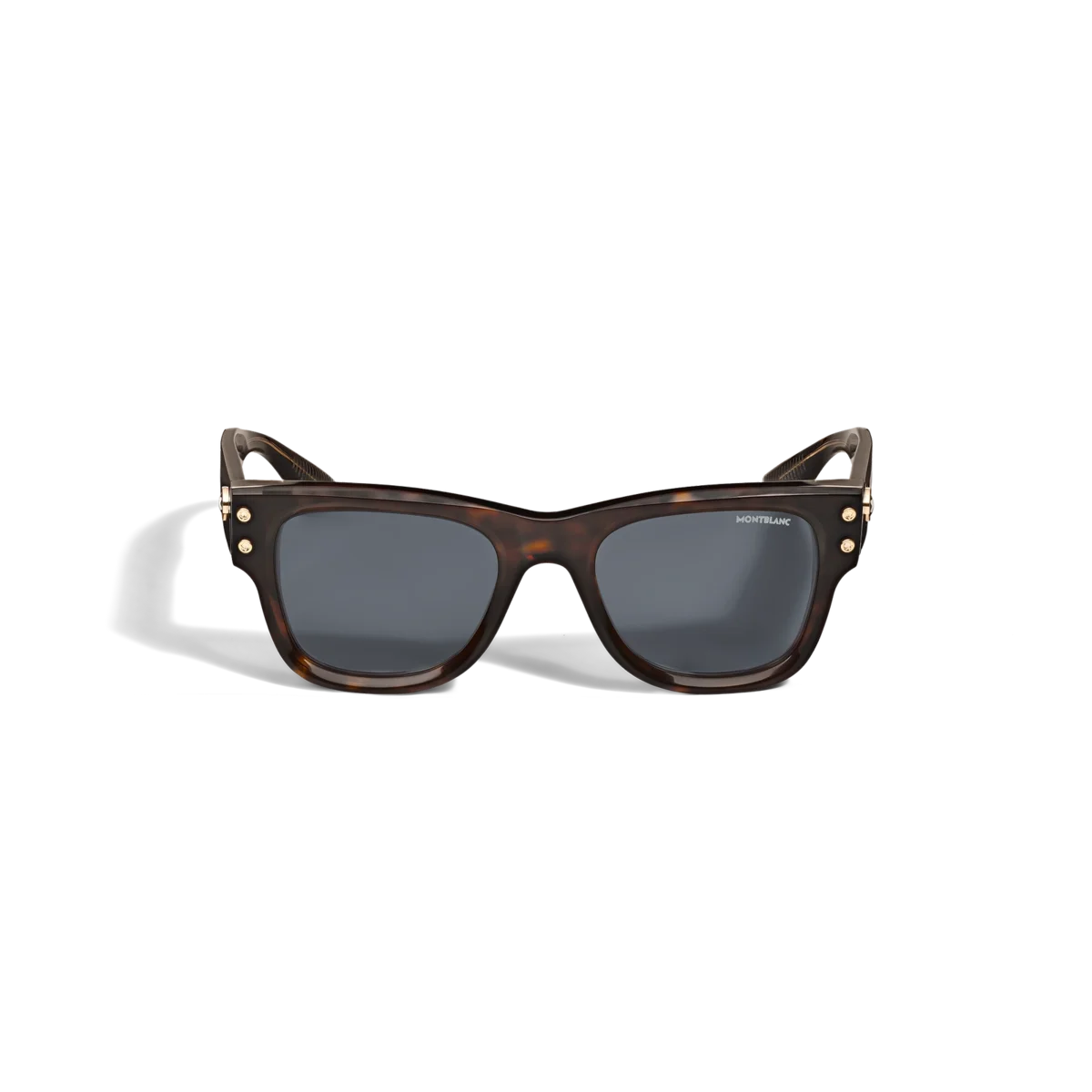 These sunglasses in a rectangular style and bold shape have a havana coloured acetate frame and grey lenses.The rivets on the front feature a snowcap detail and the Montblanc Extreme 3.0 pattern incorporated in the inside of the temple design. The Montblanc Emblem is encapsulated in the temple design. The Montblanc logo is lasered on the left lens and the anti-slip pattern is lasered onto the internal side of the temple tips to increase comfort.