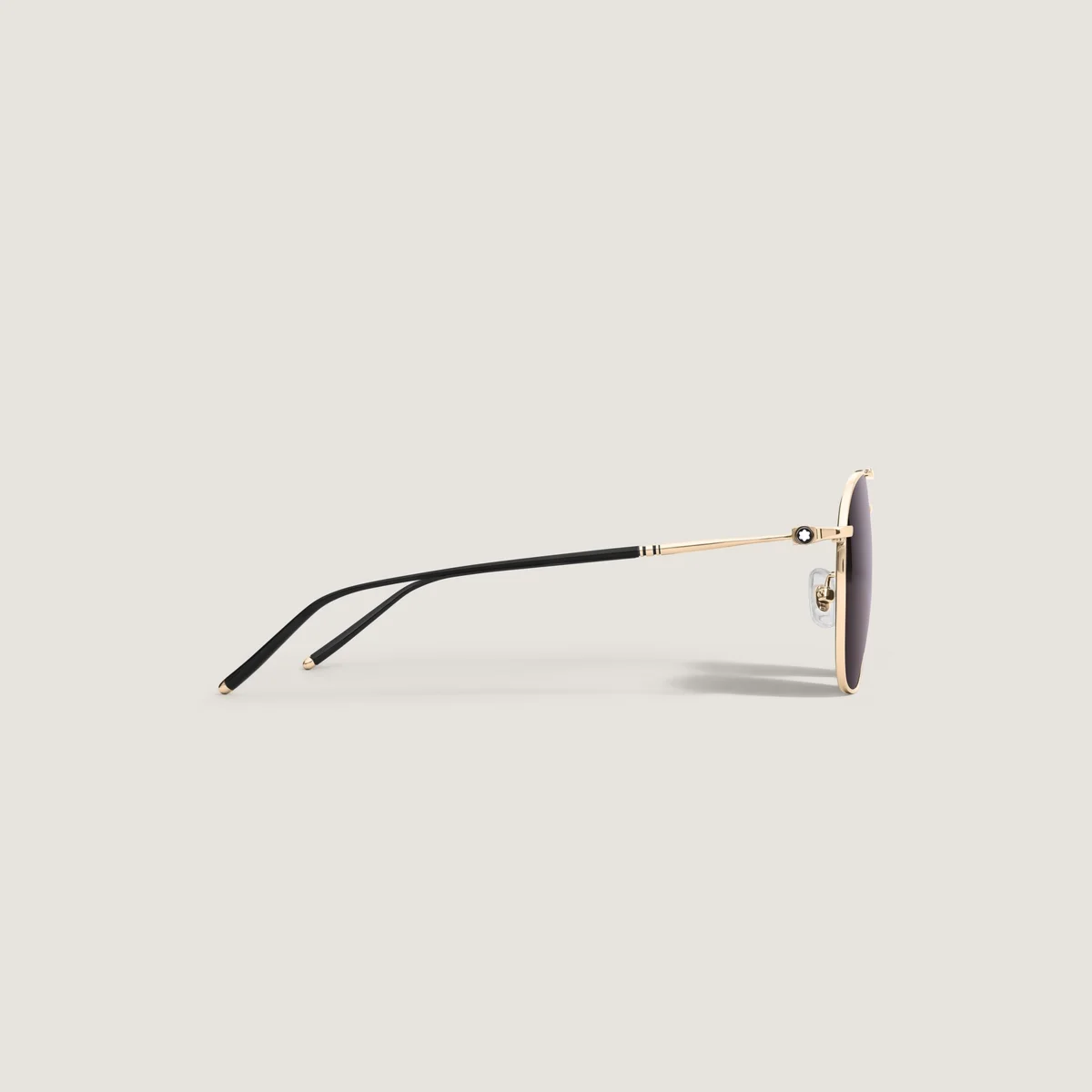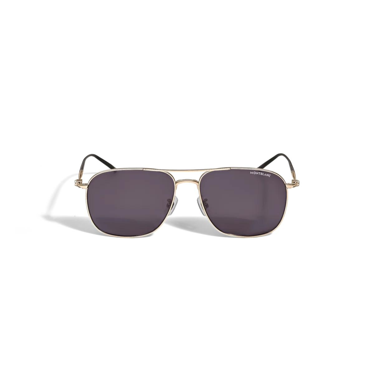 These sunglasses in a squared style have a gold-coloured metal frame and grey lenses. They feature a double metal bridge on the front. The tubular temple inspired by the Meisterstück writing instruments is enriched with a 3 rings detail. The Montblanc logo is lasered on the left lens and a black enamel detail is encapsulated on the end tips.