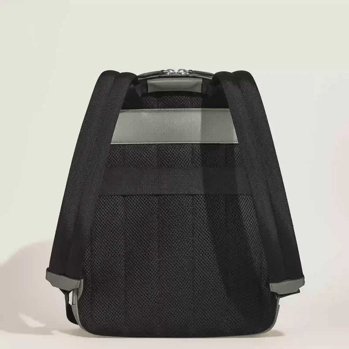 Combining functionality with refined city style, this backpack in medium grey is a suitable companion for navigating the city. Its Saffiano-printed leather ups the sophistication factor, whilst the bag’s three compartments allow clear organization and offer ample room for documents, devices and writing instruments. A zipped pocket adorns the front of the backpack and allow quick access to small belongings, whils a larger version of the logo lights up the bag.