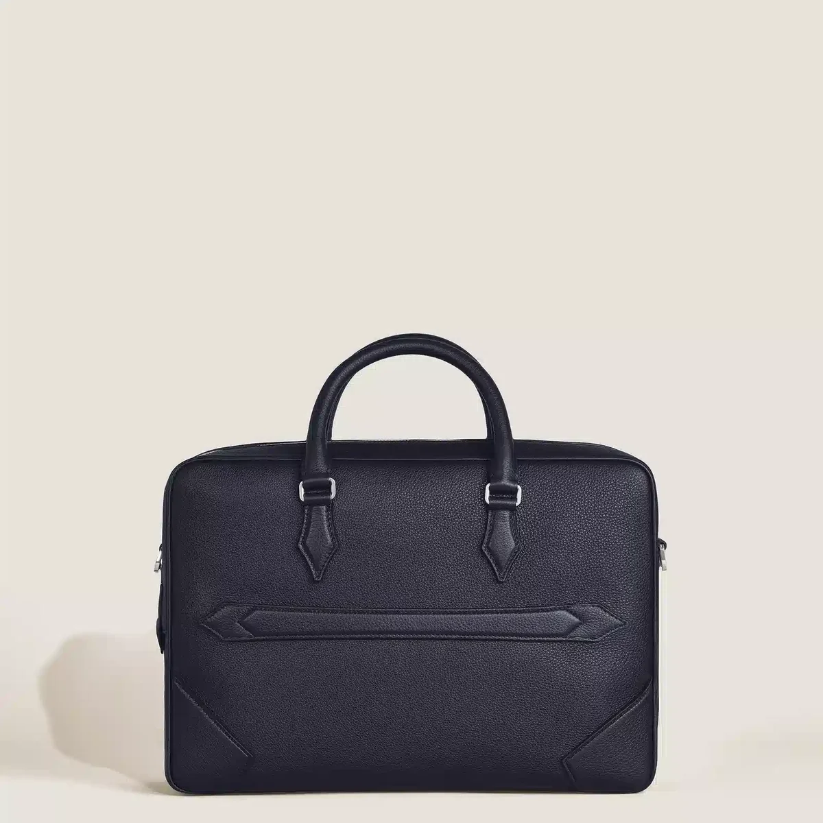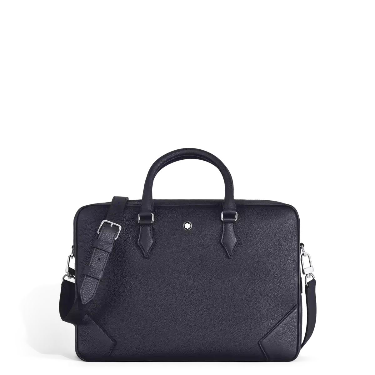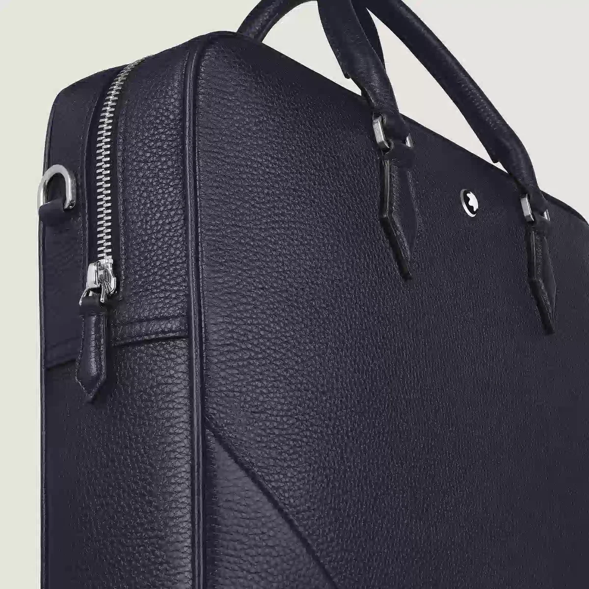 This elegant document case is crafted from a soft and granular leather in a deep midnight blue. Its nib-shaped details, such as stitching, zip pullers and handles, draw inspiration from the culture of writing. A removable strap and a satellite system allow different carrying options, while internal pockets support further organisation during business travels.
