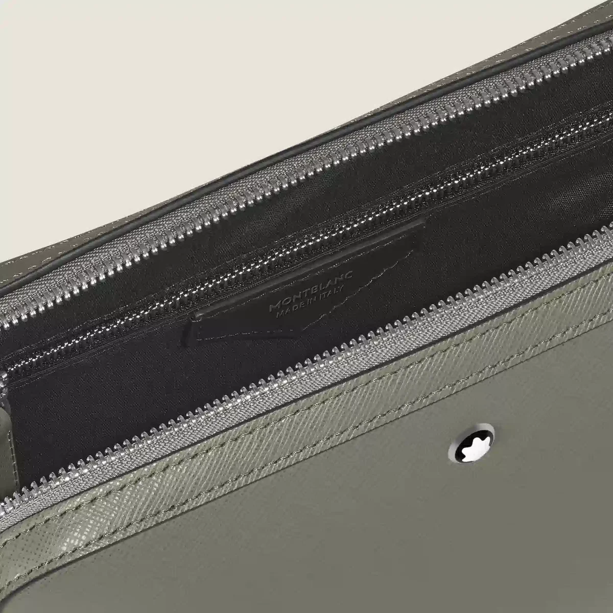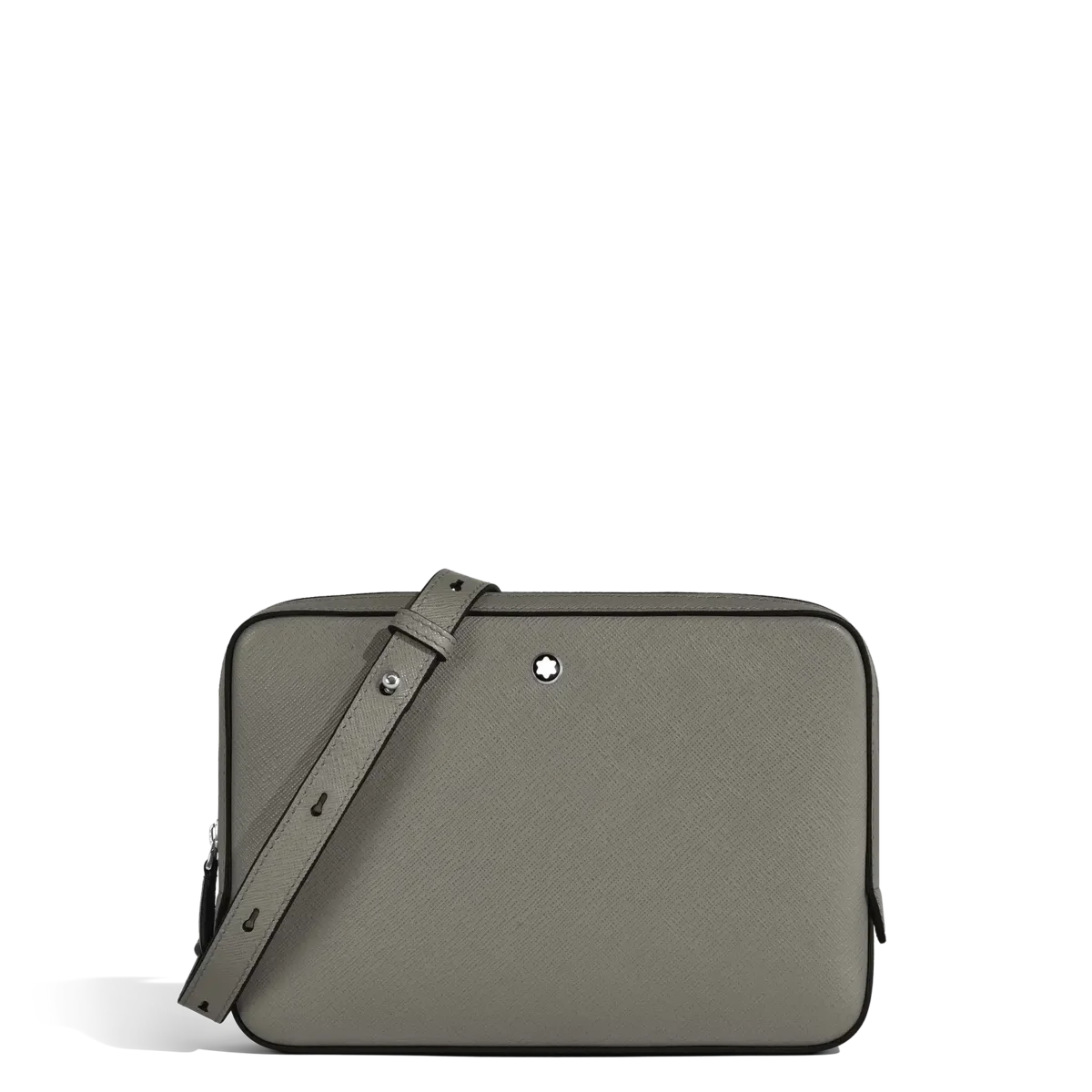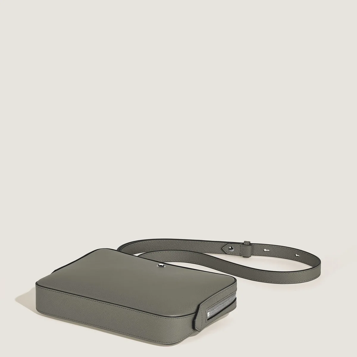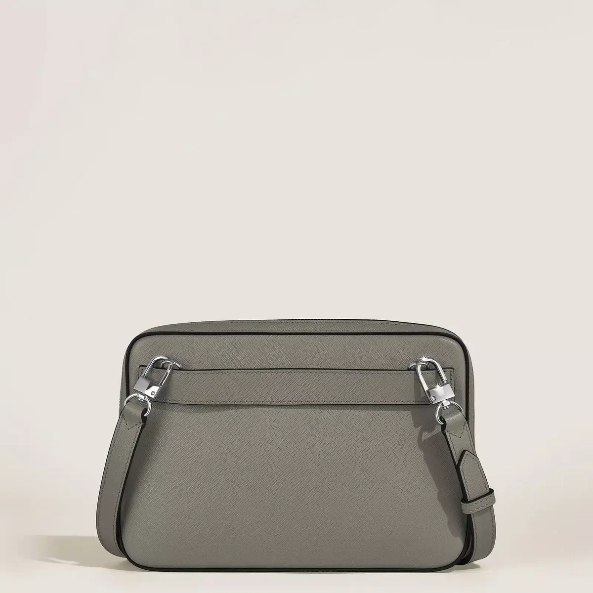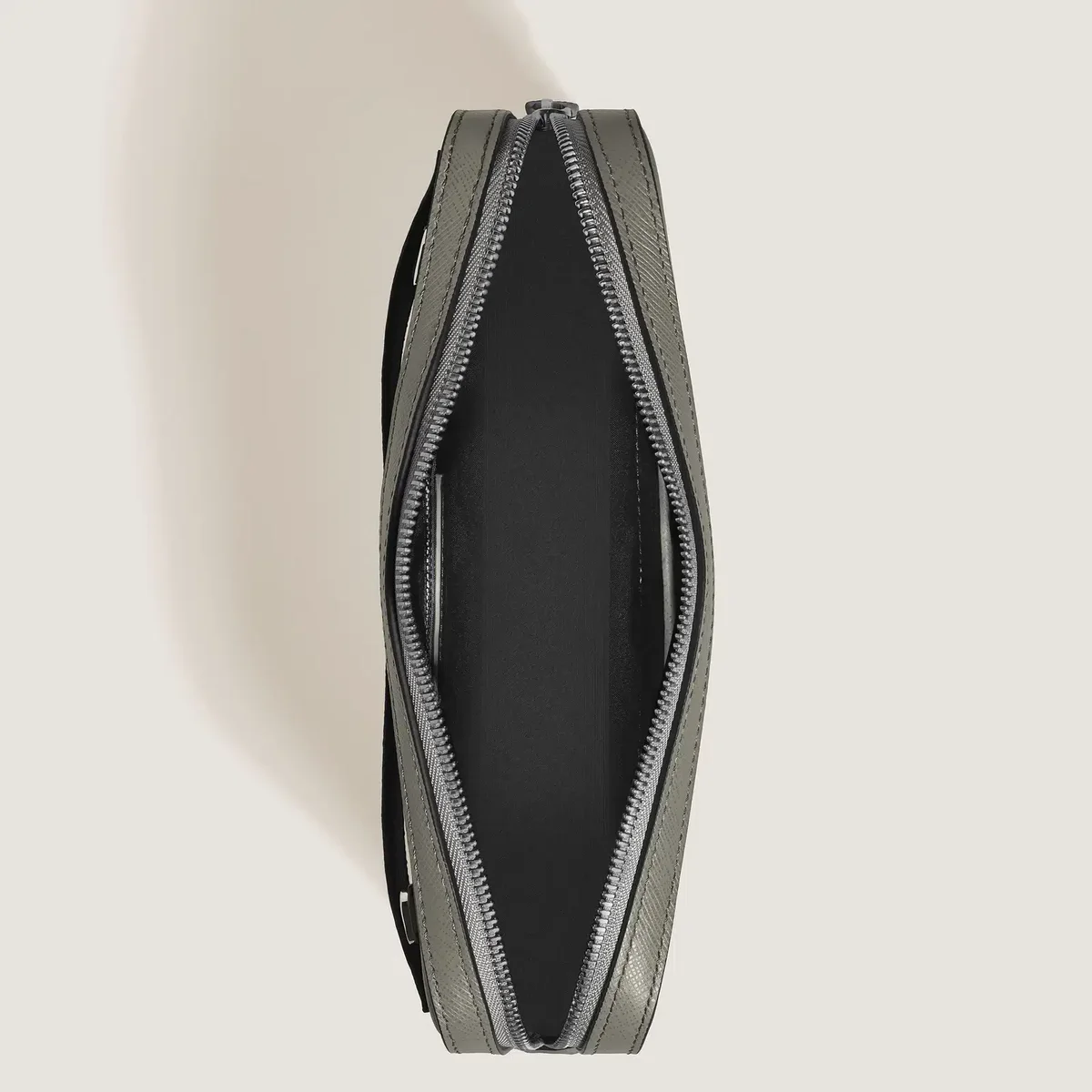 Inspired by the world of writing, this compact bag can be carried by hand or over the shoulder using its adjustable, detachable strap. Crafted in Saffiano-printed leather, its elegant medium grey colour adds a touch of sophistication while its roomy interior and internal open pocket hold space for the essential belongings of a day or night out in the city. For even further functionality, attach the accessory to larger bags using the leather band on the back.