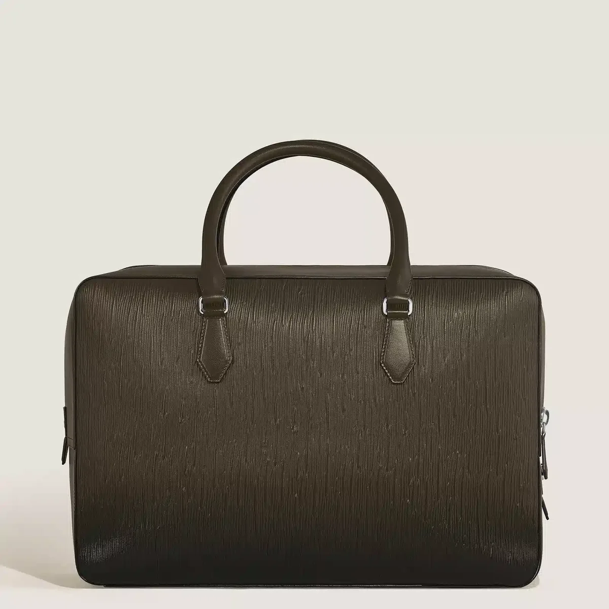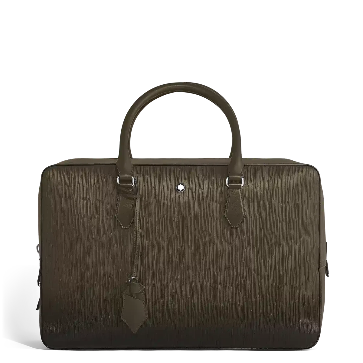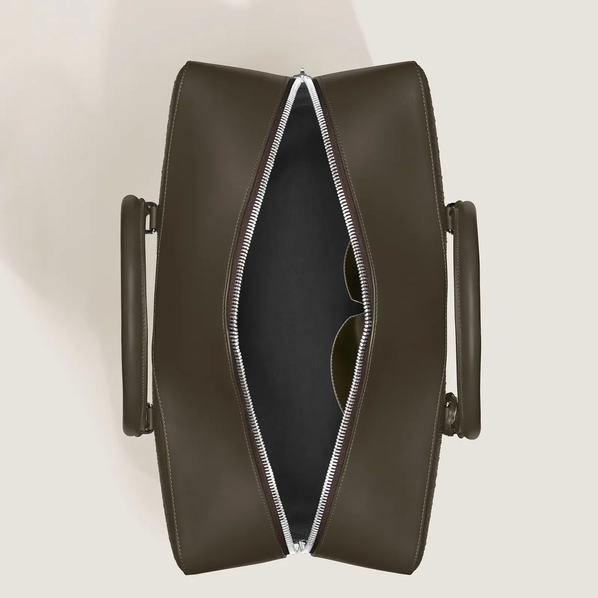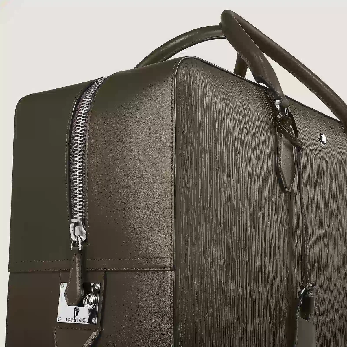 Part of the Ink line, this Montblanc 149 leather bag is is crafted in khaki Corteccia leather. Inspired by the texture of tree bark, the leather undergoes a meticulous process of embossing to create the bark motif, followed by a hand-applied sfumato effect, achieving a rich gradient that enhances its natural elegance. Designed for short trips and weekend getaways, the bag offers a spacious interior and a secure lock-and-key closure for peace of mind. Signature corner details, inspired by the silhouette of an ink bottle, pay homage to Montblanc’s writing heritage, making this a refined and functional travel companion.