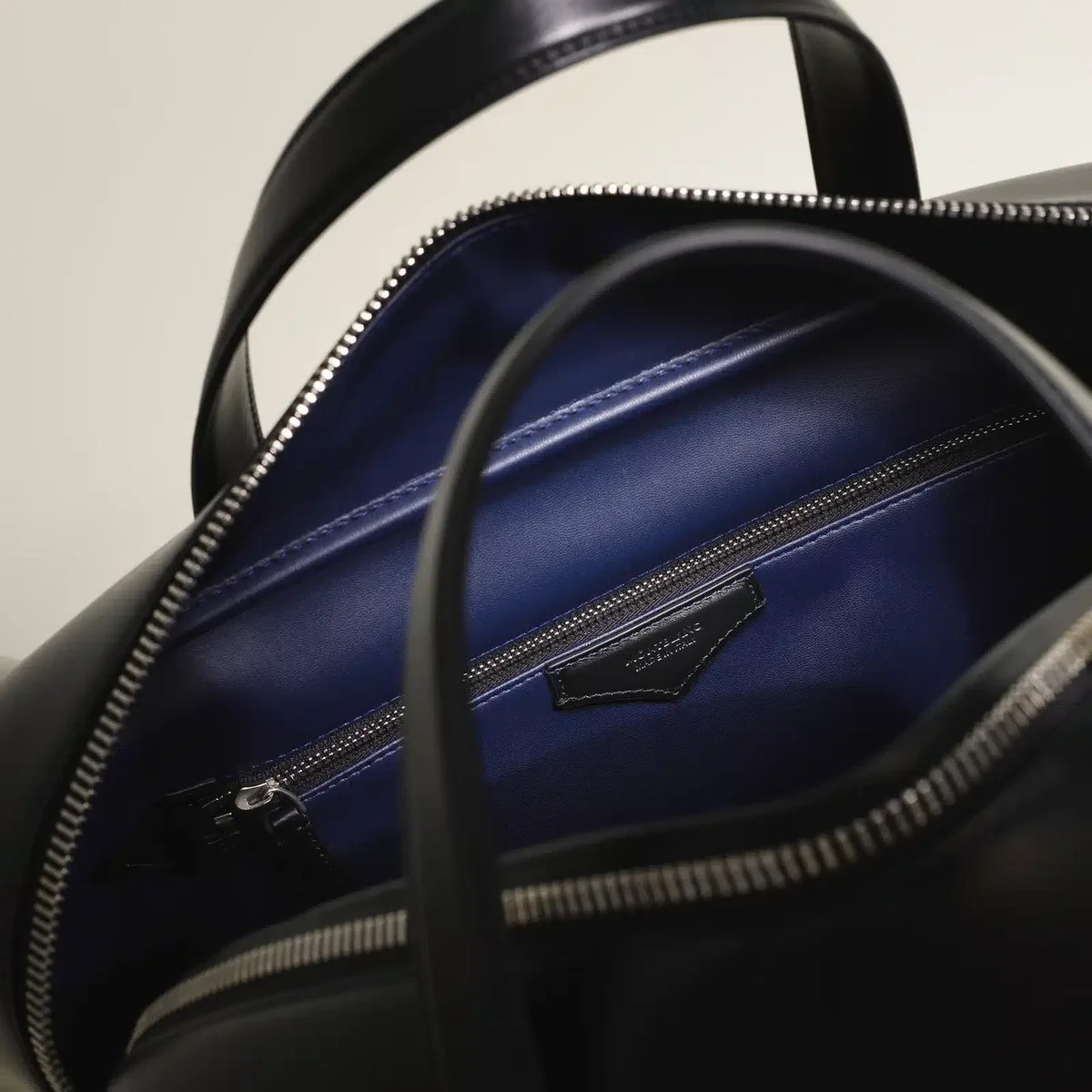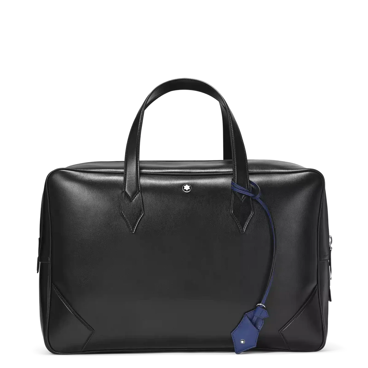 Inspired by the writing culture, the Meisterstück Duffle bag is suitable for short trips and weekends. Crafted from a new deep shine black leather, all its details speak the language of the nib: stitching, zip pullers, handles recall the shape of the nib, the essence of Montblanc. A bigger version of the logo lights up the bag. With a large capacity, it has a secure closure with lock and key.