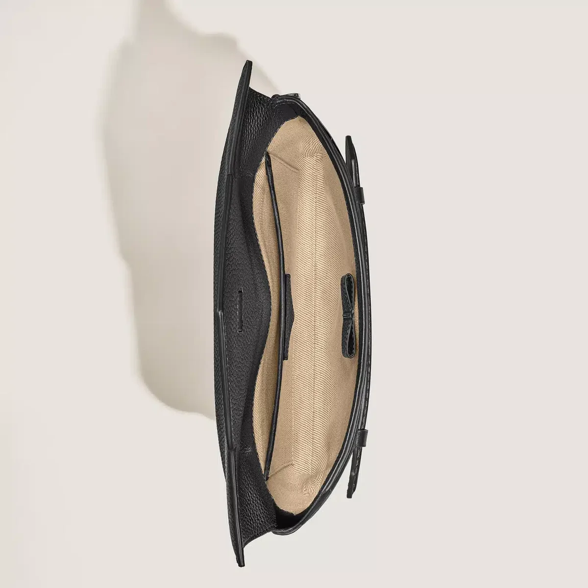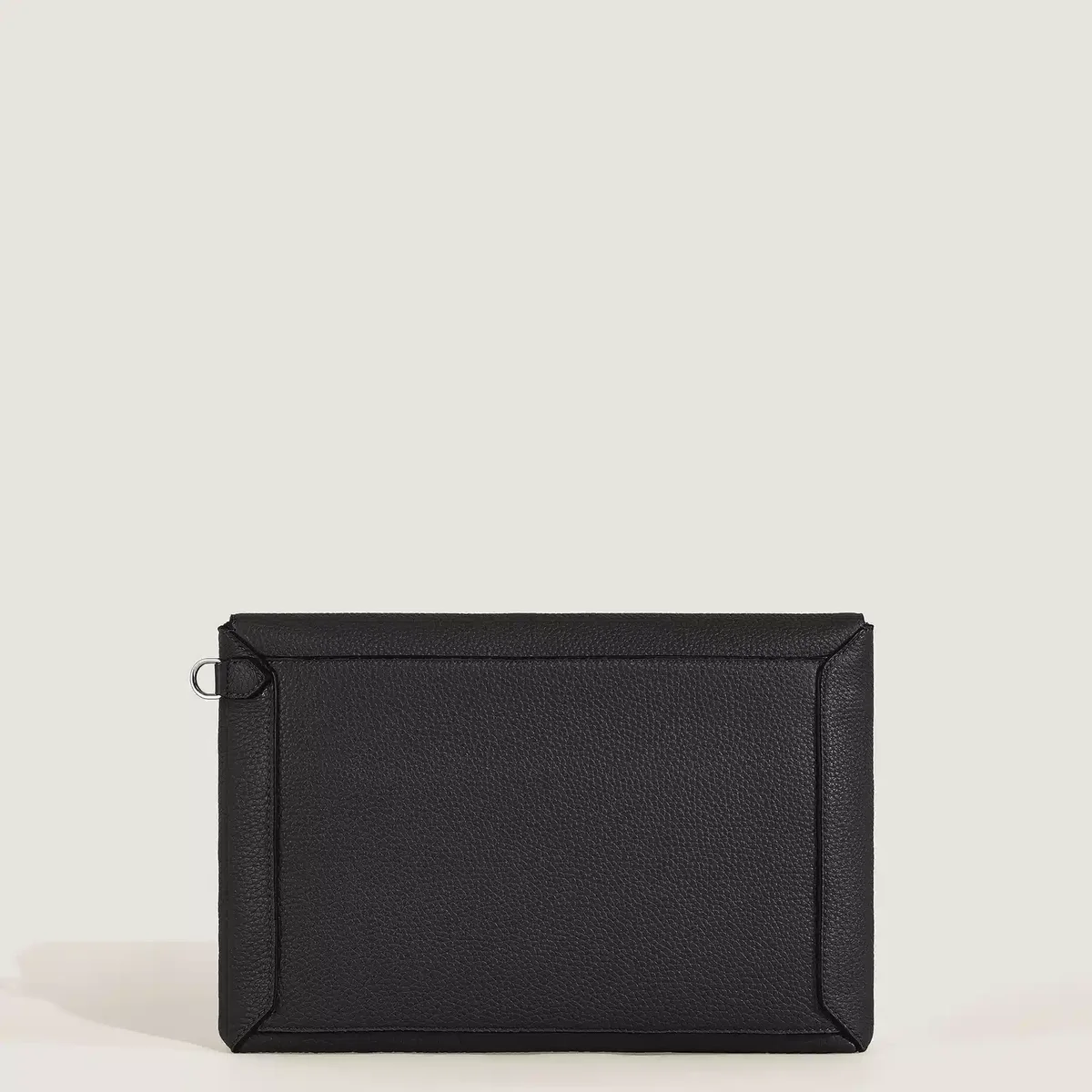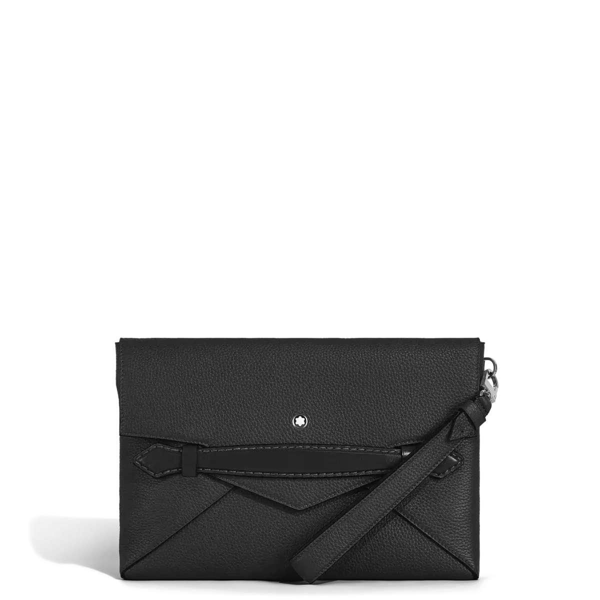 This clutch bag blends Montblanc’s writing with refined functionality. Its envelope-inspired design is crafted from black supple black grain leather, featuring saddle stitching that echoes the action of a pen tracing a dotted line. The unique nib-shaped front handle offers a comfortable way to hold the pouch in one hand, while a detachable wrist handle adds versatility. Inside, it includes a main compartment, an open pocket, and two writing instrument loops, complemented by a rear pocket for added practicality.