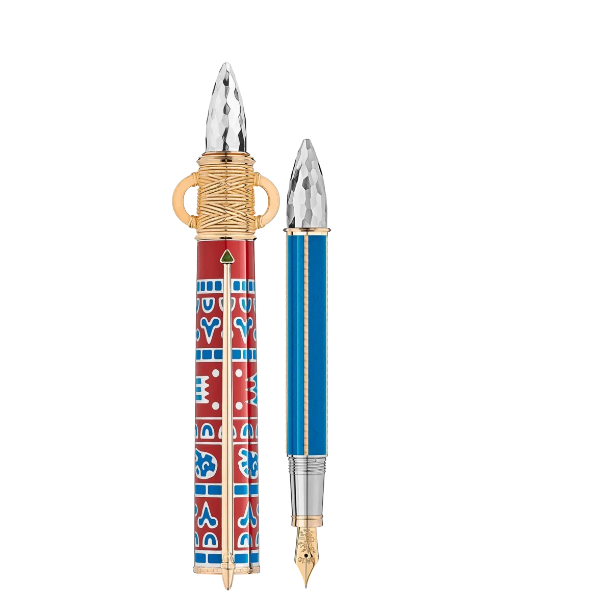 Moctezuma I was crowned ruler of the great Aztec Empire in 1440, thereby ushering in the golden age of the Aztecs. During his reign, he shaped the image of the Aztec state that we are familiar with today – a state rich in culture and mythology. The capital city Tenochtitlán, today’s Mexico City, blossomed under his rule. The Montblanc Patron of Art Homage to Moctezuma I Limited Edition 4810 with signature gold-coated fittings is dedicated to this supreme ruler of one of the most special cultures in world history. The overall design is inspired by an atlatl, an Aztec spear-throwing device. The shape of the cone, refined with a hammer finish, is based on an Aztec sacrificial knife with an obsidian blade. The lacquer colors – turquoise-coloured and carmine-coloured red – are inspired by the colors of the royal cloak. Lacquer inlays inspired by traditional signs and ornaments crown the cap. The handcrafted solid Au 750 gold nib is adorned with a fine engraving inspired of the Aztec glyph for the city of Tenochtitlán: a three-armed cactus with a royal diadem and two scrolls.