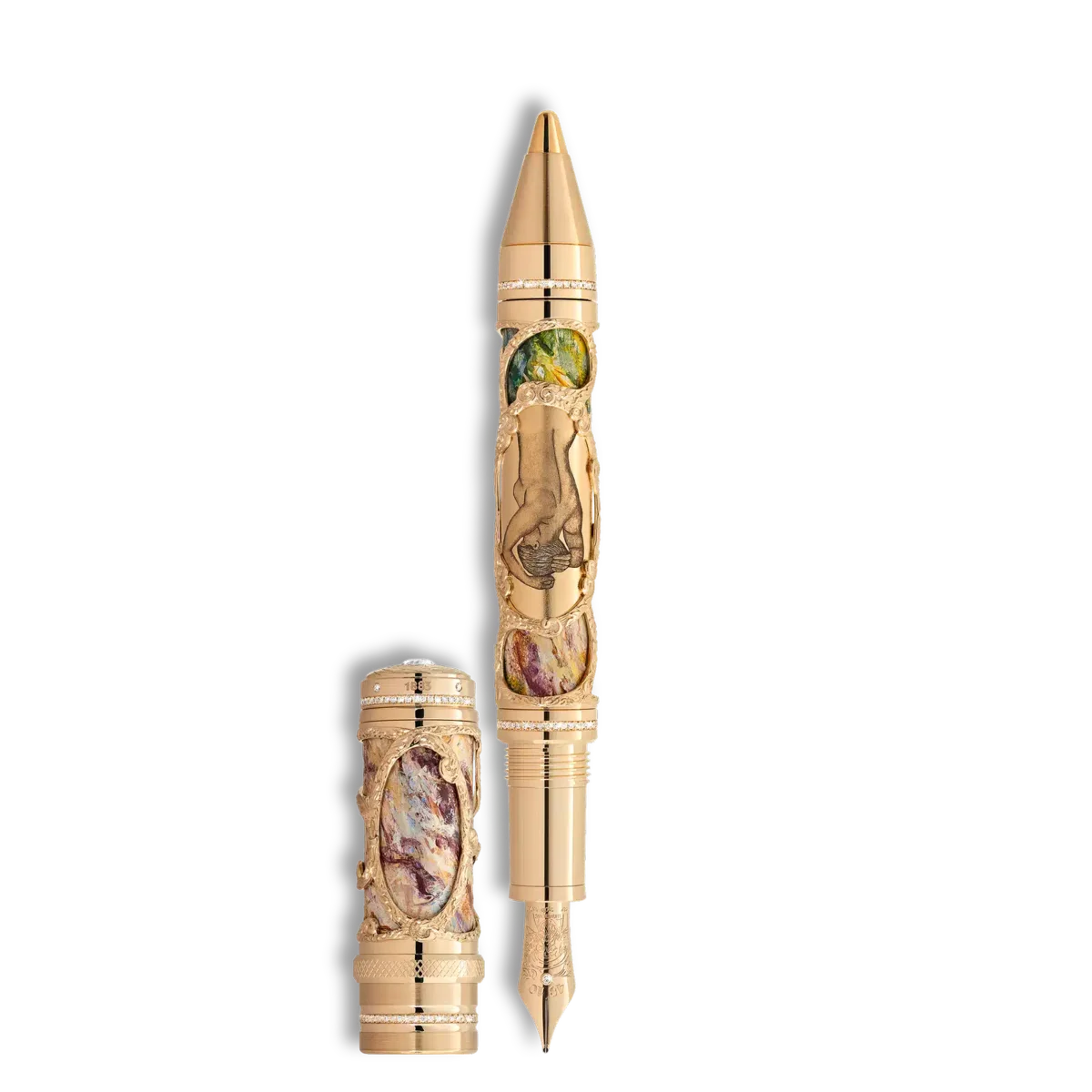 Great artists throughout history have expressed the human experience in a universal language of form and beauty. The Montblanc Masters of Art Collection honors their eternal contribution to the quest for perfection in art – a quest Montblanc both celebrates and participates in.Pierre-Auguste Renoir is one of the most prominent forerunners of modernism, whose sun-drenched paintings helped set the tone for an entire movement: Impressionism. Acknowledging with respect the pioneering achievement of this distinguished French Impressionist, Montblanc has created the Masters of Art Homage to Pierre-Auguste Renoir Limited Edition 8, inspired by the monumental The Great Bathers, a creative milestone in his ‘Ingresque’ period.The hand-painted lacquer on cap and barrel echoes the colours chosen for this painting, while the view of the back of the girl bathing in the foreground is selected as the central figure on the barrel, as an artfully hand-engraved solid Au 750 gold inlay created using the scrimshaw technique. The finely worked depiction is enhanced by an intricate hand-engraved solid Au 750 gold overlay in the look of a vintage picture frame.As if to underline the artistic ambition and atmosphere of Renoir’s The Great Bathers, the fittings of the richly ornamented cap are adorned with rings of brilliant-cut diamonds. In tribute to the virtuosity of Renoir’s nuanced use of the brush to apply paint – vigorous, sweeping movements for expansive surfaces and delicate, feather-light touches for the contours of a face – the clip takes the form of two brushes, the tip of the flat one seemingly still coated in blue, as if just laid aside by the artist upon completion of one of his masterpieces. The cap top ring bears the engraving 1883, marking the beginning of Renoir’s reorientation towards his ‘Ingresque’ period. Crowning the cap is a Montblanc diamond whose outline is echoed in the engraved guilloche pattern of its solid Au 750 gold setting. As a tribute to Renoir’s drawing skills, a tip made of soft solid Au 999 gold is integrated into the cone of the edition, giving the holder the means to create sketches of their own using the metal point technique.The hand-crafted solid Au 750 gold nib is adorned with a diamond and an engraved image borrowed from one of Renoir’s last self-portraits from 1899.
