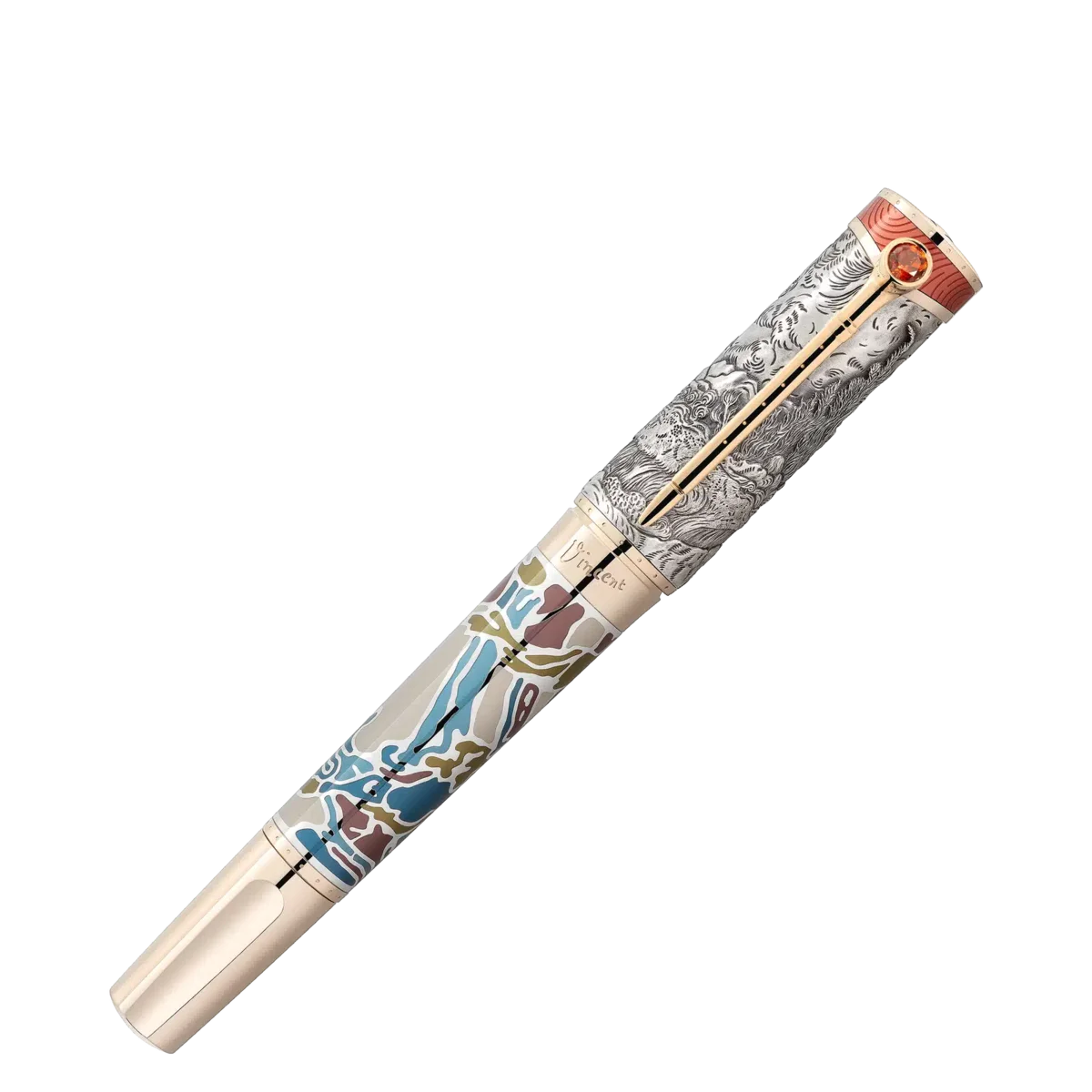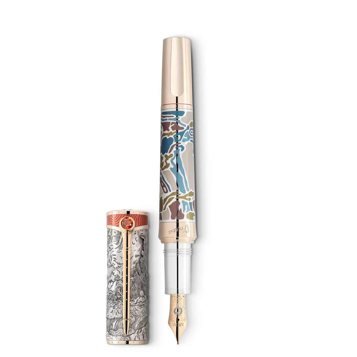 With the Montblanc Masters of Art Homage to Vincent van Gogh Limited Edition 161, Montblanc celebrates Vincent van Gogh, one of the most popular painters of the late 19th century. This edition especially emphasises his time in Saint-Rémy-de-Provence and Auvers-sur-Oise with design details reflecting among others his last work he created, Tree Roots. In Saint-Rémy and Auvers-sur-Oise, Van Gogh perfected his ability to paint natural scenes as viewed through the lens of his emotions. Wheatfield and Cypresses is one such painting, showing an impetuous sky over a landscape full of movement. Van Gogh painted this view from the asylum in Saint-Rémy three times. His drawing of the same view, made with pencil, reed-pen and pen and ink, is interpreted in the engraving on the Ag 925 sterling silver cap.The engraved 1890 on the barrel ring – next to Vincent’s signature in blue – commemorates the year he drew his last painting, Tree Roots. The Ag 925 sterling silver barrel is decorated with lacquer inlays derived in their design and colours from Tree Roots, which depicts a group of trees with their roots exposed by erosion on the side of a hill. Van Gogh developed a looser, freer style and becoming equally competent with brush and palette knife – which he used for chunky, impetuous “impasto” work. His palette knife inspired the clip, while his sweeping brushwork is immortalised in the lacquer of the cap top. Furthermore, his fondness for pipe smoking, to which he referred in many of his self-portraits, is captured in a subtle detail of the clip: the upper part is shaped like a pipe’s bowl and decorated with a Citrine. As homage for Vincent’s fascination of traditional Japanese woodblock prints, the overall shape is inspired by a Japanese woodcutting knife. The way that Van Gogh found inspiration in Japanese art demonstrates the universality of art and artistic concepts such as the Golden Cut, or 1.61 (Phi), which not only served as inspiration for the embossing of the Phi symbol on the handcrafted, solid Au 750 gold nib, but also for the limitation to 161 pieces.Van Gogh’s many creative impulses are symbolised in the facets of blue lacquer crowning the cap top. Embedded in this blue field like one of Vincent’s bright stars – an image found repeatedly in his works – is the Montblanc emblem in solid Au 750 signature gold. With signature gold and/or signature gold-coating, Montblanc evokes the enlightened shade of yellow gold which has become an appreciated tone for the Maison’s writing instruments.