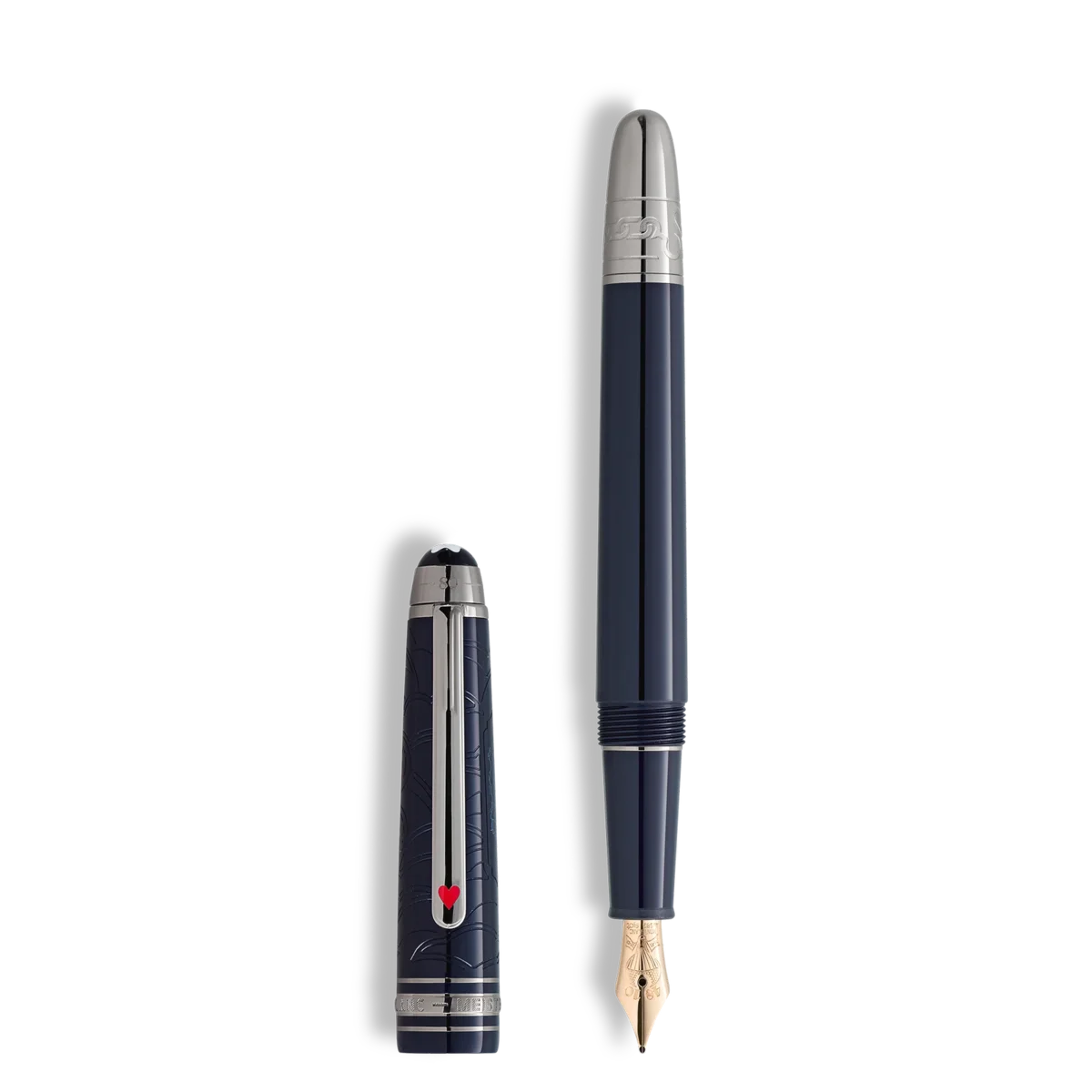 The Meisterstück Around the World in 80 Days collection draws its inspiration from Jules Verne’s renowned adventure novel. The Classique Fountain Pen, adorned in dark blue precious resin, recounts the epic journey of Mr. Fogg and Passepartout. Embarking on the final leg from Yokohama back to London via the United States, the duo traverses the vast American continent by train. Delve into the intricate details – a train elegantly lasered on the cap, a safety chain pattern on the cone, mirroring a pivotal moment when Passepartout detaches the train from the locomotive to save the crew who was attacked by Sioux.The cap’s design captures pressure valves and the billowing smoke of the locomotive, while the clip boasts a red lacquered heart card suit, symbolizing the union between Phileas Fogg and Princess Aouda. Additionally, card suits represent Fogg’s daring wager to complete the journey in a mere 80 days. The cap top bears the embossed timeline of the journey – 36 days from Yokohama to London, culminating in the grand total of 80 days around the world.Elevating this writing instrument is a hand-crafted 14K gold nib marked with 14/11 and 21/12 – a reminder of Mr. Fogg’s departure from Yokohama on November 14 and his ambitious plan to return to the London club by December 21 to win the wager. It is also adorned with a depiction of a hot air balloon, reference to Jules Verne’s first adventure novel.