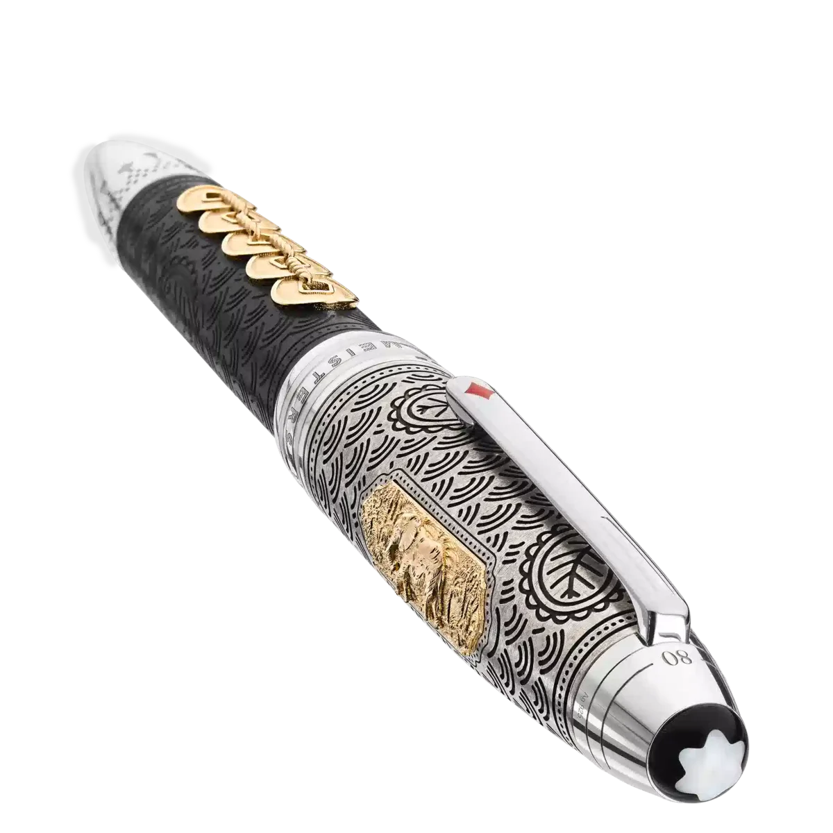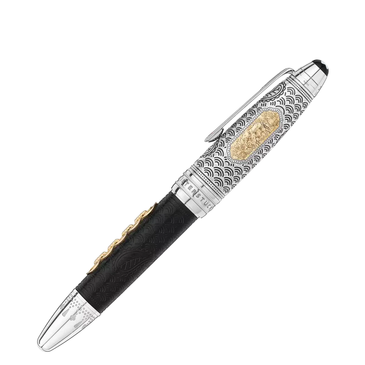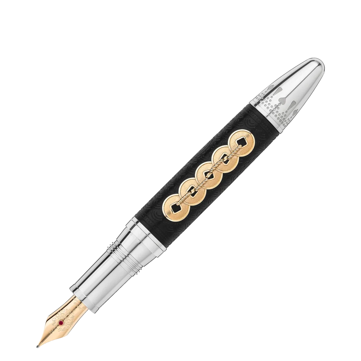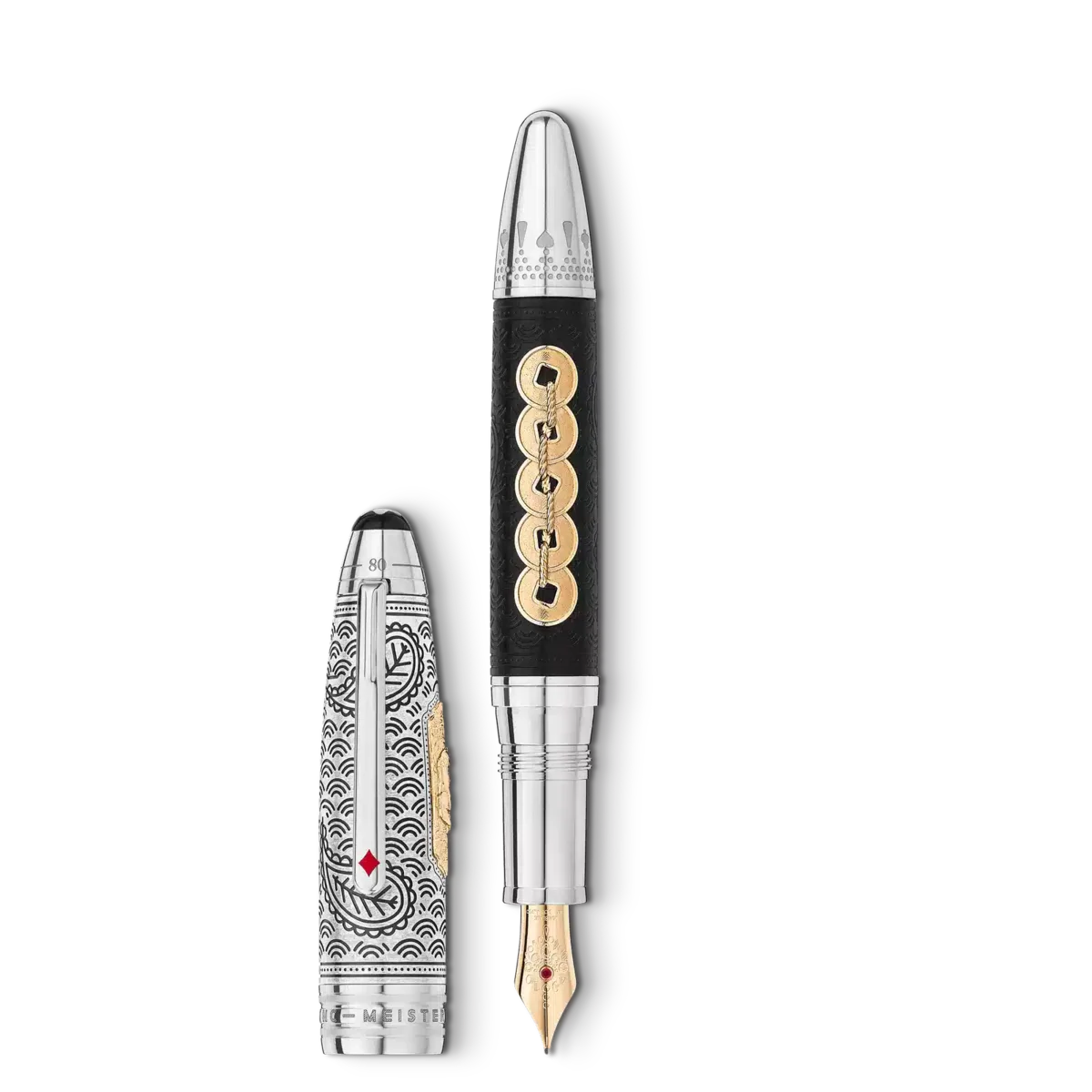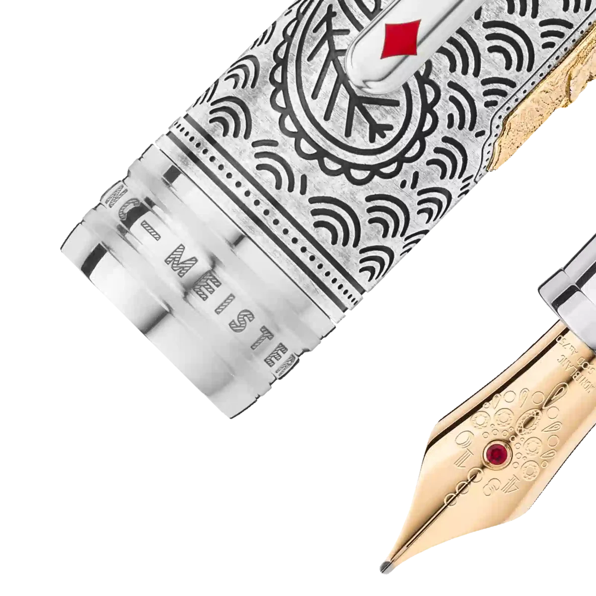 The Meisterstück Around the World in 80 Days collection is inspired by the famous adventure novel by Jules Verne. The Limited Edition 811 Fountain Pen in black stained ebony wood, draws on the second leg of the journey from Bombay to Yokohama. Wood is chosen to pay tribute to when Mr. Fogg saves Princess Aouda from being forced to commit suttee. The wooden barrel is inlaid with an Au750 / 18k solid gold inlay representing the 5 coins of the Qing dynasty. The main characters travel in this part of the adventure on a majestic elephant through the jungles of India, which is depicted on the AU750 / 18k solid gold cartouche inlaid on the Ag 925 sterling silver cap. The cap and the barrel feature an engraved pattern with good luck symbols. The clip features a red lacquered diamond card suit and the cone is engraved with a pattern and card suits, representing Mr. Fogg wager to make the journey in 80 days. The cap top is embossed with the length of the journey, 25 days from Bombay to Yokohama and 80 days in total. The writing instrument is finished with a hand-crafted 18K gold nib garnished with a ruby and jewelry motive of Princess Aouda.