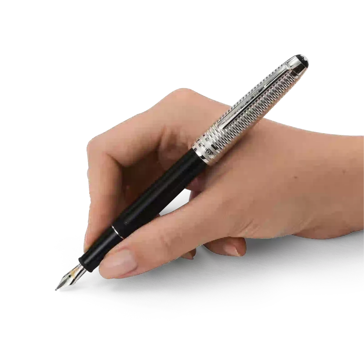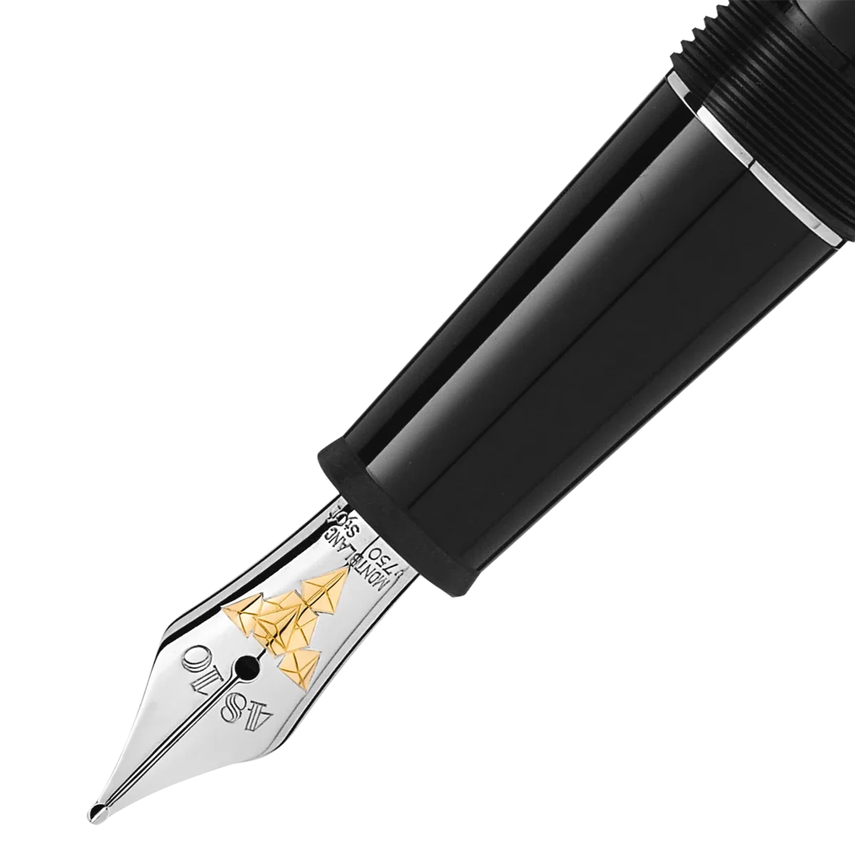 The Meisterstück Solitaire Geometric Dimension was born of the desire to unite Montblanc’s classic design with unique materials. This writing instrument made of black precious resin, engraved with a three-dimensional geometric pattern cap with optical effect in a sophisticated platinum tone, features an Au750 bi-color coated nib with special design, a platinum-coated clip and three platinum-coated rings embossed with the Montblanc brand name. Finished with the Montblanc emblem, it appeals to one’s individuality.
