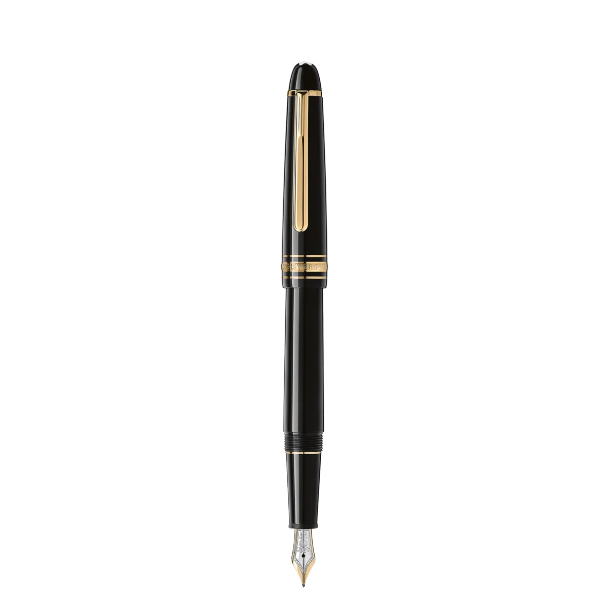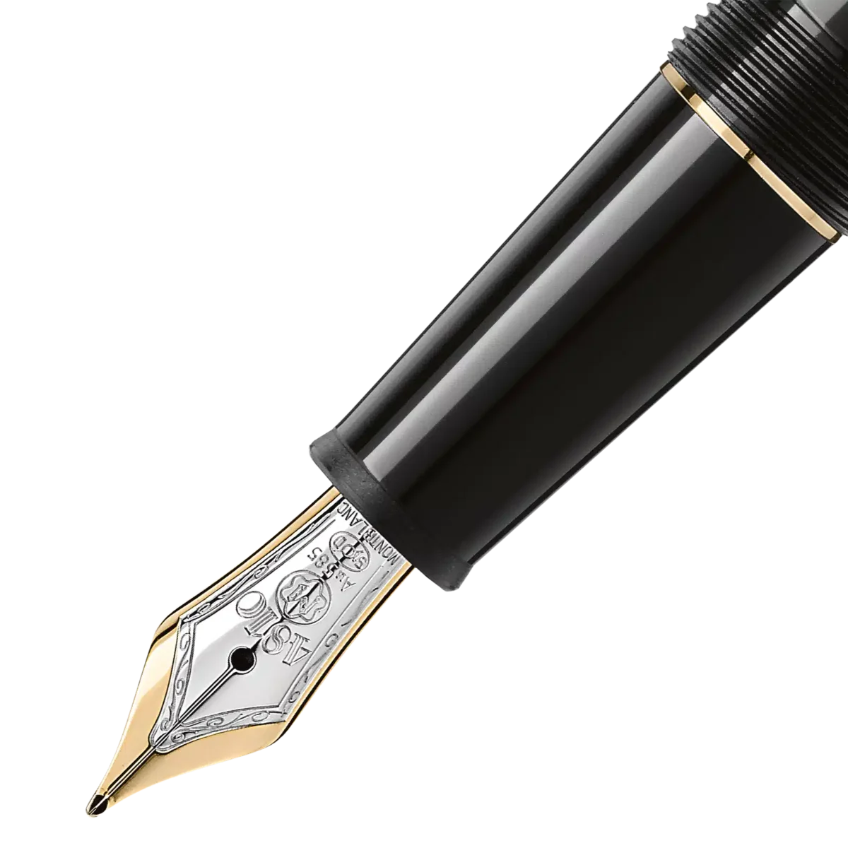 The Meisterstück Gold-Coated Classique Fountain Pen evolves into Montblanc’s design icon. Cap and barrel are crafted in black precious resin inlaid with a white Montblanc emblem. Three gold-coated rings with embossed Montblanc lettering and a gold-coated clip with individual serial number emphasize the timeless design of the Meisterstück Classique Fountain Pen. This gold-coated fountain pen is designed with a piston converter, allowing for optional use of ink cartridges, and a handcrafted Au585 gold nib with rhodium-coated inlay. To express your personality, Montblanc offers a gratuitous engraving of names or initials.