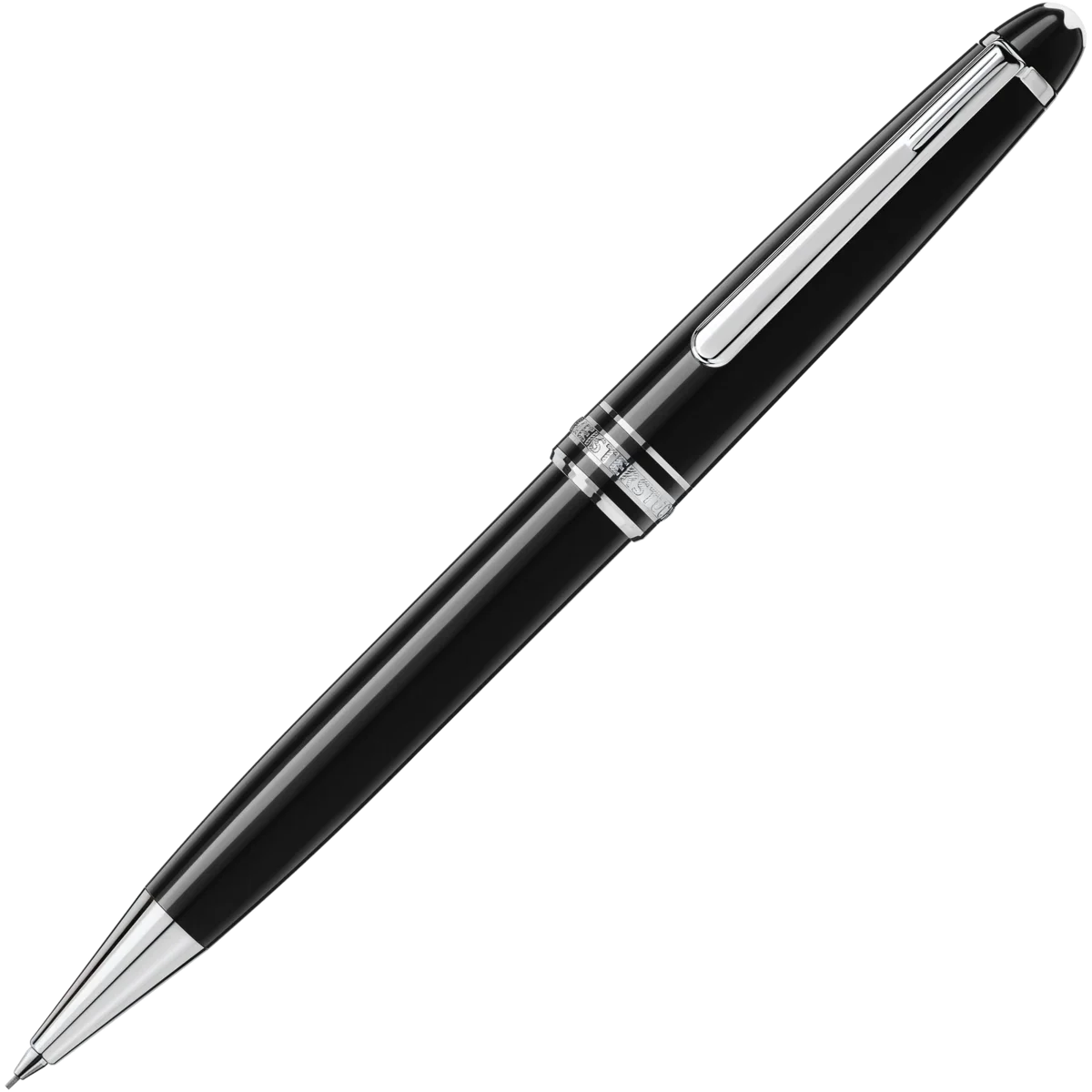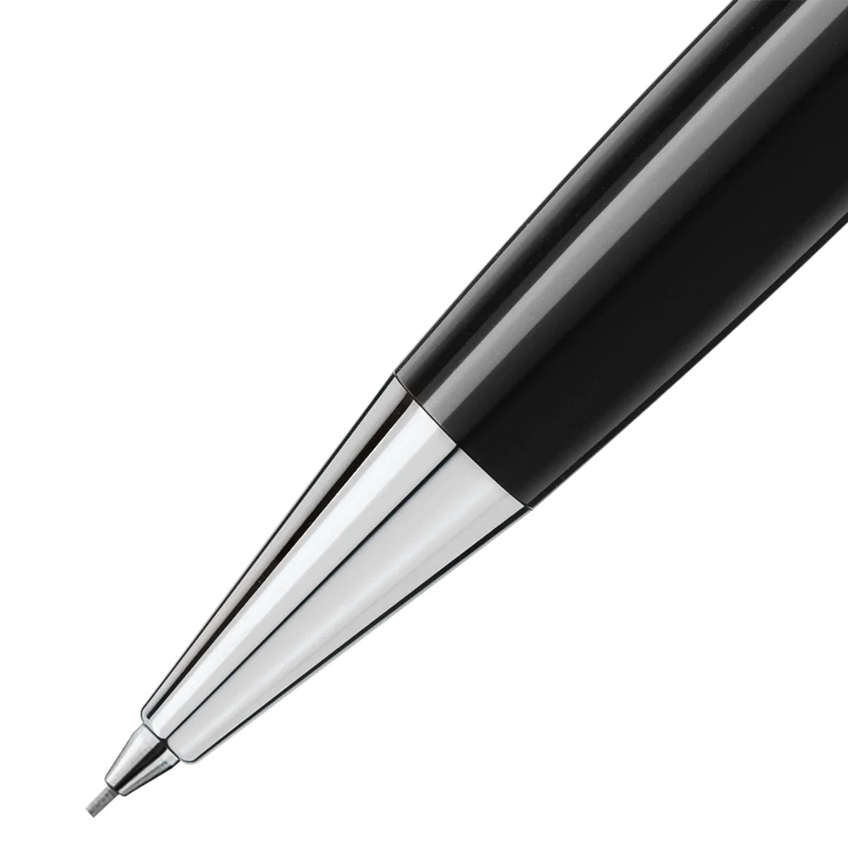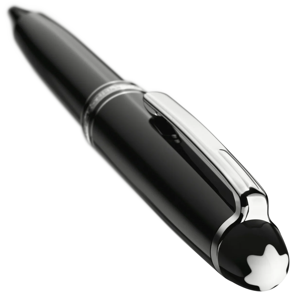 The Meisterstück Classique in deep black precious resin with elegant platinum-coated details, surmounted by the white Montblanc emblem, evolves into a distinctive design icon.