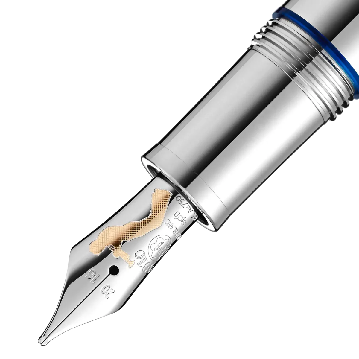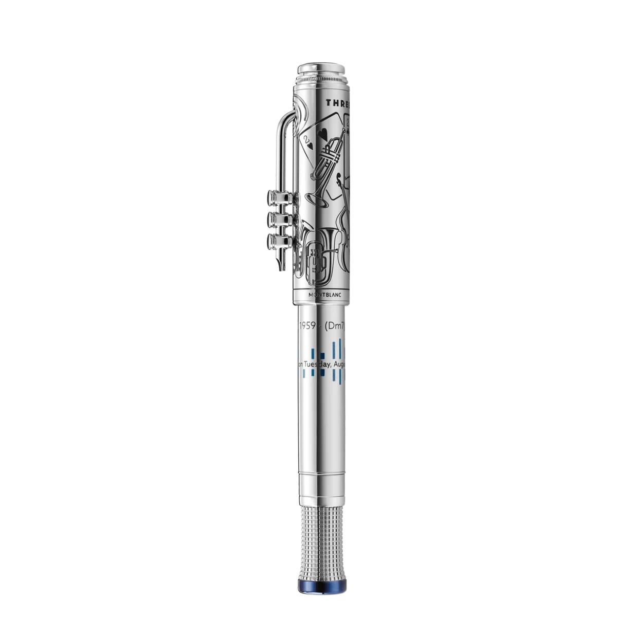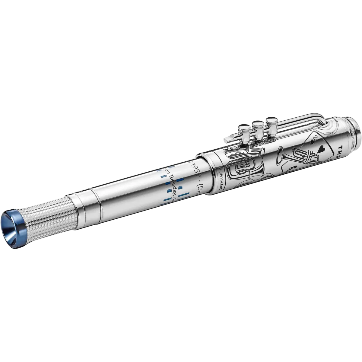 This Great Characters Edition honors one of the most revolutionary and influential jazz musicians of all time – Miles Dewey Davis. He was not only a trumpeter with an outstanding sound but a pioneer in virtually every phase of the evolution of post-WWII American jazz, from cool jazz up to the rock-jazz-funk fusion that led to his induction into the Rock & Roll Hall of Fame. The overall shape of the Limited Edition 1926 reflects the trumpet, emphasized through the trumpet finger buttons on the clip. The unique refined engraving on the barrel is inspired by the major phases of evolution in post-WWII American Jazz, which Miles Davis influenced. The blue cone recalls “Kind of Blue”, the greatest jazz album of all time. The shape of the cone stems from the special “Heim” mouthpiece he used to play. The nib is engraved with his silhouette and the limitation of 1926 pieces reflects the year of his birth.
