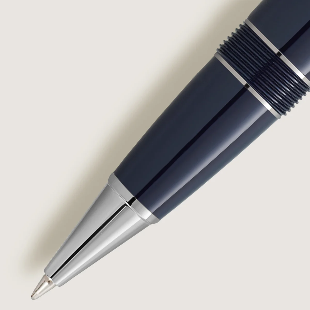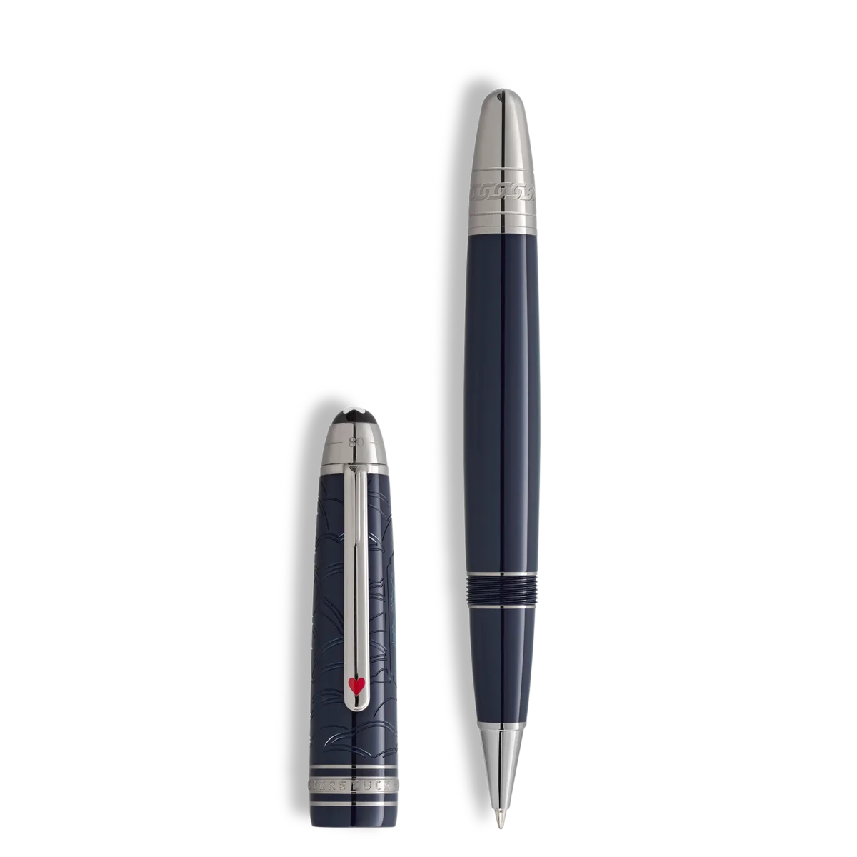 The Meisterstück Around the World in 80 Days collection draws its inspiration from Jules Verne’s renowned adventure novel. The LeGrand Rollerball, adorned in dark blue precious resin, recounts the epic journey of Mr. Fogg and Passepartout. Embarking on the final leg from Yokohama back to London via the United States, the duo traverses the vast American continent by train. Delve into the intricate details – a train elegantly lasered on the cap, a safety chain pattern on the cone, mirroring a pivotal moment when Passepartout detaches the train from the locomotive to save the crew who was attacked by Sioux.The cap’s design captures pressure valves and the billowing smoke of the locomotive, while the clip boasts a red lacquered heart card suit, symbolizing the union between Phileas Fogg and Princess Aouda. Additionally, card suits represent Fogg’s daring wager to complete the journey in a mere 80 days. The cap top bears the embossed timeline of the journey – 36 days from Yokohama to London, culminating in the grand total of 80 days around the world.