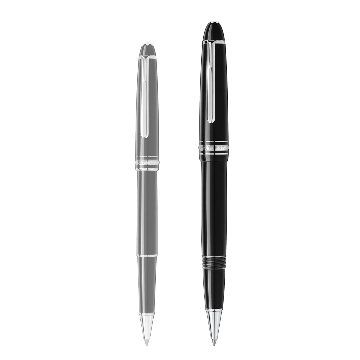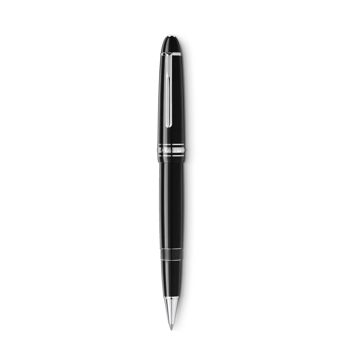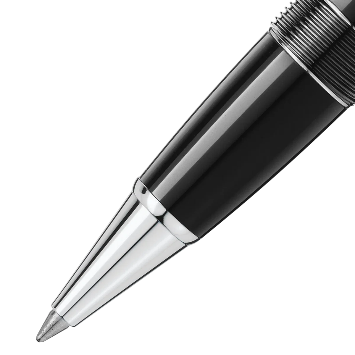 The Meisterstück LeGrand in deep black precious resin, with elegant platinum-coated details, surmounted by the white Montblanc emblem, evolves into a distinctive design icon.