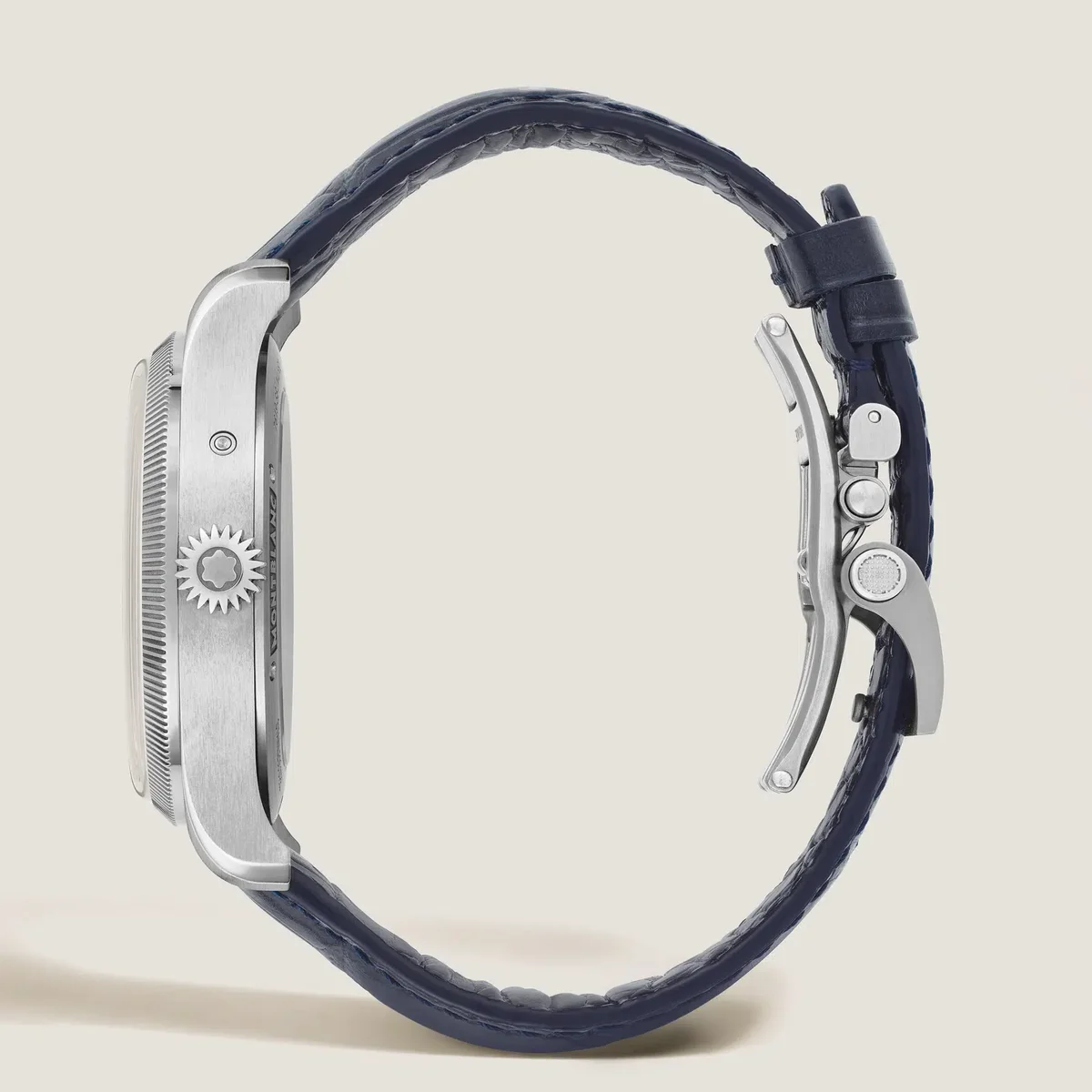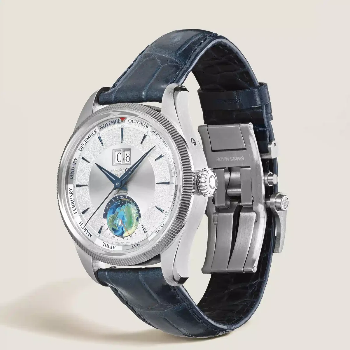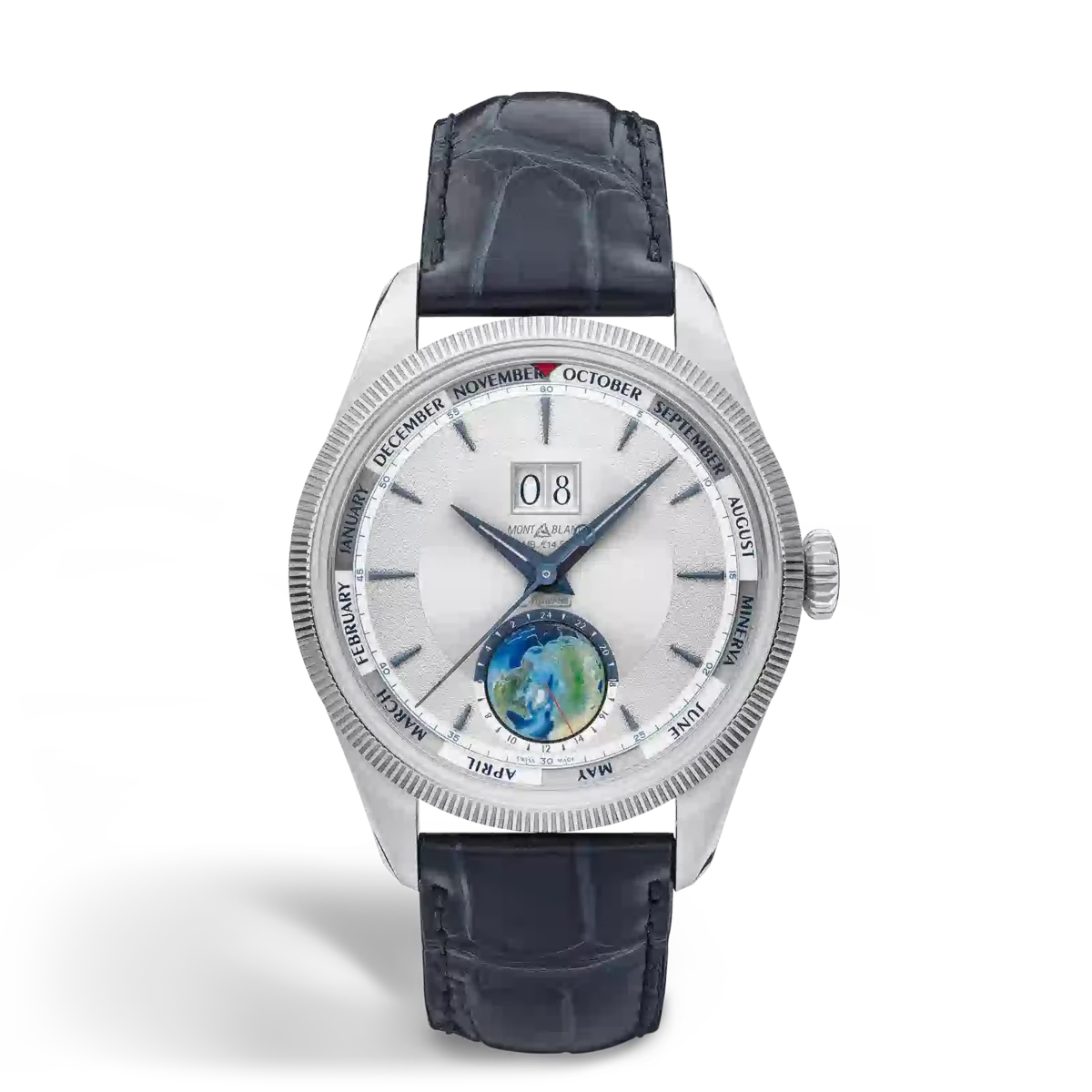The Montblanc 1858 Annual Calendar Geosphere Limited Edition is inspired by the aesthetic codes from Minerva’s heritage in the 1950s with its silver-white colored sunray and grained dial with blue-coated hands and indexes. The 42 mm stainless steel case is fitted with a white gold 750/1000 (18 karats) fixed fluted bezel inspired by Minerva’s historic timepieces. The timepiece is powered by a Manufacture hand-finished manually wound calibre MB M14.58, featuring an annual calendar, a large date and a worldtimer function. For the annual calendar functions, the large date is positioned at 12 o’clock and features two large apertures positioned side-by-side while the months are displayed around the dial’s periphery. The visual focal point of this timepiece is without a doubt it’s hand-painted, three-dimensional, rotating globe featuring the Northern Hemisphere with Day & Night indication and a 24-hour scale. The timepiece is completed with a blue interchangeable calf leather strap with alligator print and a stainless steel triple-folding clasp with fine adjustment system.