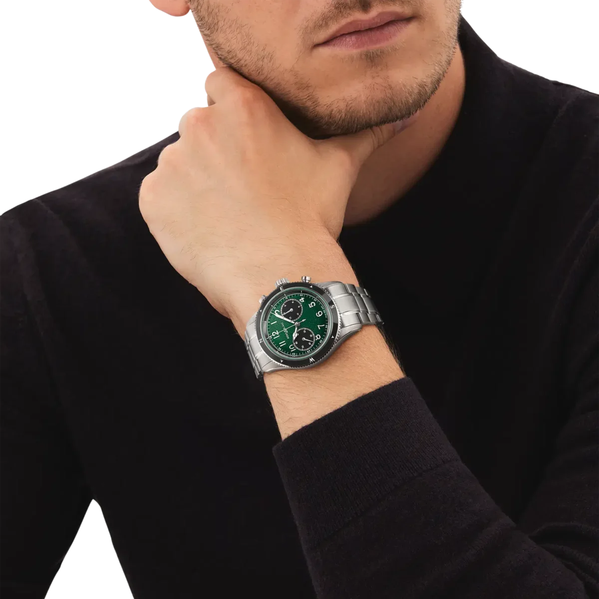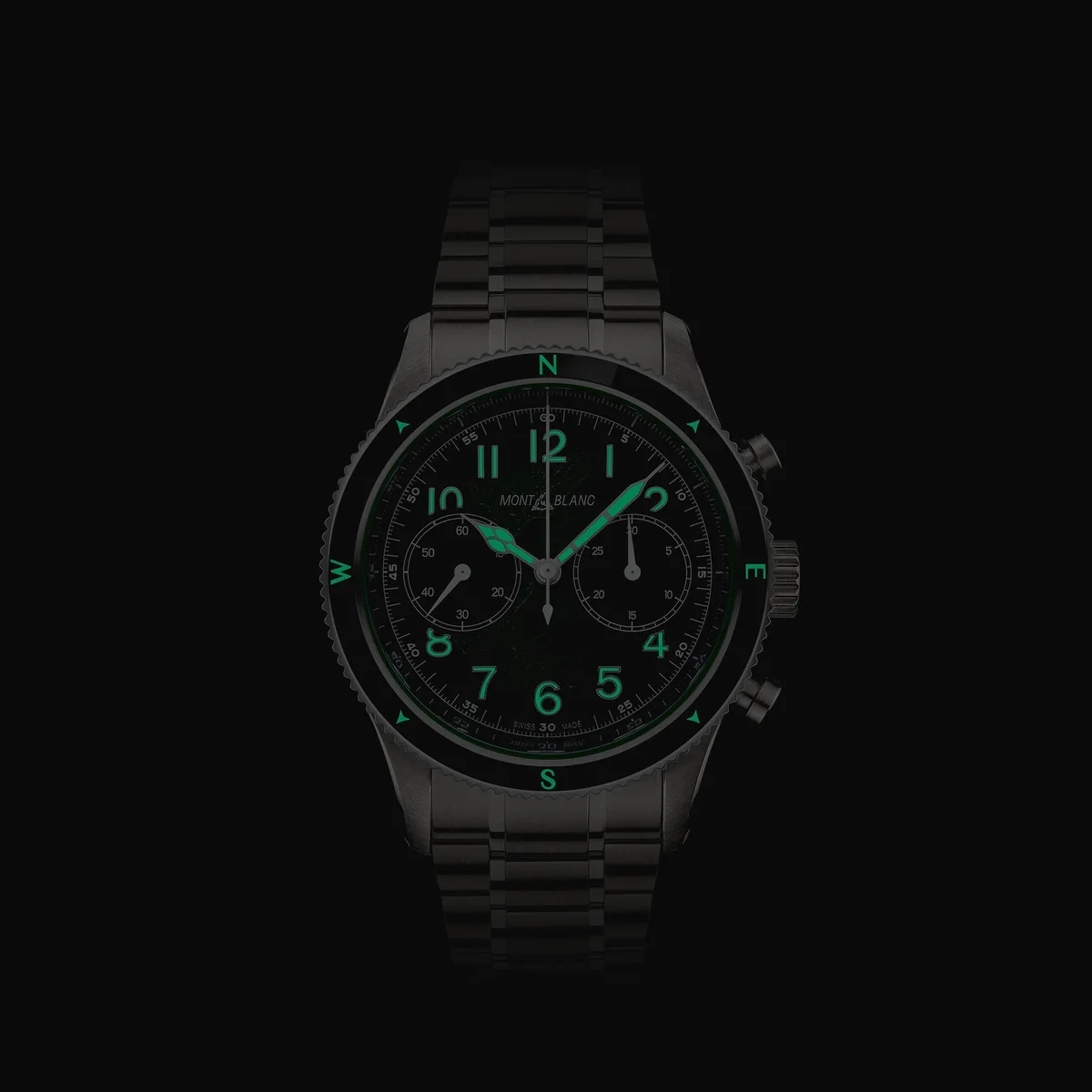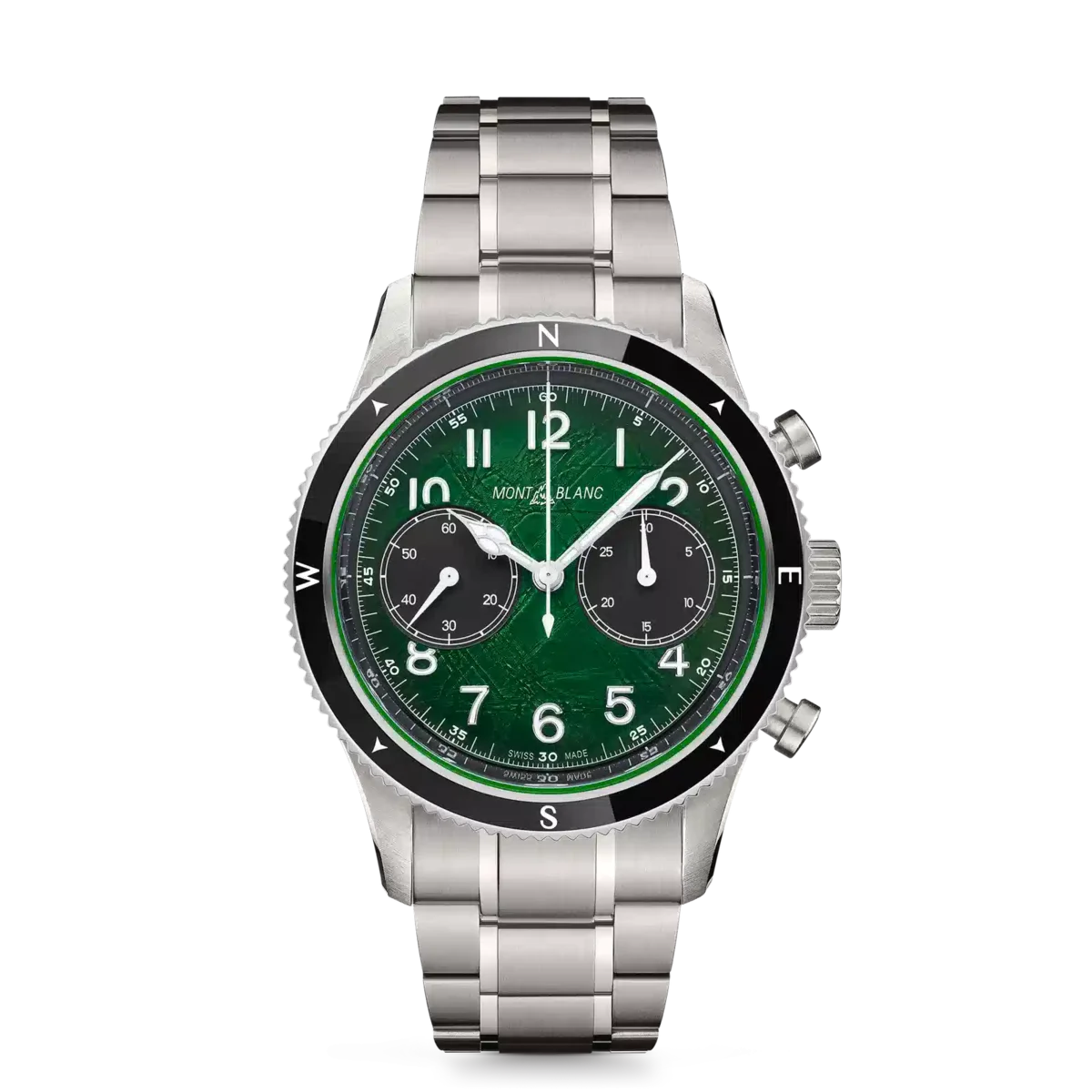 Capturing the spirit of mountain exploration and the beauty of Antarctica’s glacial landscape, the sfumato green glacier pattern dial of this Montblanc 1858 Automatic Chronograph 0 Oxygen is inspired by the deep green colour of the emerald icebergs or “jade bergs”. The timepiece is housed in a 42 mm stainless steel case totally devoid of oxygen. The dial is adorned with a bi-compax chronograph configuration with a black small seconds display at 9 o’clock and a black 30-minute chronograph counter at 3 o’clock. Matching the sub dials, this timepiece comes with a black bi-directional ceramic bezel with luminescent cardinal points. It is fitted with an interchangeable stainless steel bracelet with taper and fine adjustment system and an engraved case back featuring the “Spirit of Exploration” special engraving.