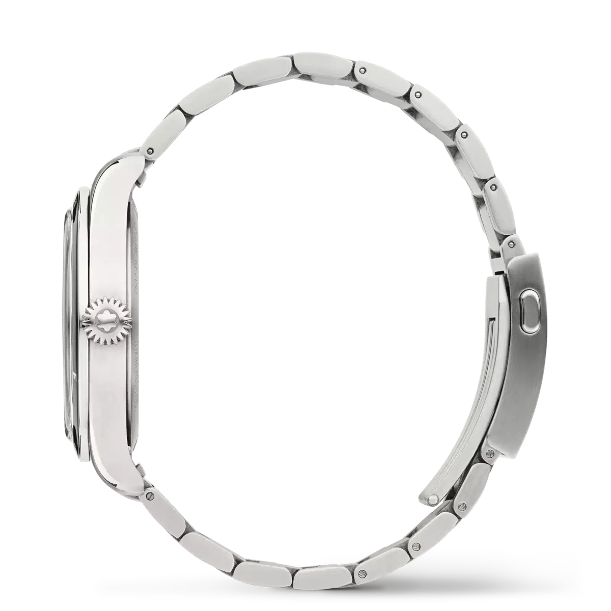 Paying tribute to the world’s highest peaks and the alpinists who dare to climb them enduring extreme conditions, the Montblanc 1858 Automatic Date 0 Oxygen The 8000 is housed in a 41mm stainless steel case totally devoid of oxygen. This has several advantages for explorers by eliminating fogging and preventing oxidization, thus allowing the movement to last far longer with greater precision. The timepiece is powered by the automatic caliber MB 24.17 and comes with a black ceramic bezel with luminescent cardinal points, a dark gray sfumato glacier patterned dial with orange accents, blue luminescence and a case back featuring an engraving of the “Spirit of Exploration”. Like the other models in this capsule collection, The Montblanc 1858 Automatic Date 0 Oxygen The 8000 comes with an interchangeable tapered stainless steel bracelet with a fine adjustment system.