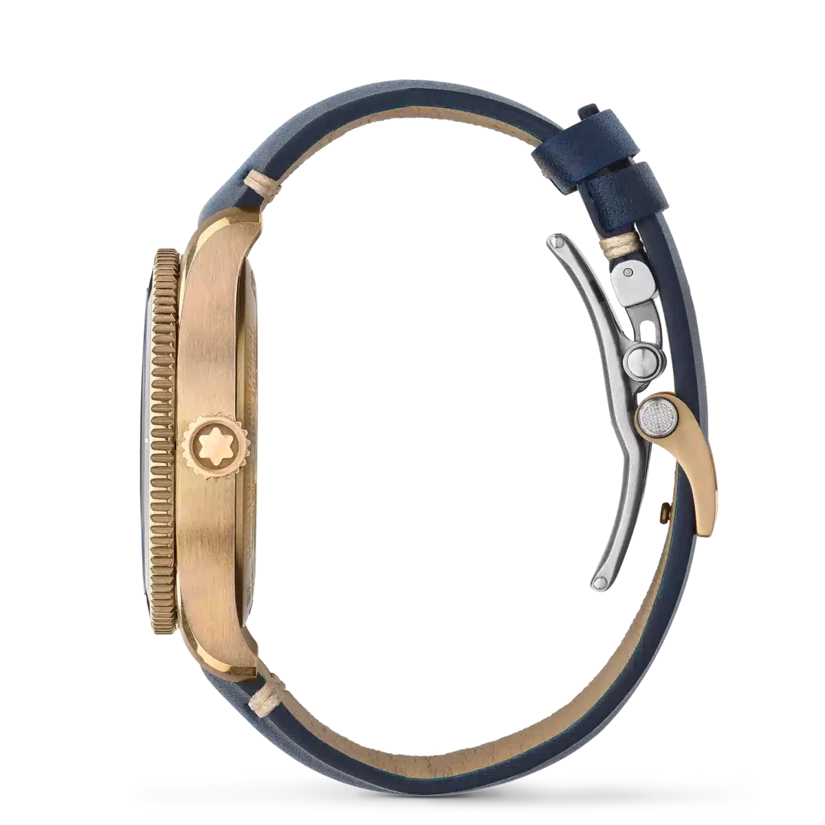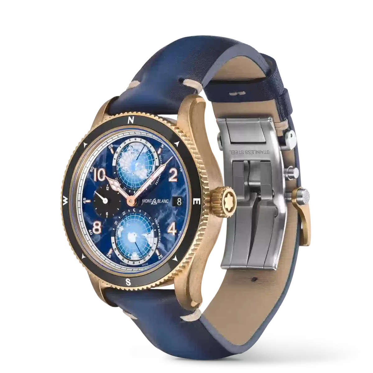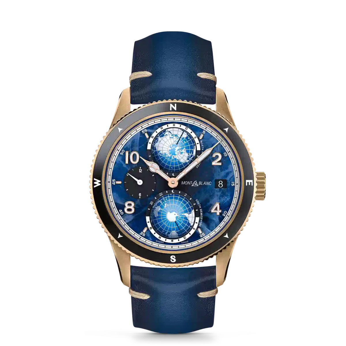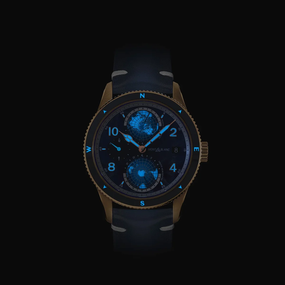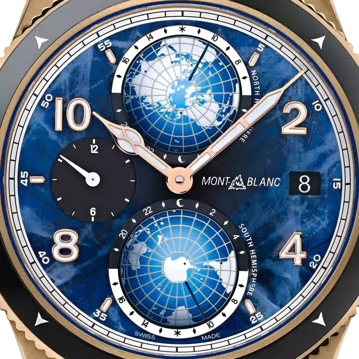 The Montblanc 1858 Geosphere 0 Oxygen Limited Edition is totally devoid of oxygen to improve the watch’s performance and precision over time, even in some of the harshest mountain environment. Zero oxygen inside the movement not only eliminates fogging, which can occur with drastic temperature changes at altitude, but also prevents oxidization. Without oxygen, all the components last far longer and will provide greater precision over time. The timepiece comes in a 42mm bronze case with a bi-directional knurled ceramic bezel with luminescent cardinal points and the Maison’s glacier pattern dial. The watch is powered by the MB 29.25 automatic movement with manufacture complication. Like with all 1858 Geosphere models, both the Northern and Southern hemispheres are represented with two three-dimensional globes and include a day & night indication so that the wearer can see what time it is across the Earth with a simple glance.