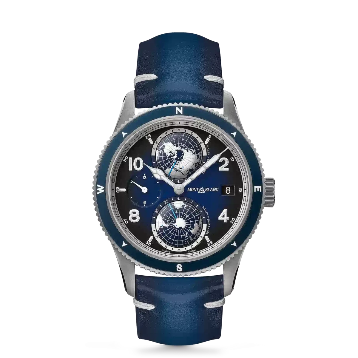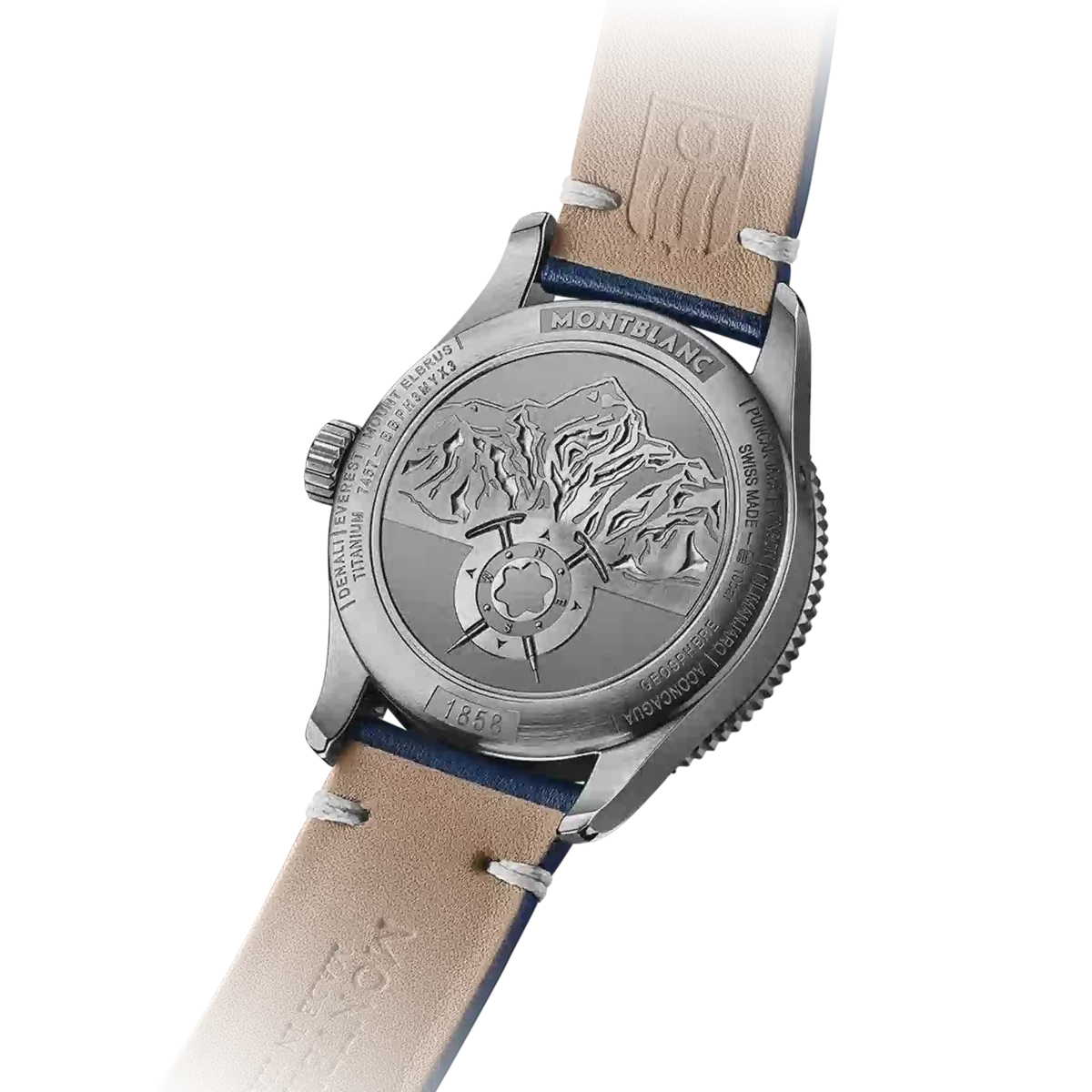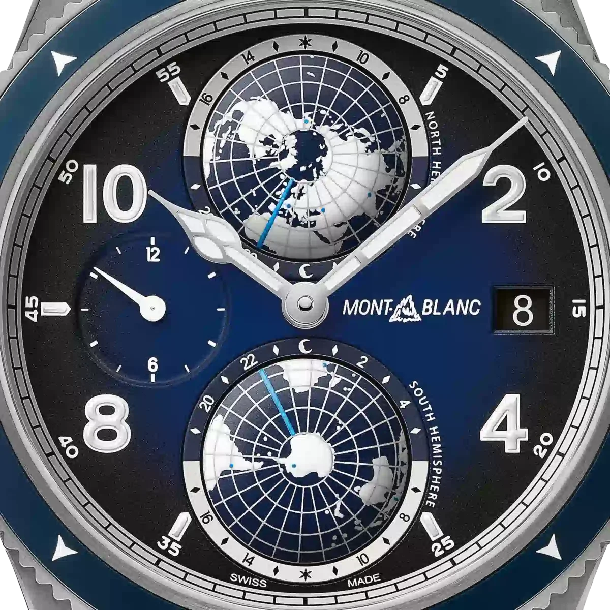 The Montblanc 1858 product line is inspired by the professional Minerva watches from the 1920s and 1930s, which were conceived for military use and exploration. Reinterpreting these legendary timepieces, the Montblanc 1858 product line expresses the spirit of mountain exploration, embodying the modern trend of returning to nature. The Montblanc 1858 Geosphere is dedicated to the world’s Seven Summit mountaineering challenge, the holy grail of mountaineering adventures. It comes in a 42 mm titanium case combined with blue and contrasting icy white design details, finding inspiration in the colors of glaciers. The timepiece features a manufacture worldtime complication developed by the Montblanc watchmakers in Villeret: two domed globes turning in opposite directions, which complete a full rotation in 24 hours. Both are surrounded by a scale with the 24 time zones, along with a day and night indication in contrasting colors. This provides an instinctive way of appreciating the different time zones, aided by SuperLumiNova® applied to the continents for increased visibility and performance at night. The timepiece is finished with a blue sfumato calfskin leather strap with white stitching.