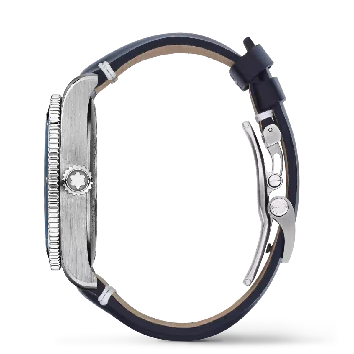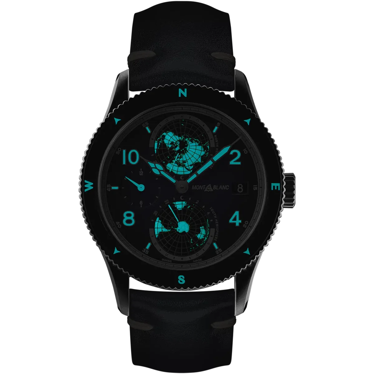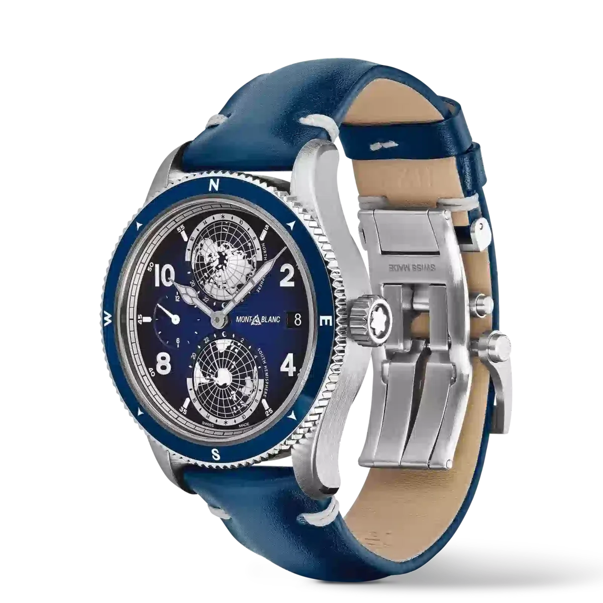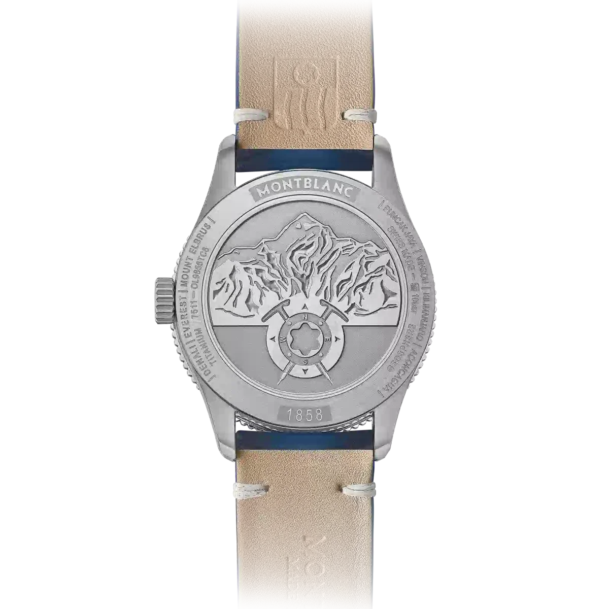 The Montblanc 1858 product line is inspired by the professional Minerva watches from the 1920s and 1930s, which were conceived for military use and exploration. Reinterpreting these legendary timepieces, the Montblanc 1858 product line expresses the spirit of mountain exploration, embodying the modern trend of returning to nature. The Montblanc 1858 Geosphere is dedicated to the world’s Seven Summit mountaineering challenge, the holy grail of mountaineering adventures. It comes in a 42 mm titanium case combined with blue and contrasting icy white design details, finding inspiration in the colors of glaciers. The timepiece features a manufacture worldtime complication developed by the Montblanc watchmakers in Villeret: two domed globes turning in opposite directions, which complete a full rotation in 24 hours. Both are surrounded by a scale with the 24 time zones, along with a day and night indication in contrasting colors. This provides an instinctive way of appreciating the different time zones, aided by SuperLumiNova® applied to the continents for increased visibility and performance at night. The timepiece is finished with a blue sfumato calfskin leather strap with white stitching.