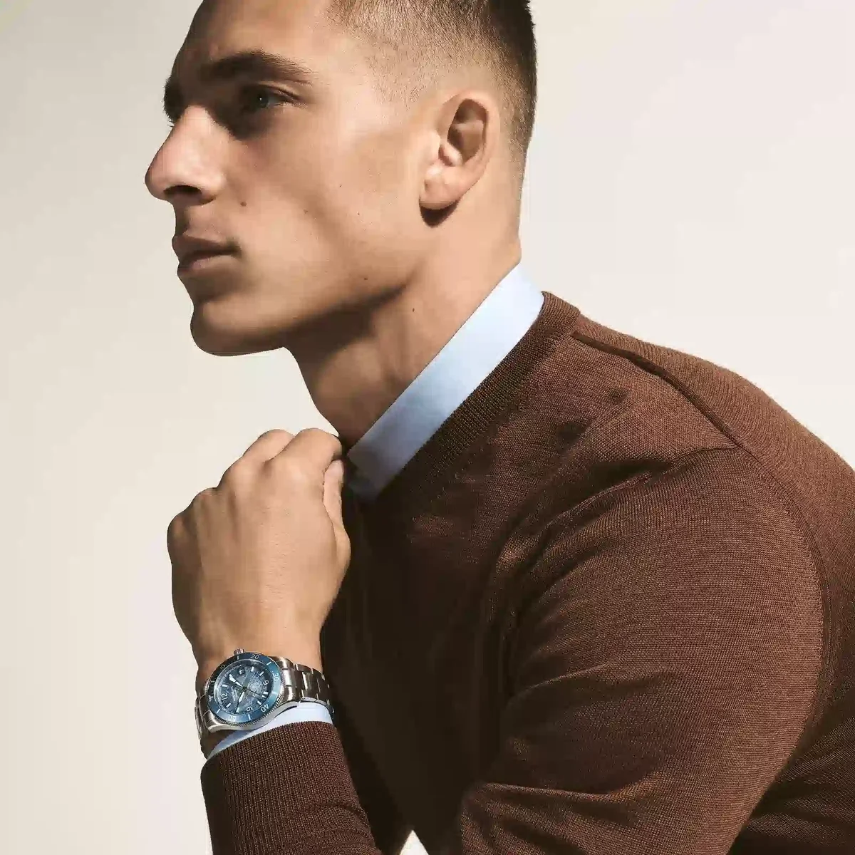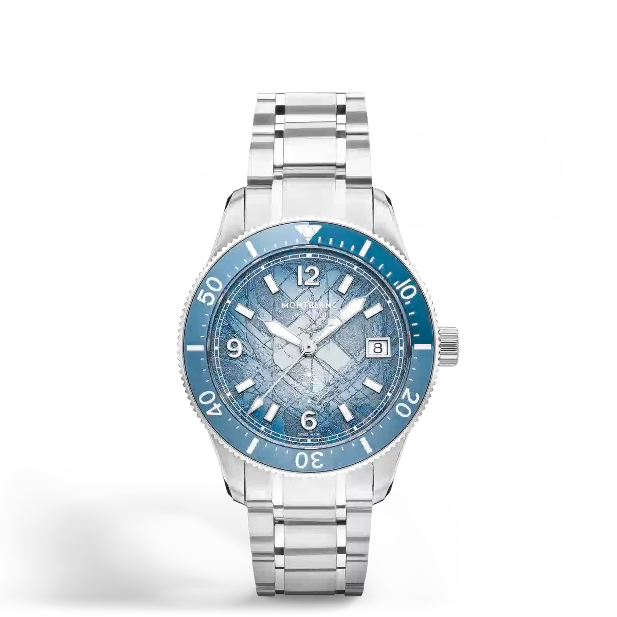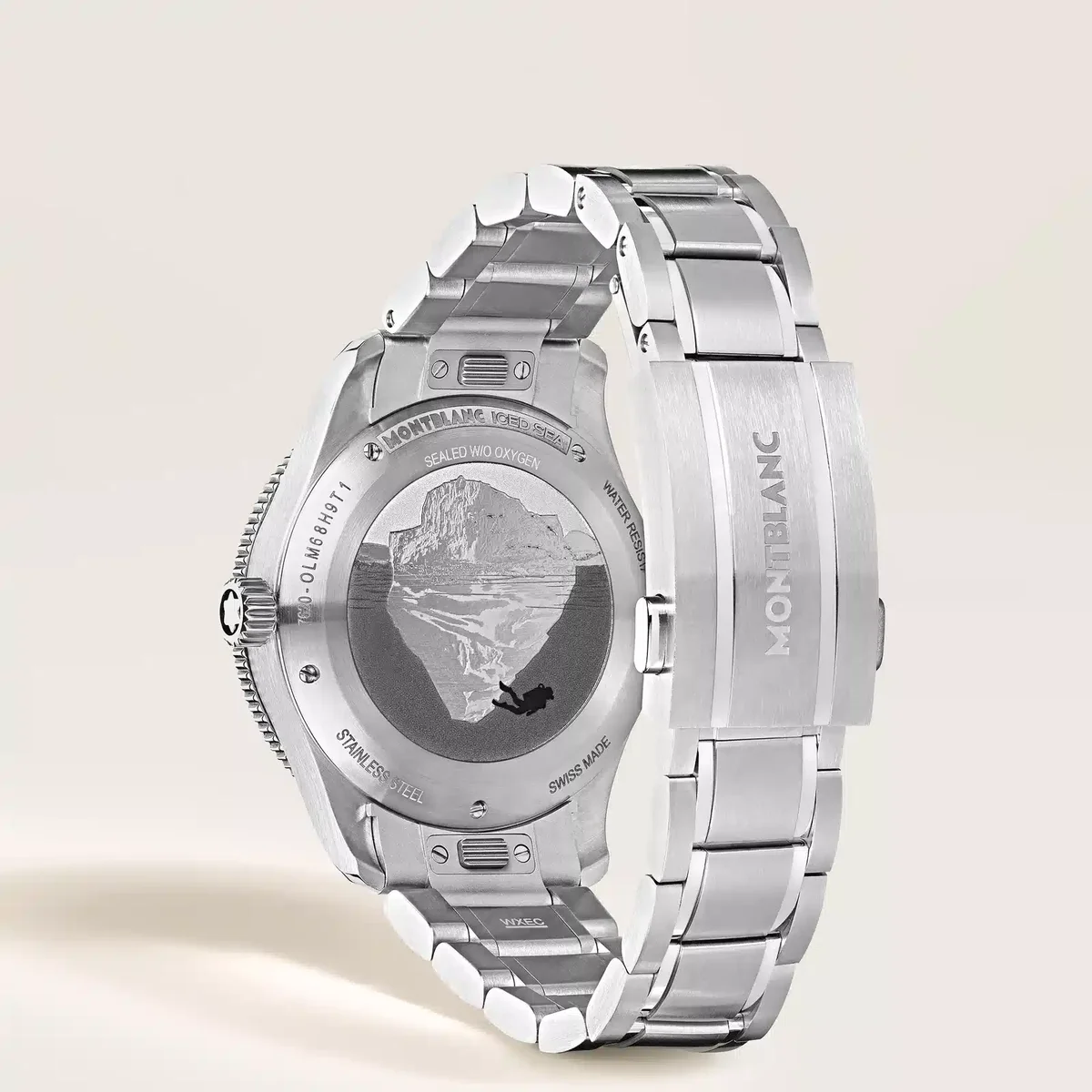 The Montblanc Iced Sea Automatic Date 0 Oxygen with blue sfumato glacier pattern dial gives the impression of looking into the depths of a glacier. Inspired by the Mer de Glace, this glacial texture was achieved using an almost-forgotten ancestral technique called gratté-boisé. The timepiece is housed in a 38 mm stainless steel case totally devoid of oxygen and comes with a unidirectional rotatable bezel with bi-colored blue anodized aluminium insert, a 3D engraving on the case back, and an interchangeable stainless steel bracelet with fine adjustment system. The timepiece conforms to the ISO 6425 norm for scuba diving and comes with a water resistance of 300 meters.